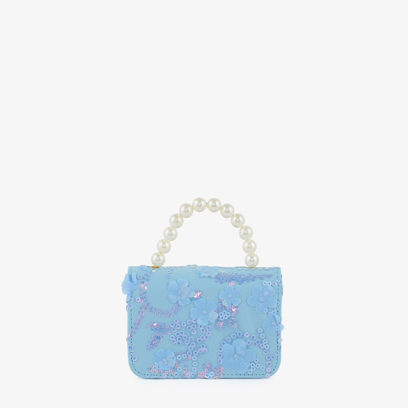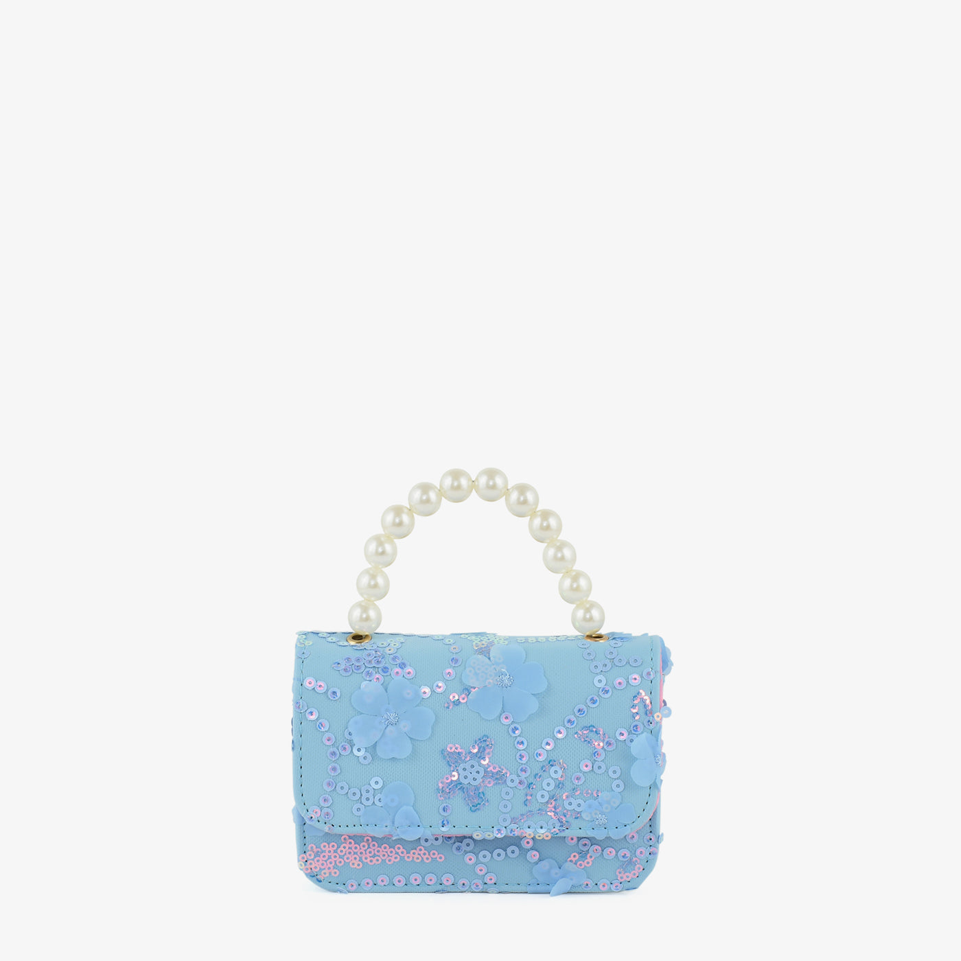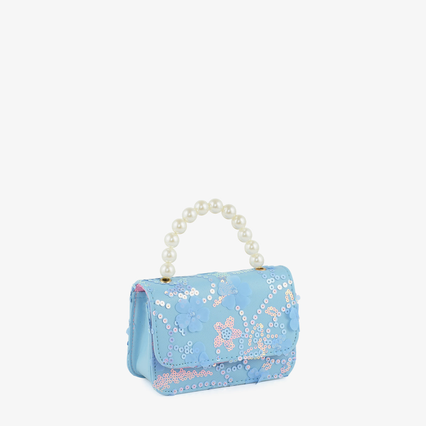 A delicate mini handbag featuring detailed sequin work and soft floral appliqué designs. Its pearl handle enhances its whimsical charm, making it perfect for festive gatherings. Compact yet statement-worthy, it adds sparkle to any outfit.