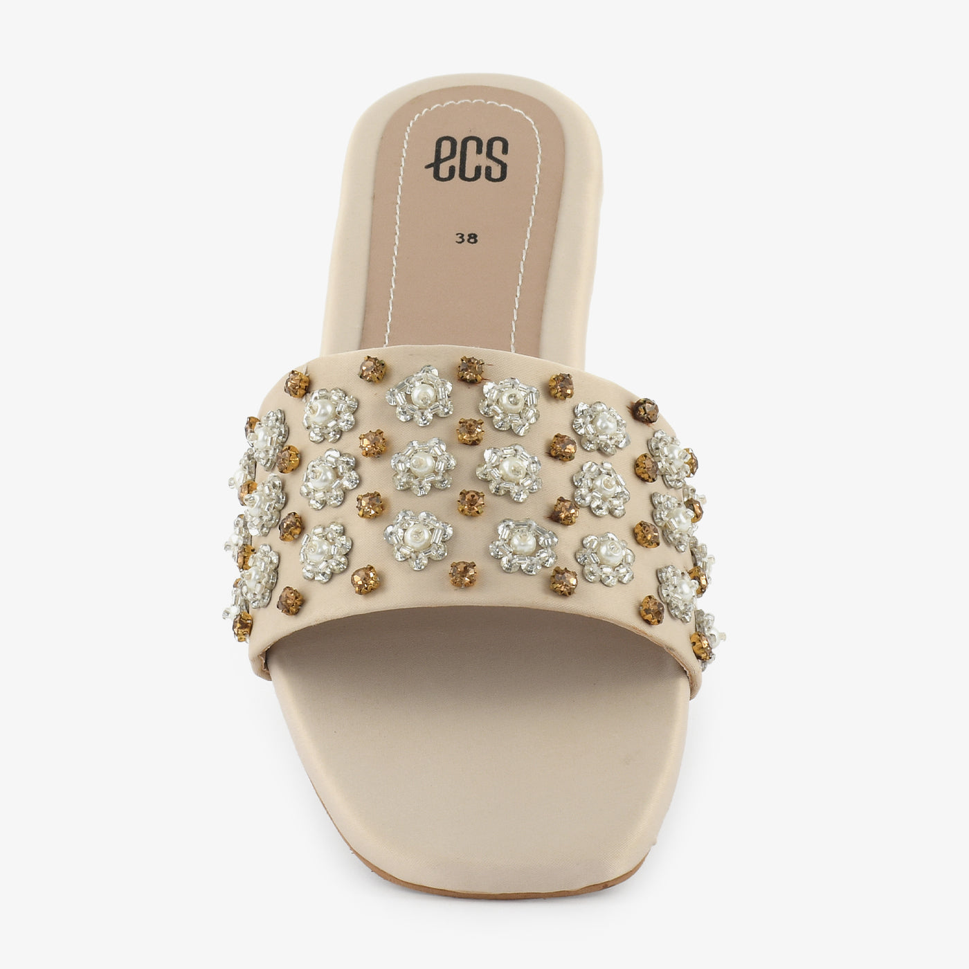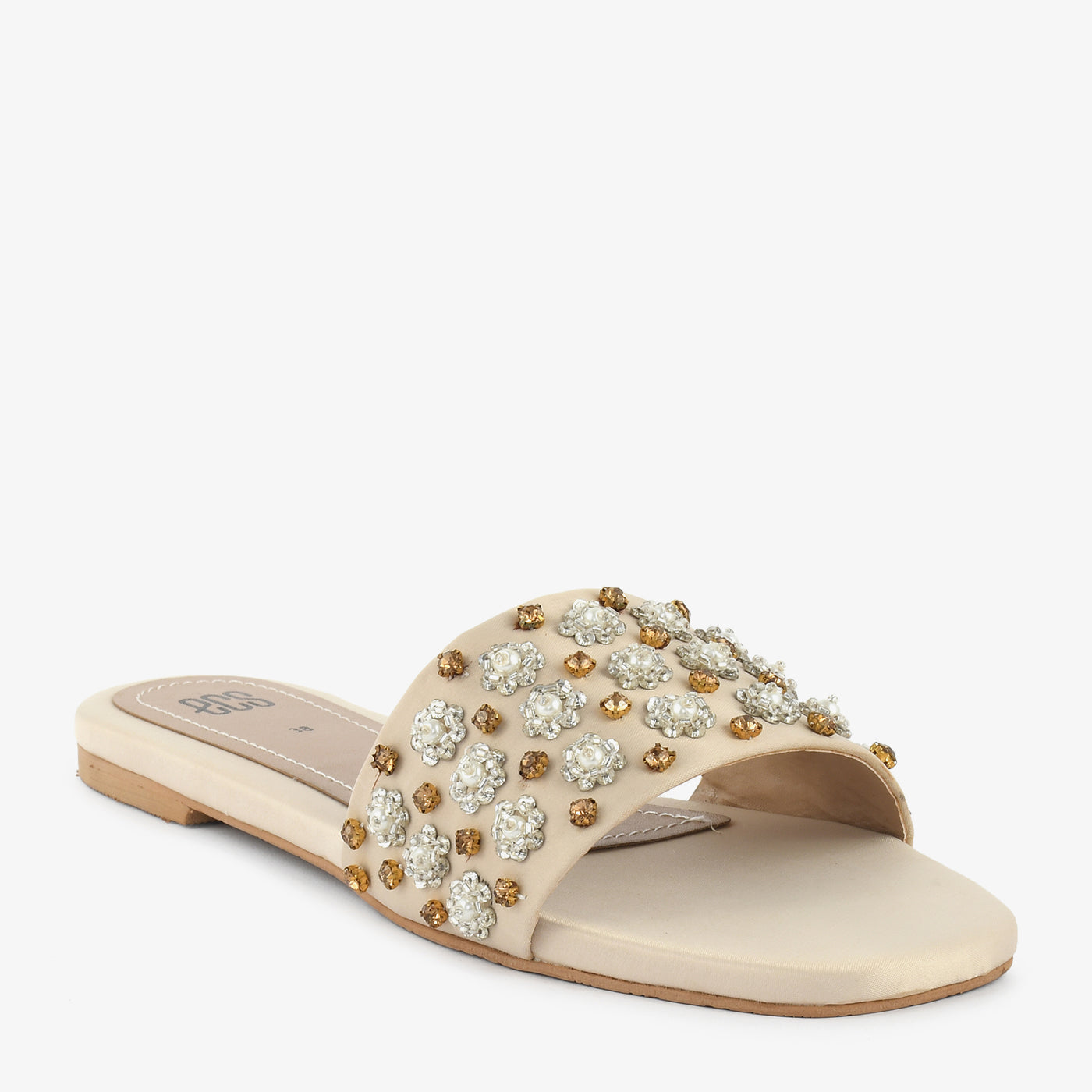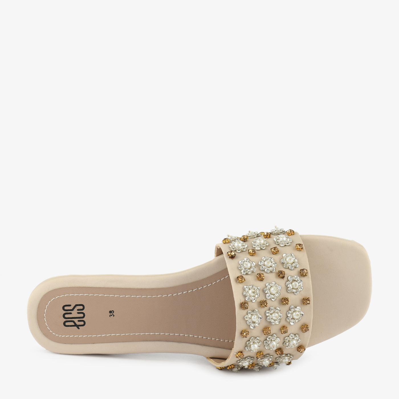 A feminine slipper crafted with embellished straps featuring clustered stones. Ideal for festive or semi-formal occasions.