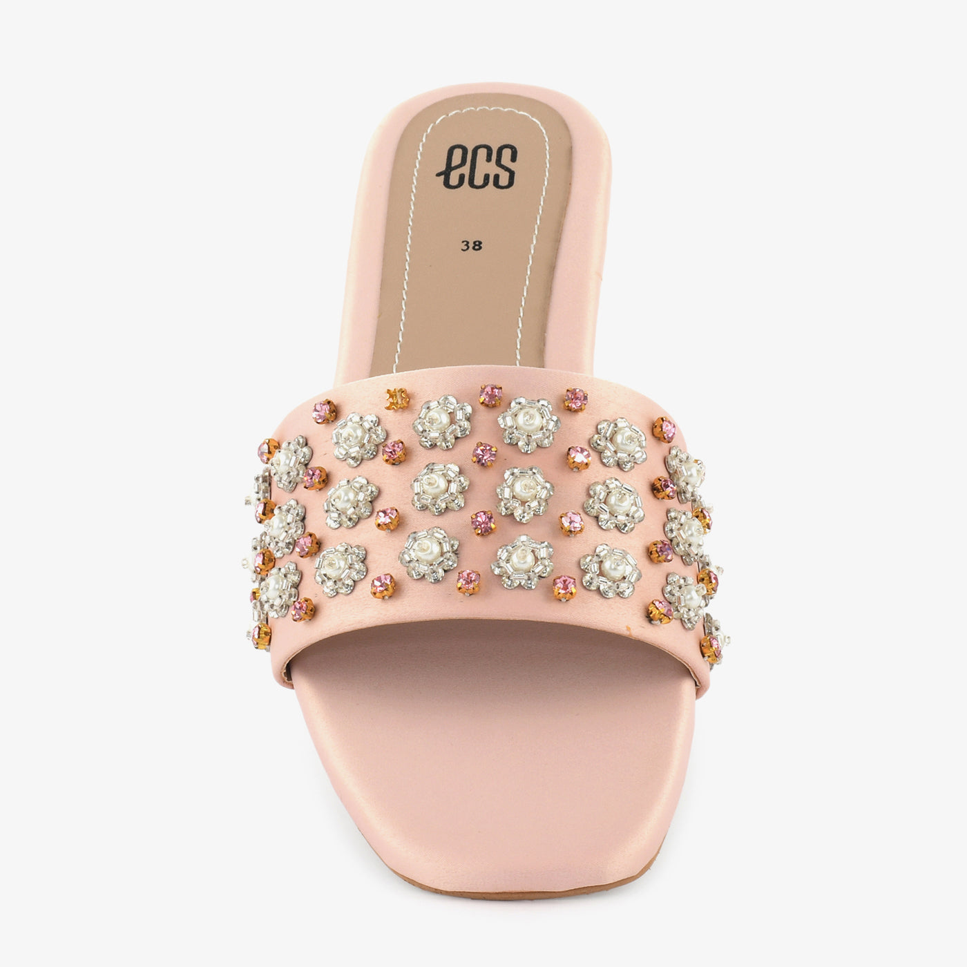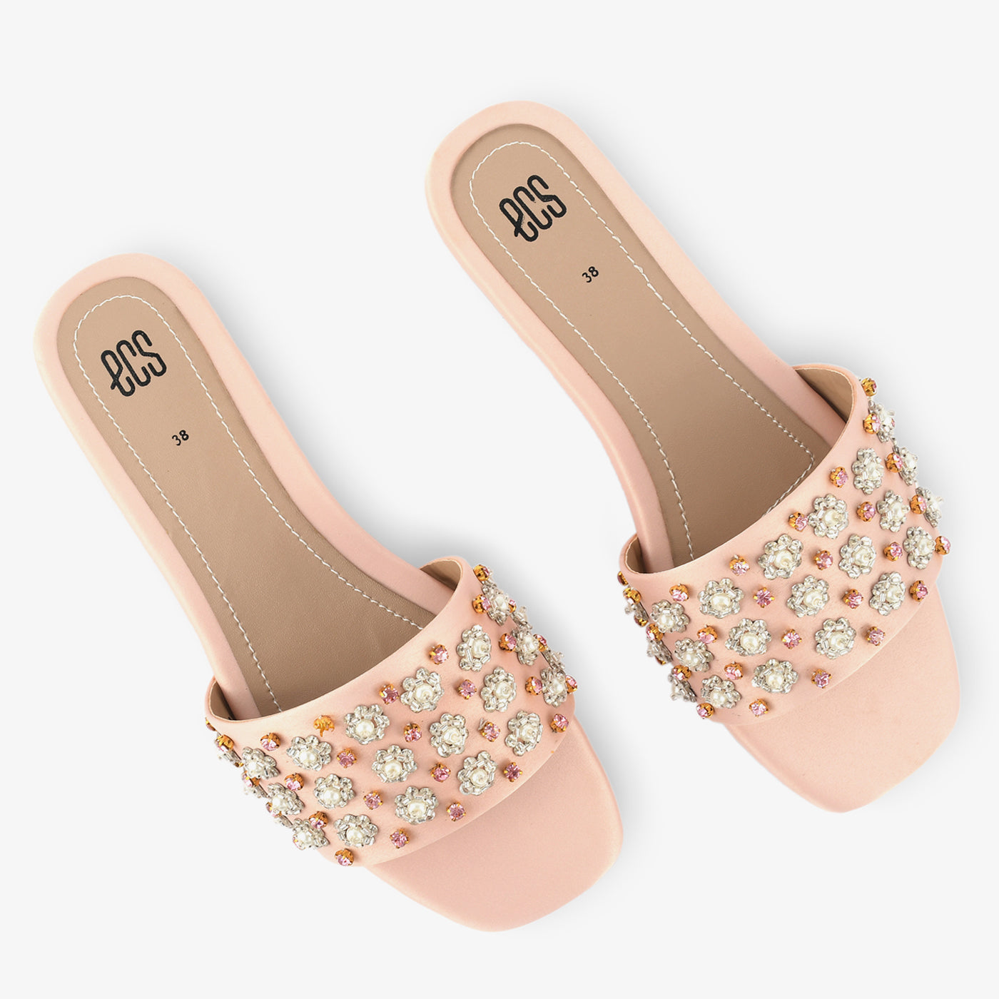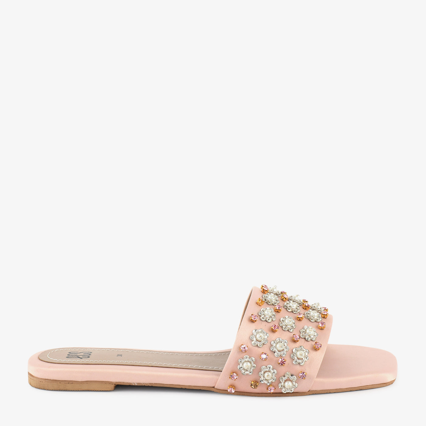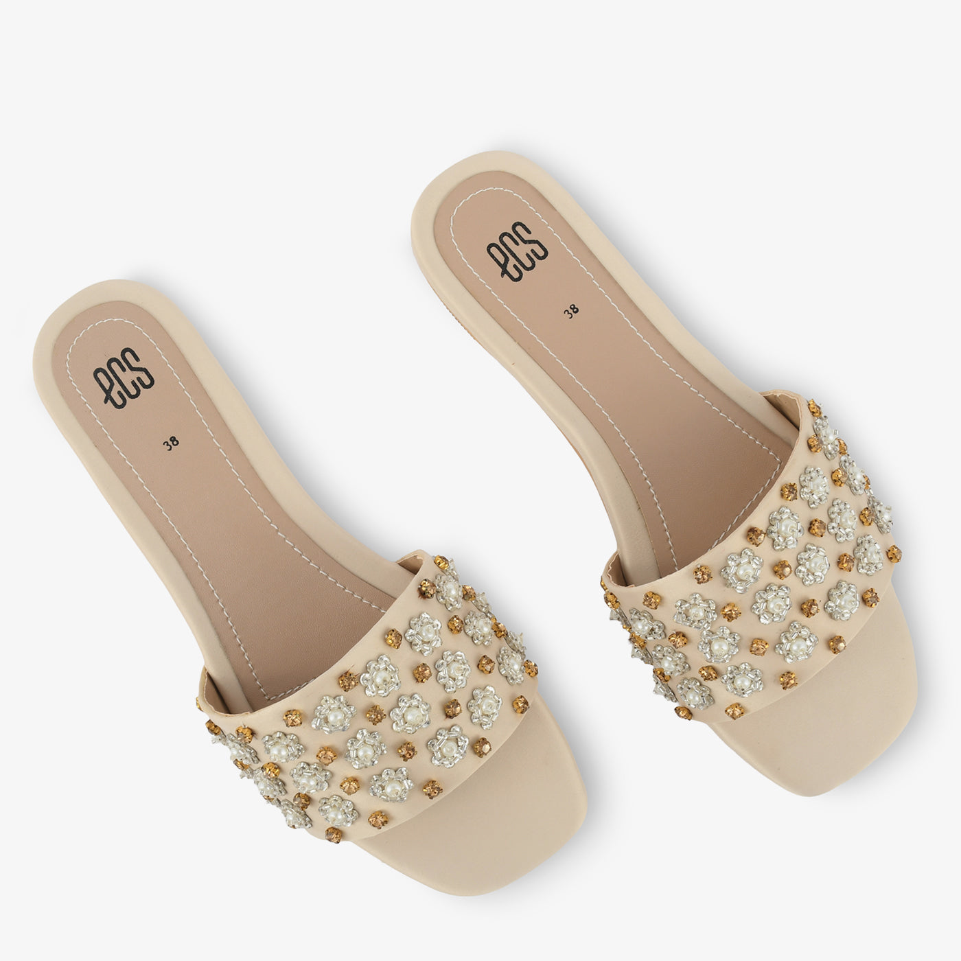 A feminine slipper crafted with embellished straps featuring clustered stones. Ideal for festive or semi-formal occasions.