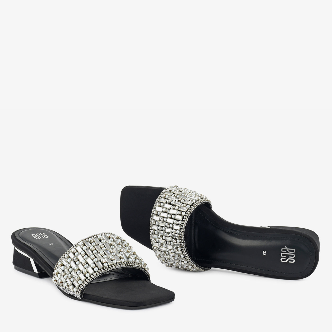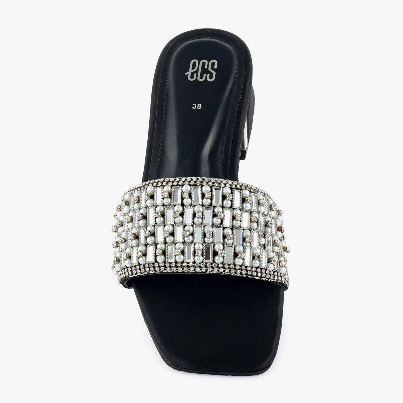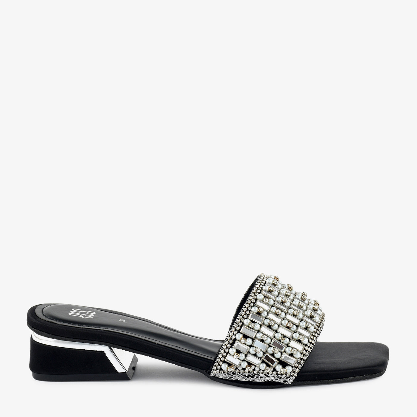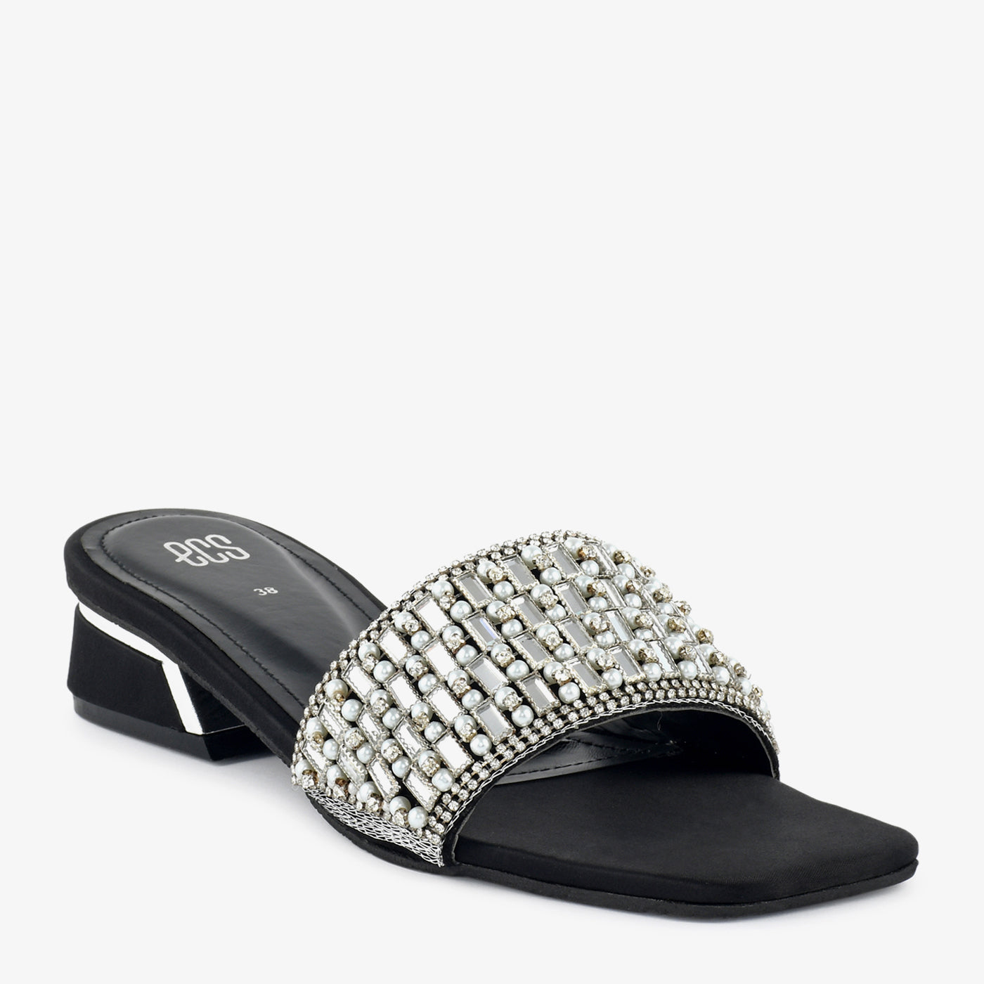 An elegant slipper decorated with pearls and beads for a luxe touch. Designed with a comfortable block heel for all-day wear.