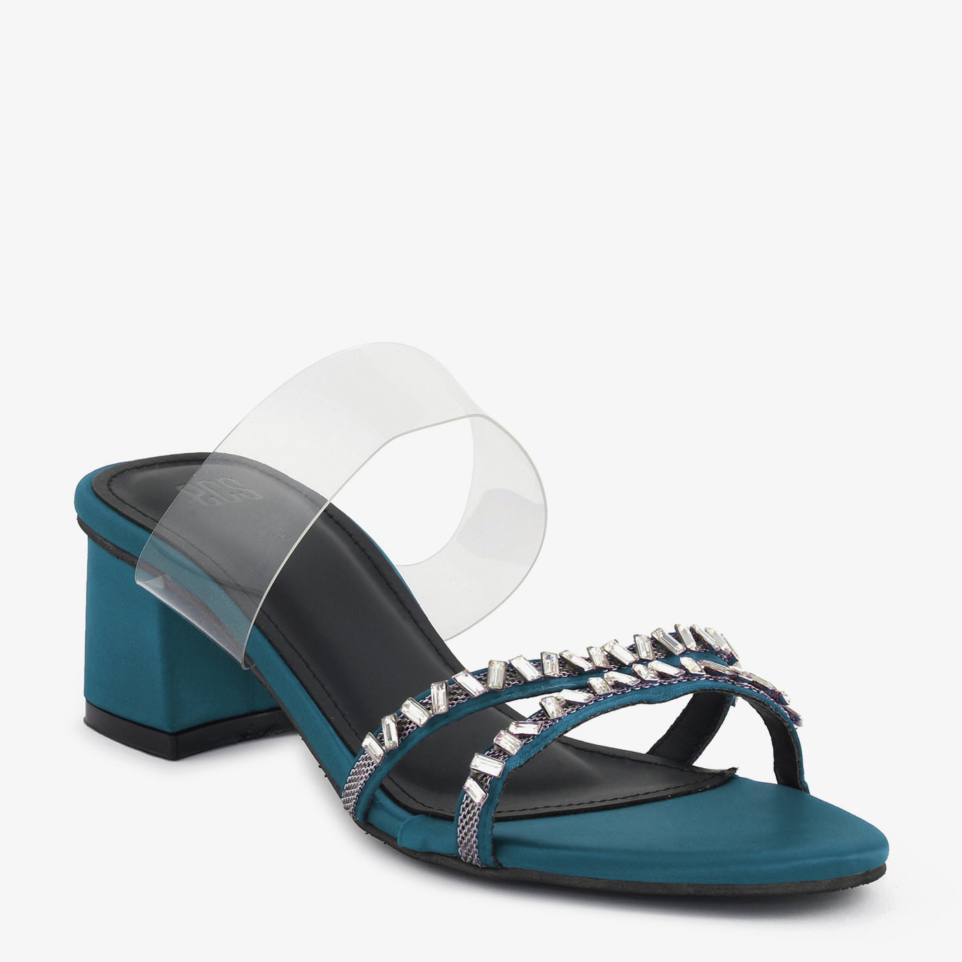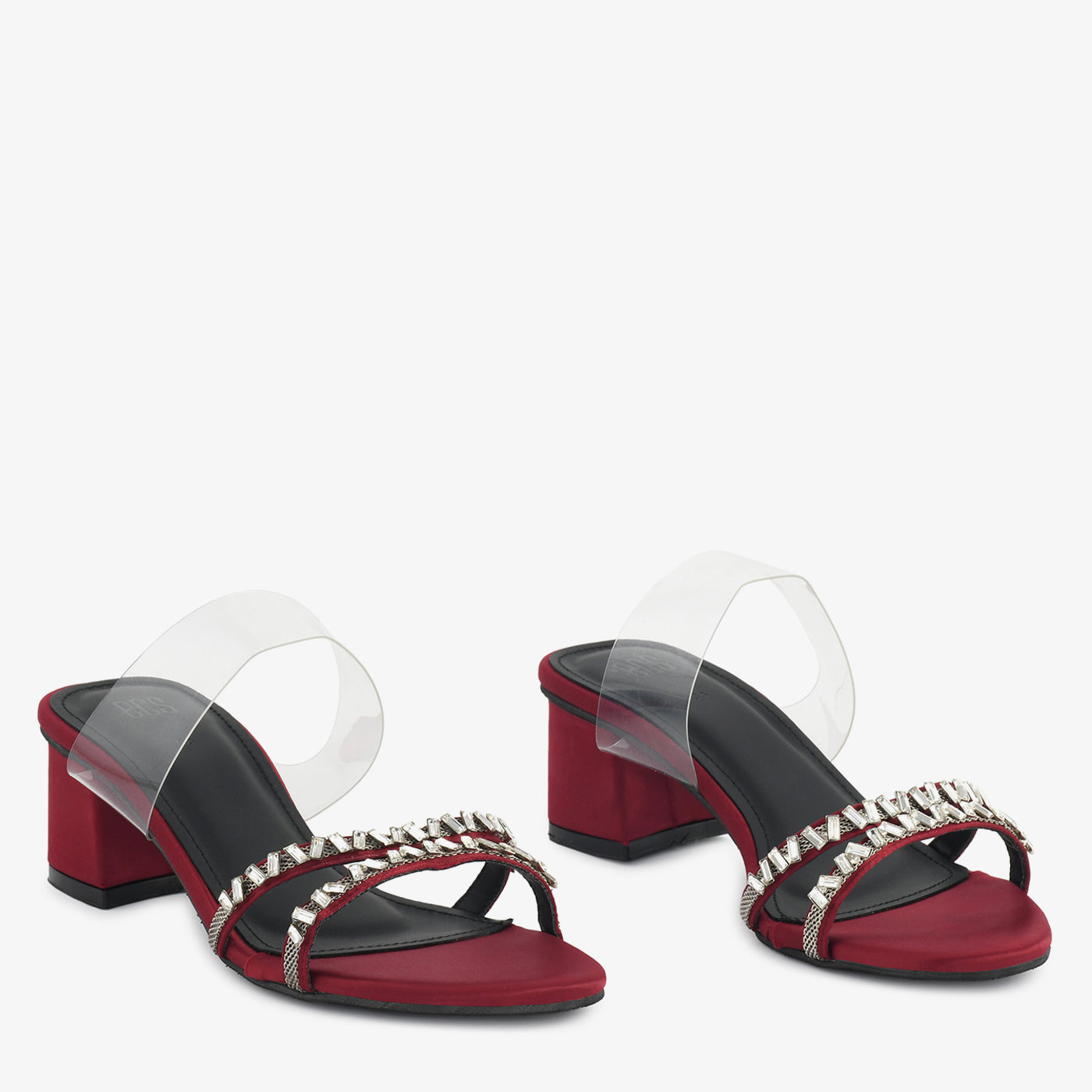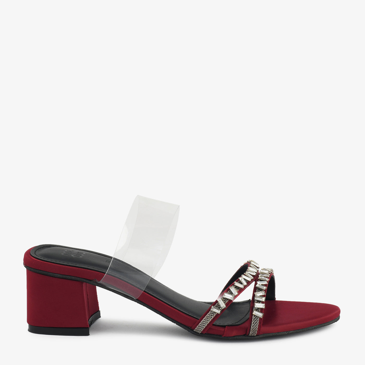 This sandal stands out with a clear strap and crystal-studded detailing, blending modern minimalism with chic allure. The block heel ensures both confidence and comfort.