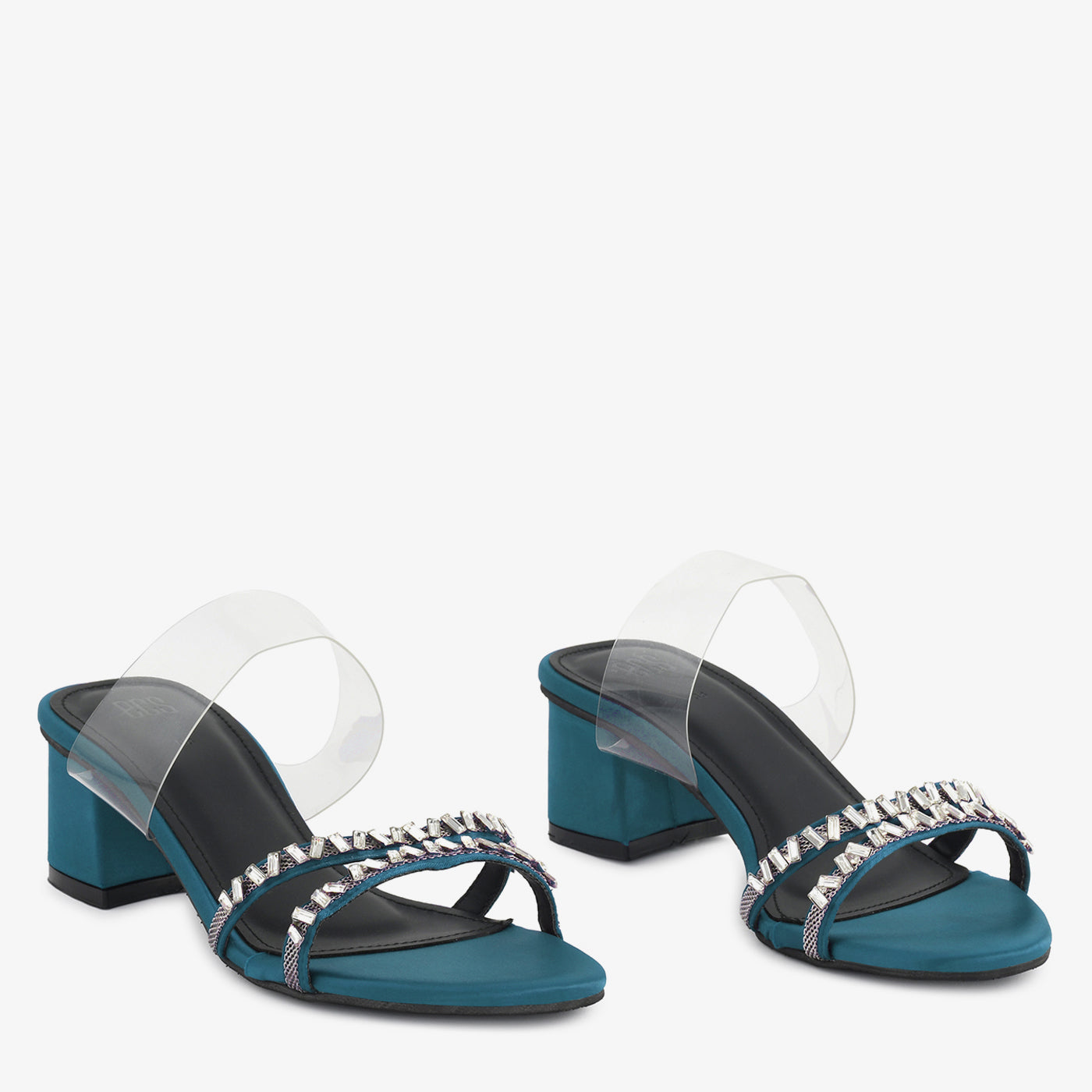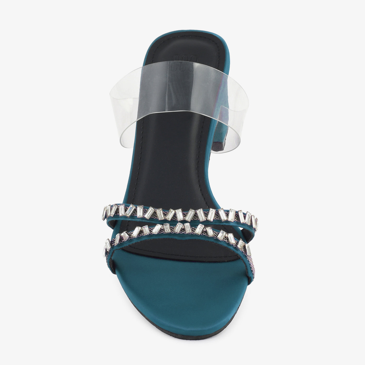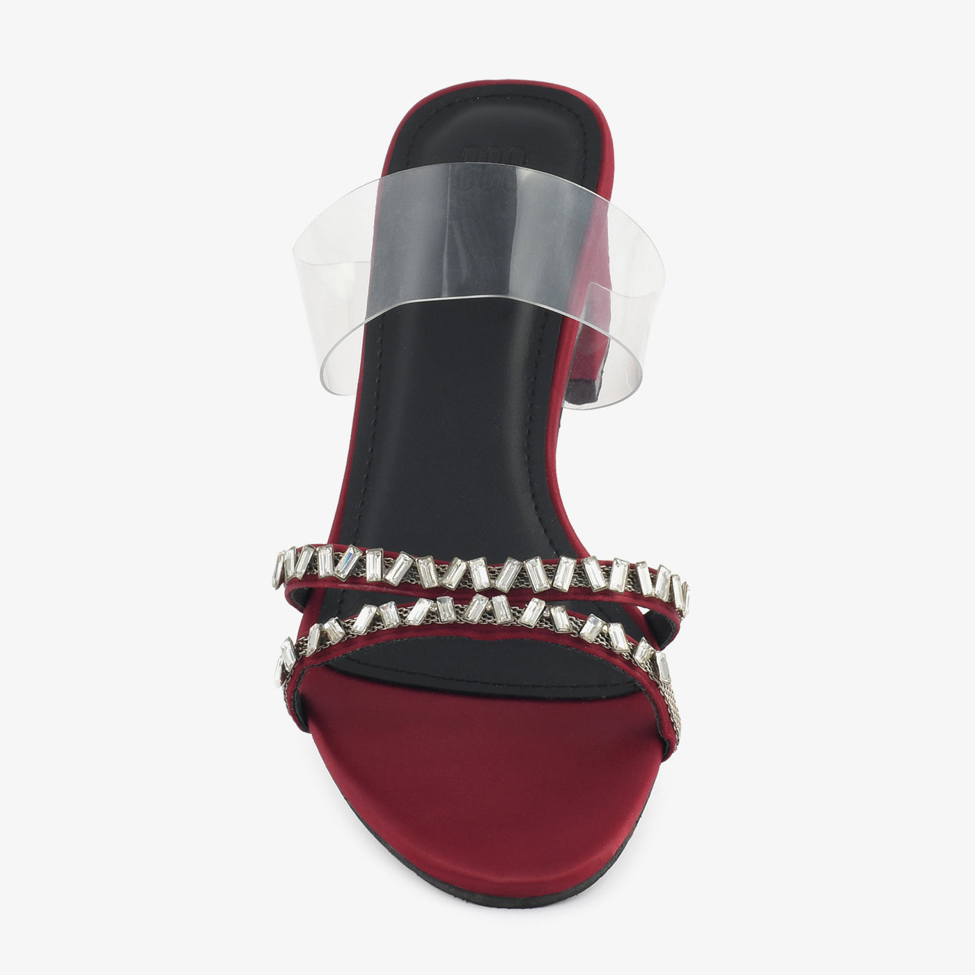 This sandal stands out with a clear strap and crystal-studded detailing, blending modern minimalism with chic allure. The block heel ensures both confidence and comfort.