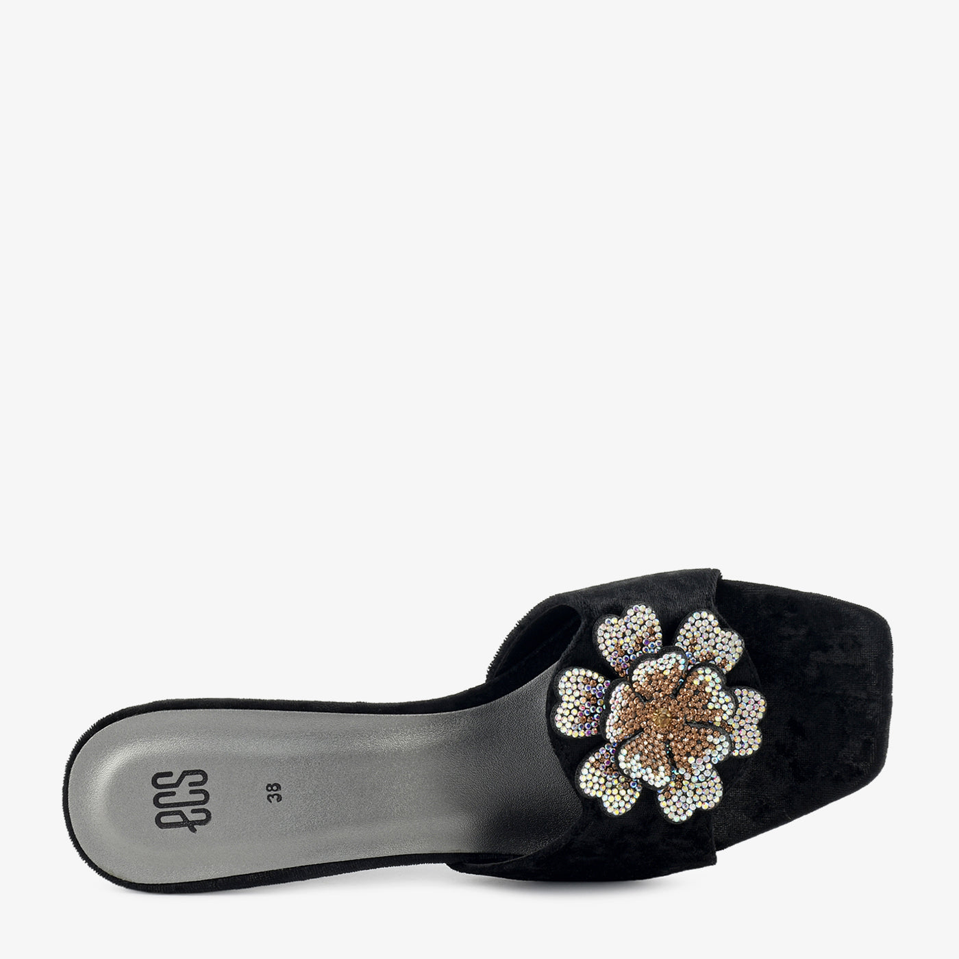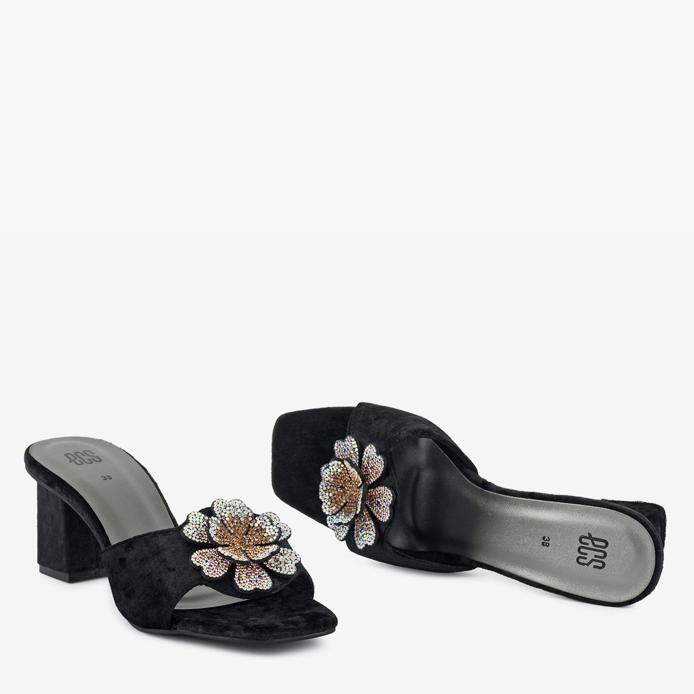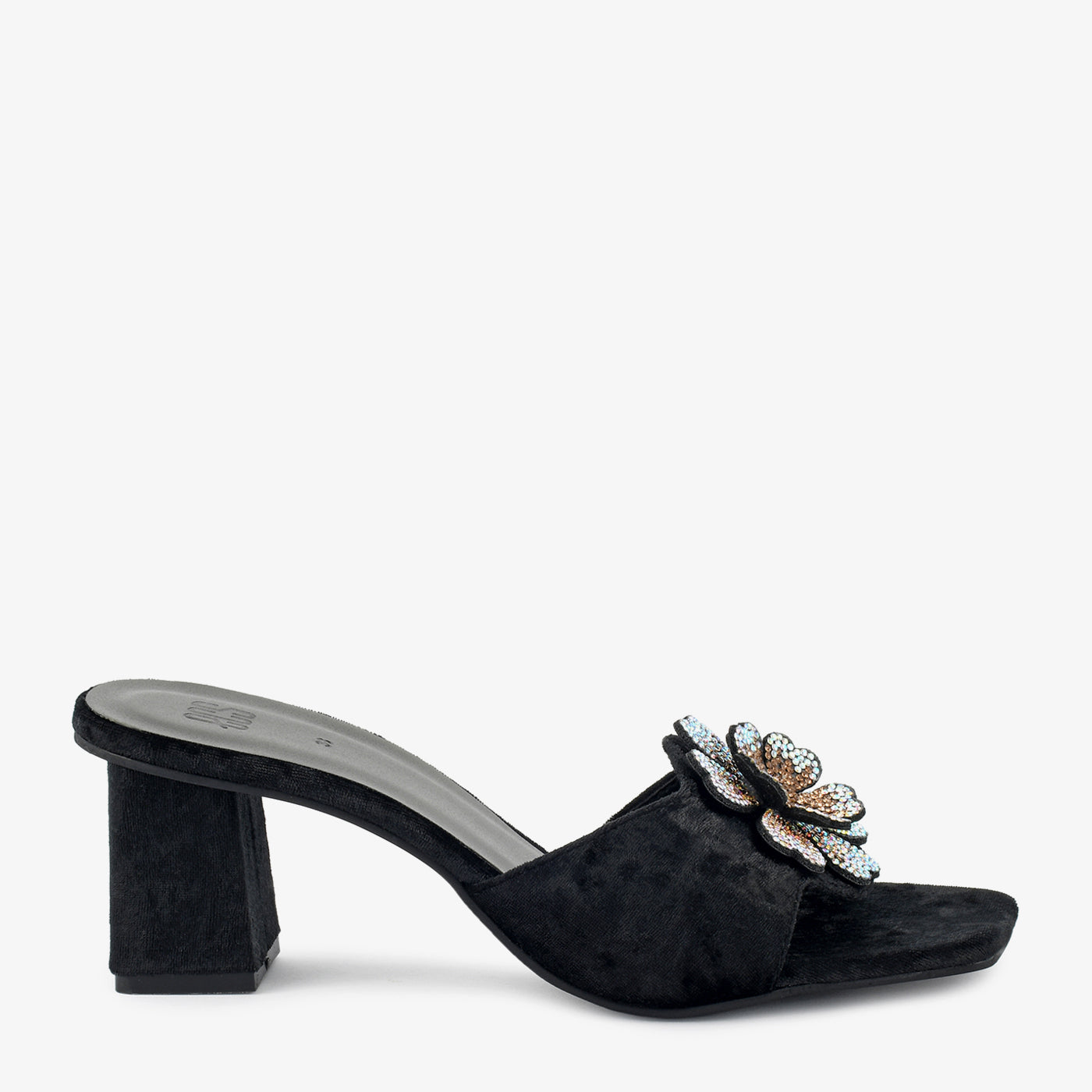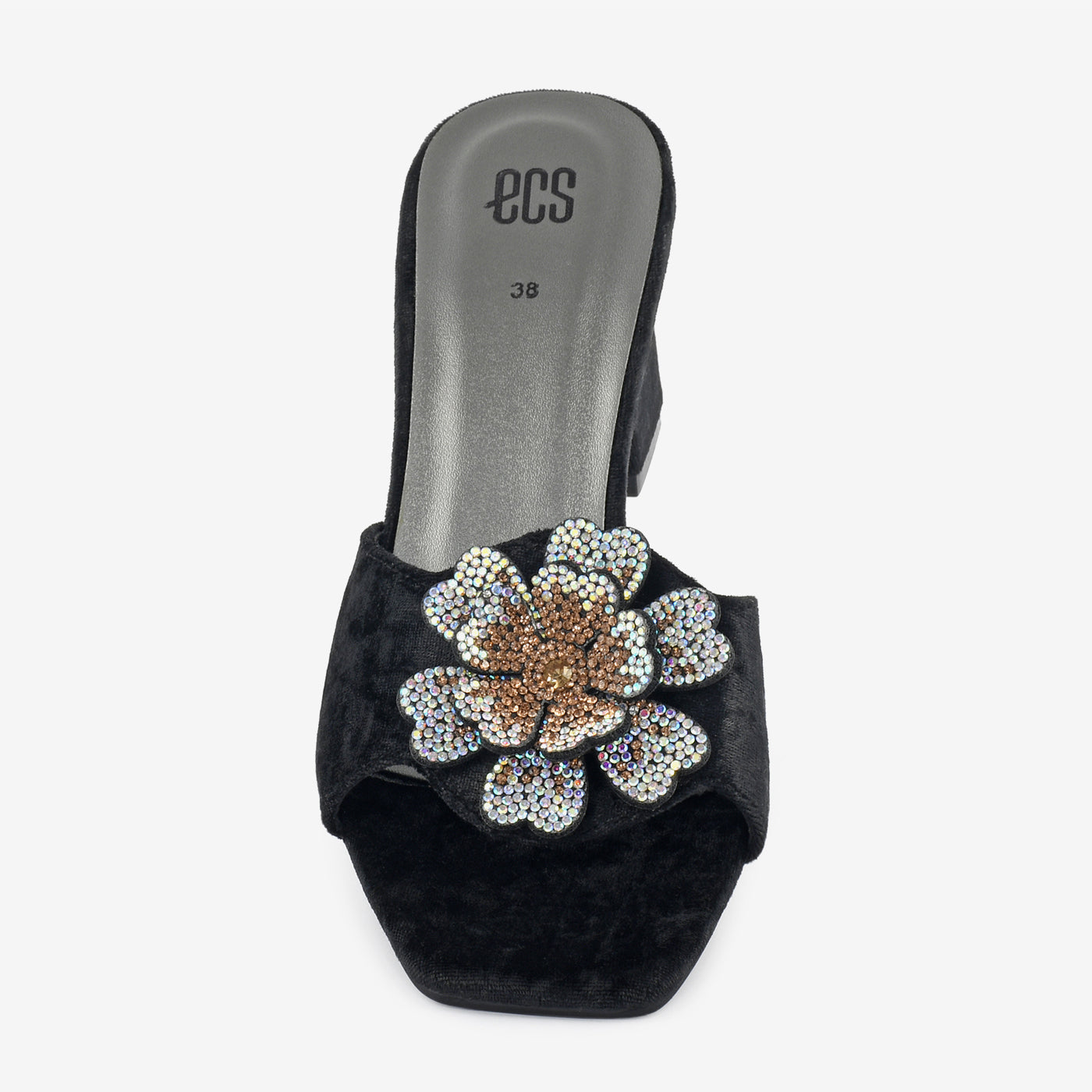 Crafted in plush velvet with a dazzling floral crystal motif, this sandal is the epitome of evening sophistication. Its block heel offers height with lasting comfort.