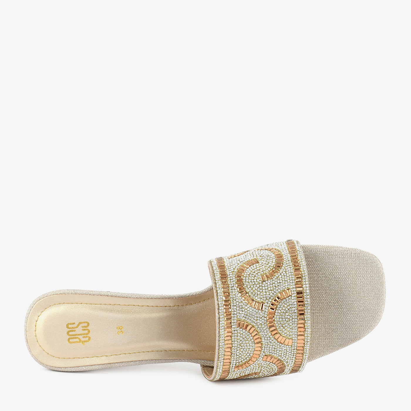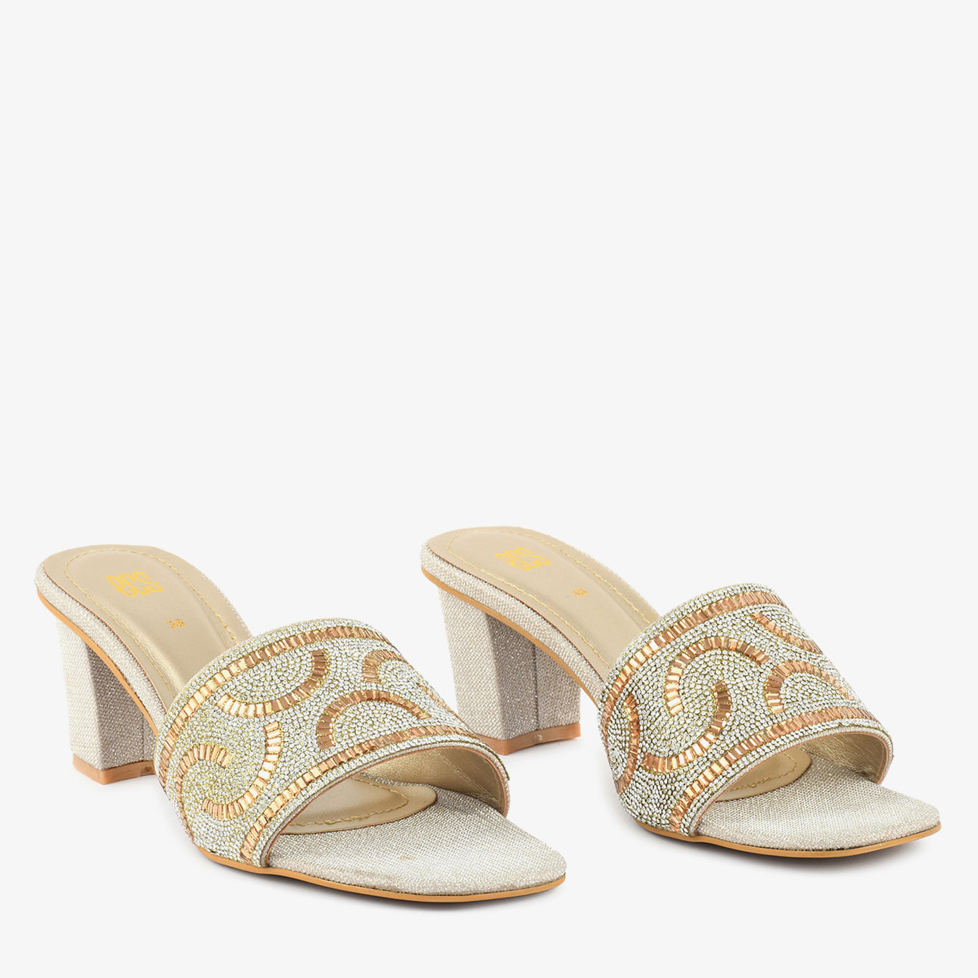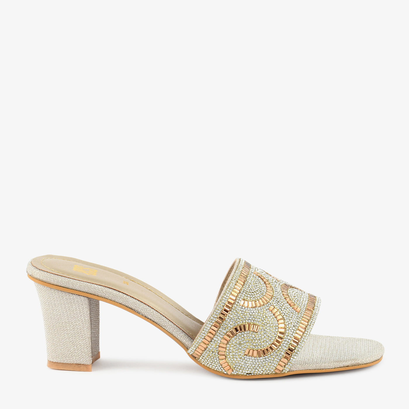 An embellished heel with intricate beadwork on wide straps, blending comfort with festive glamour. Its bold detailing brings a unique edge to traditional and modern looks alike.