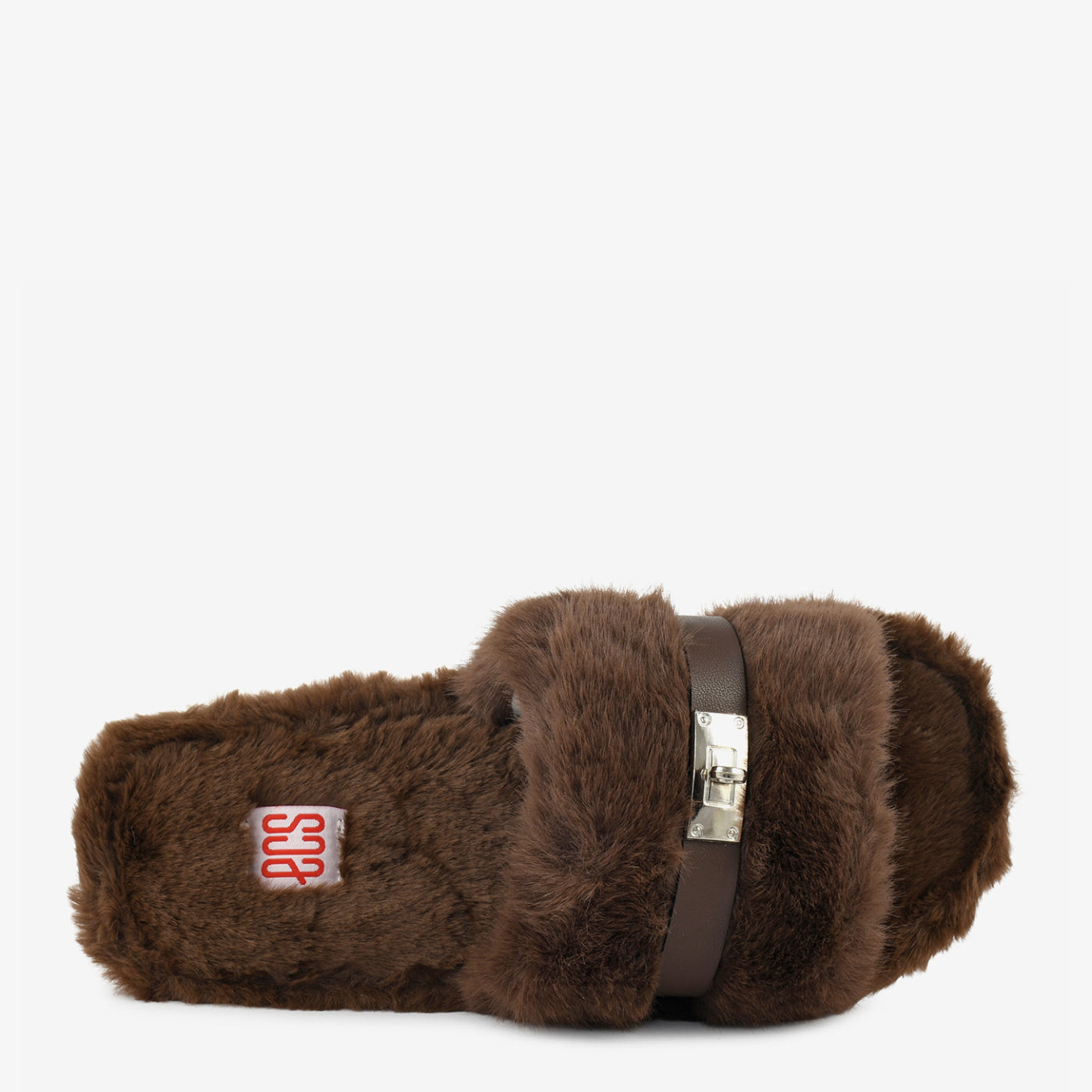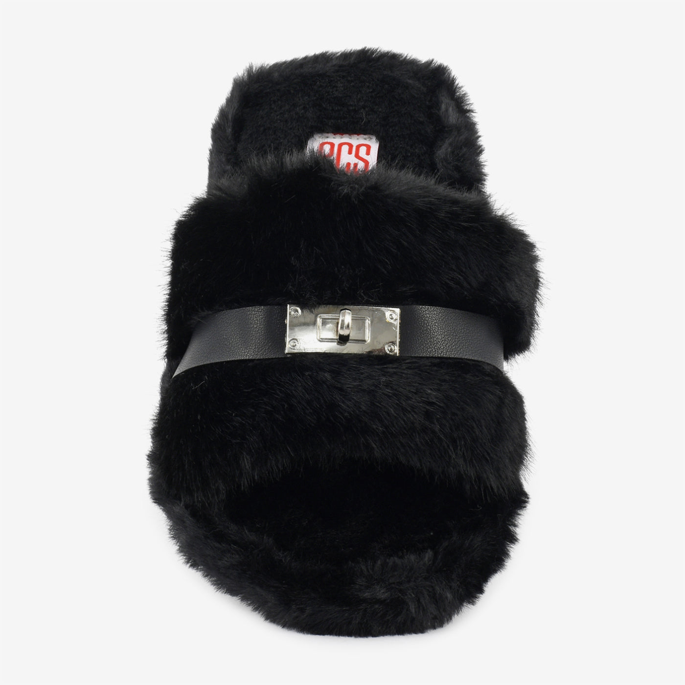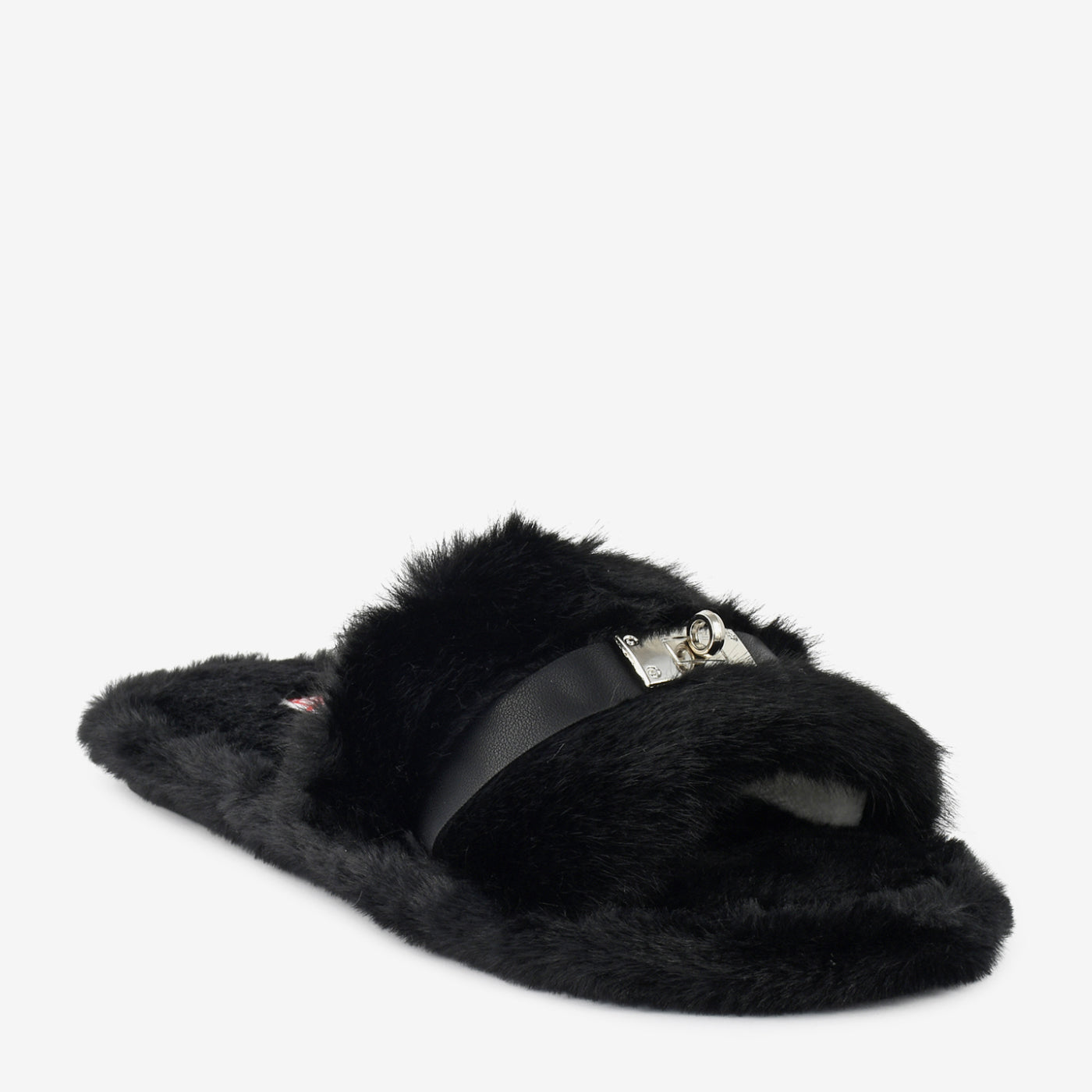 - Design: Plush winter slide with buckle accent