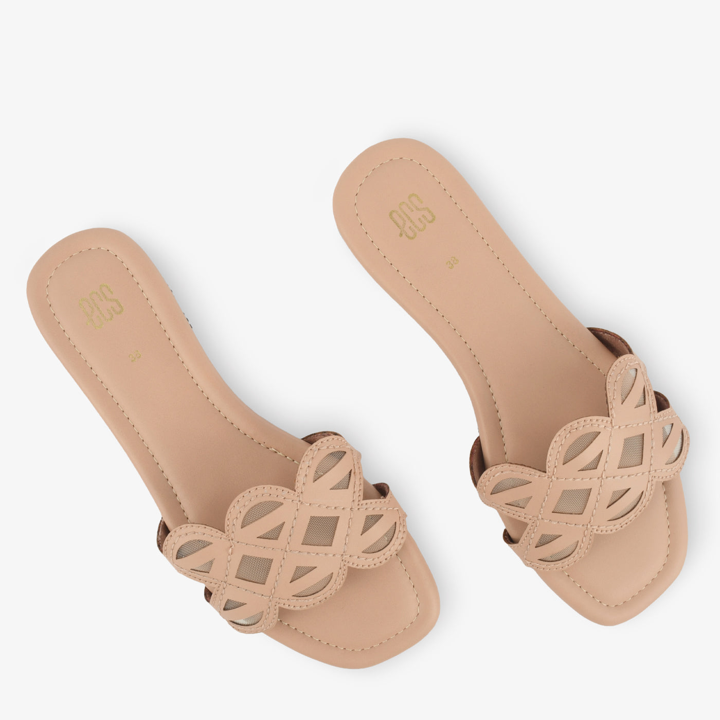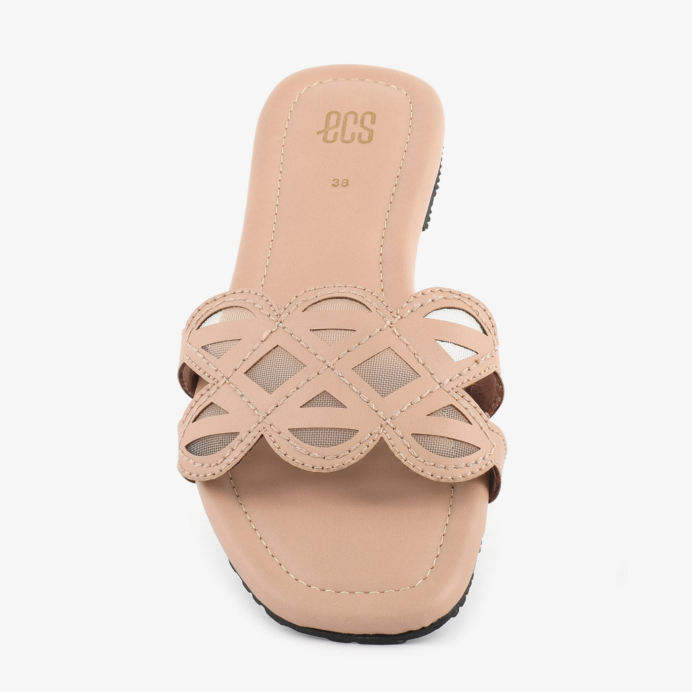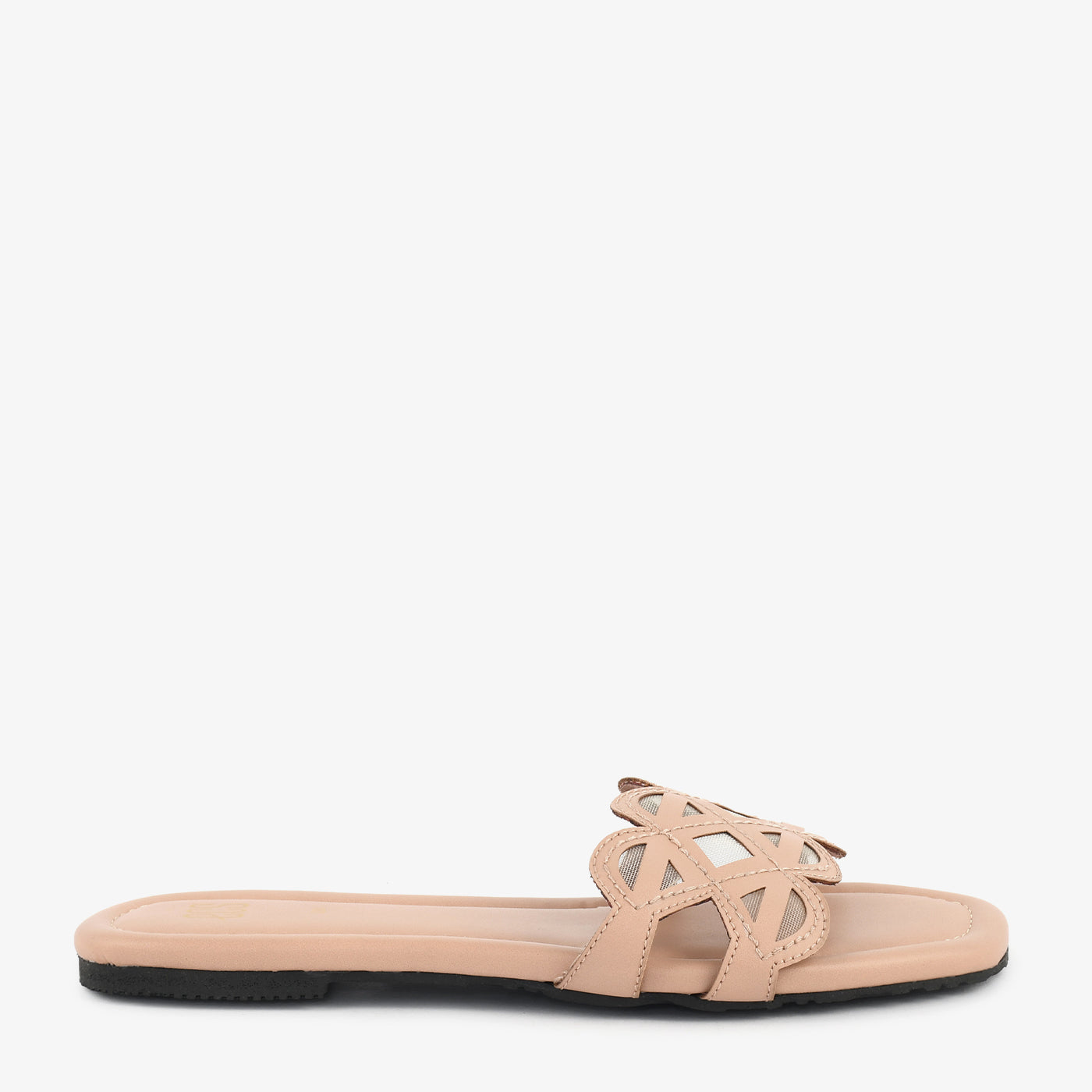 This slipper features a beautifully cut-out upper inspired by floral shapes, giving it a light and airy appearance. The structured strap design provides a comfortable and secure fit, while the soft cushioned footbed ensures ease during daily wear. Its slip-on style makes it convenient and versatile for everyday use. The flat sole offers stability and smooth movement, making it a practical yet stylish choice.