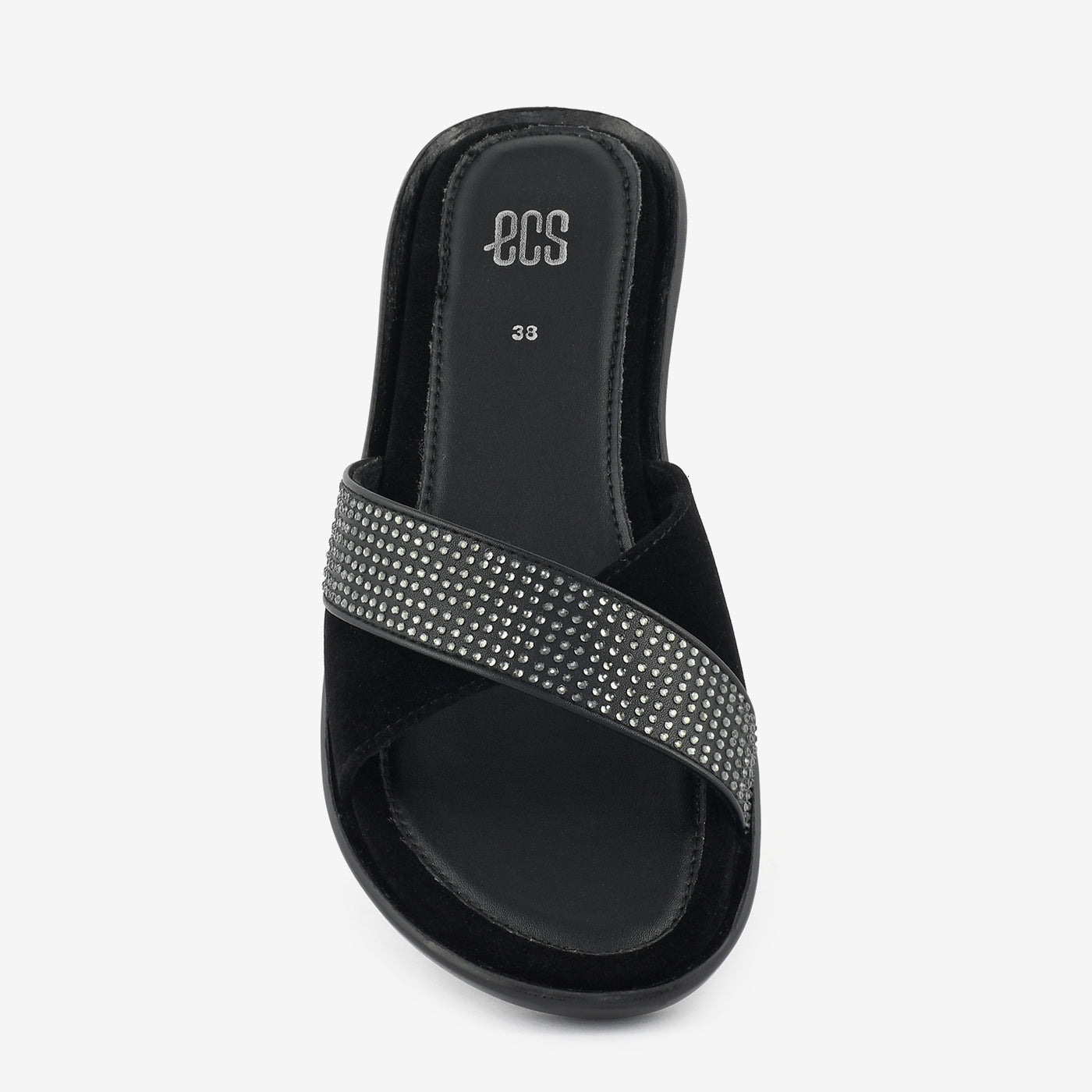 This slipper features a sleek upper adorned with fine stud detailing that creates a subtle yet eye-catching shine. The wide strap provides a comfortable and secure fit, while the soft cushioned footbed supports ease throughout the day. Designed with a slight elevated sole, it offers added comfort and a gentle lift for everyday wear. Its slip-on style ensures quick and effortless use, making it perfect for daily routines. The smooth sole enhances stability, making it suitable for both indoor and outdoor settings. A refined choice that blends simplicity with a touch of shine for a polished look.