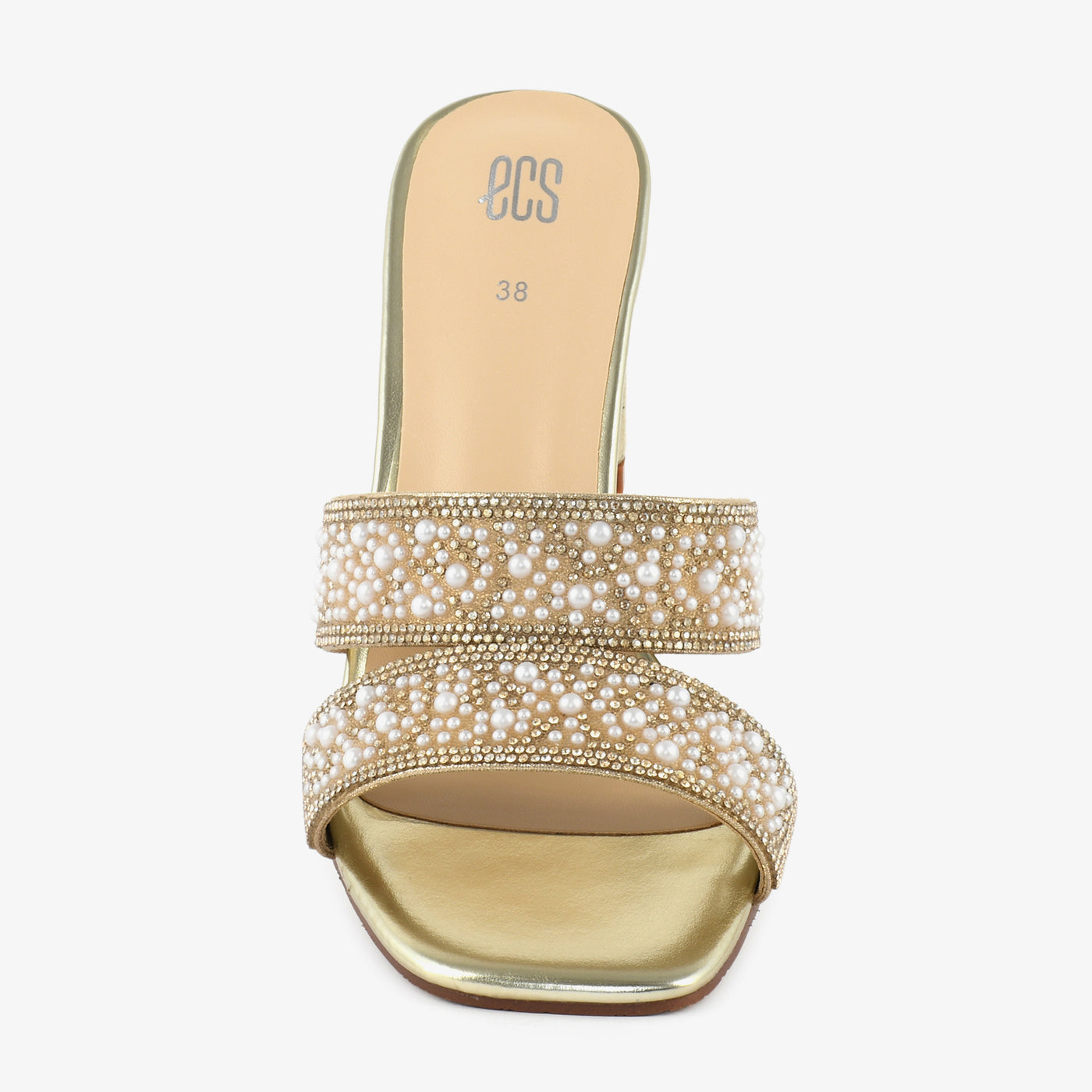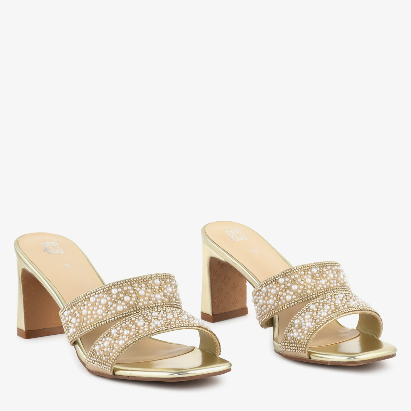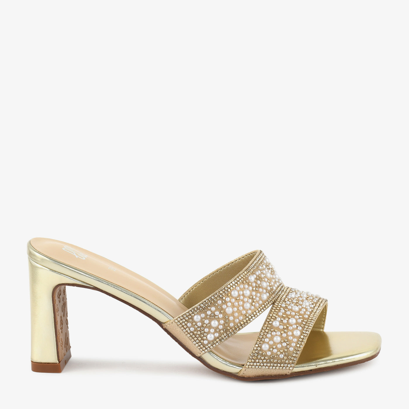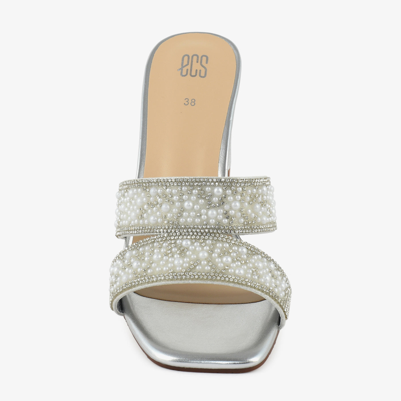 An elegant slide that sparkles with every step. Decorated with clustered pearls and crystals, it exudes understated luxury. The double-strap design offers balance and ease, making it ideal for dressy occasions.