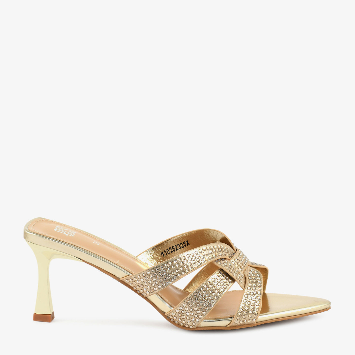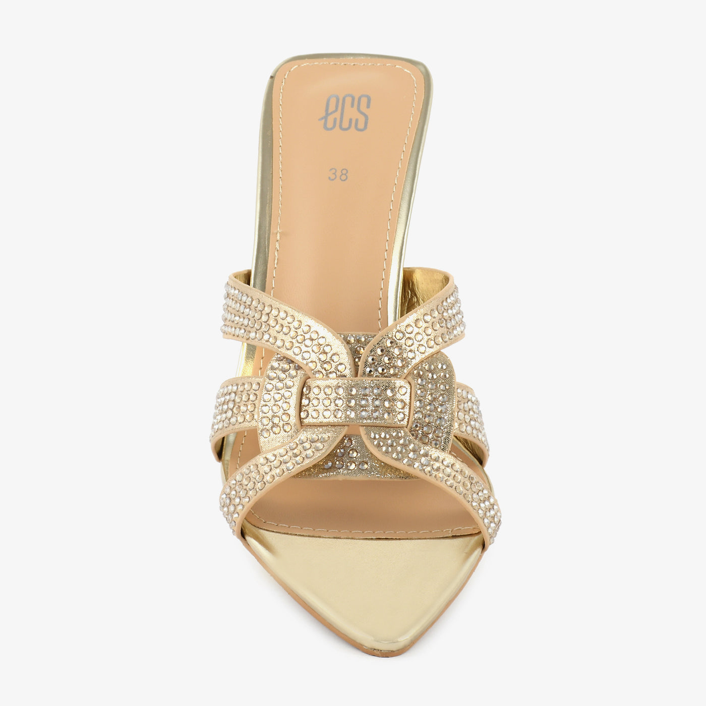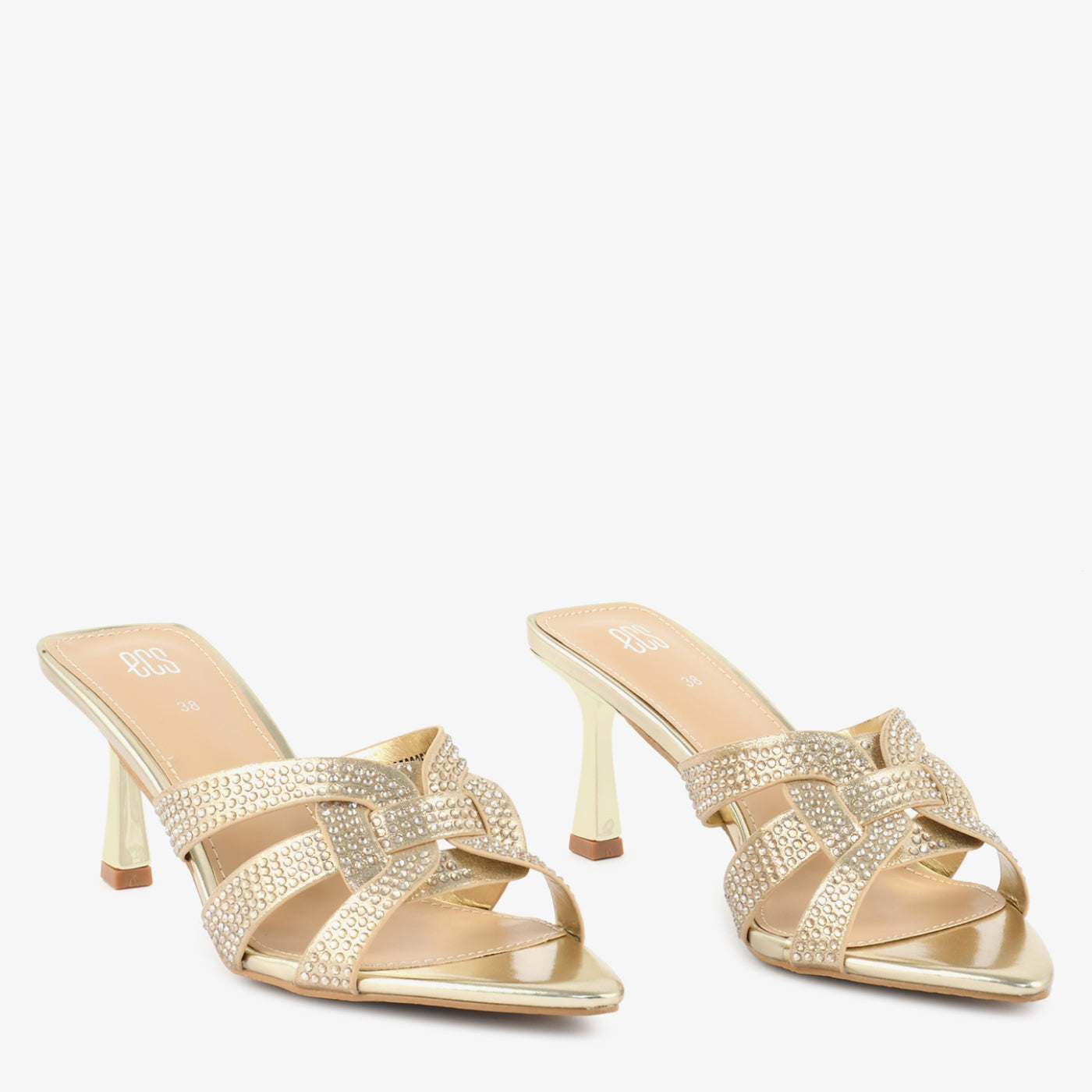 Modern and luminous, this heel features an intricate woven front that combines glam with craftsmanship. Its open silhouette keeps it light and airy, while the sleek heel adds a refined edge.
