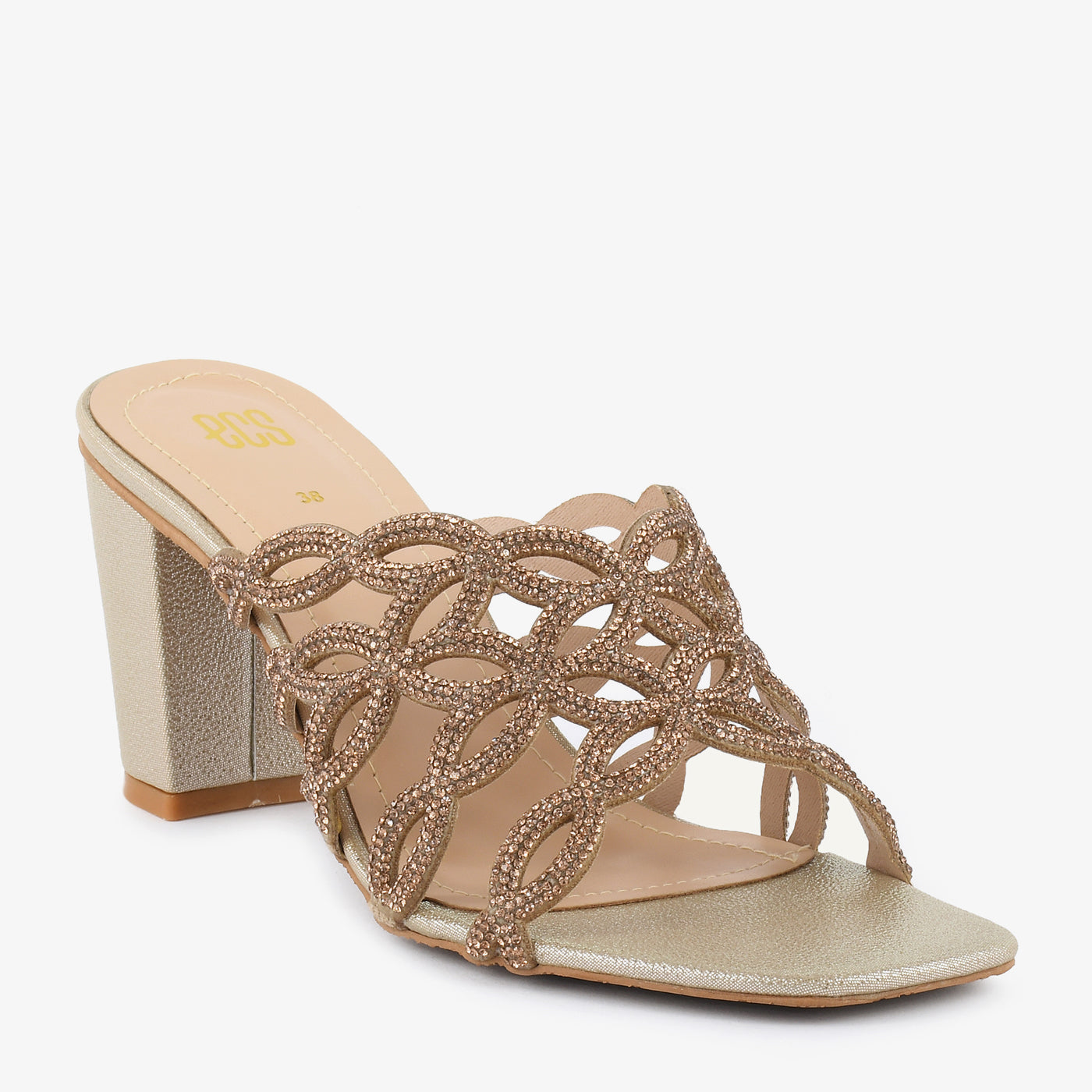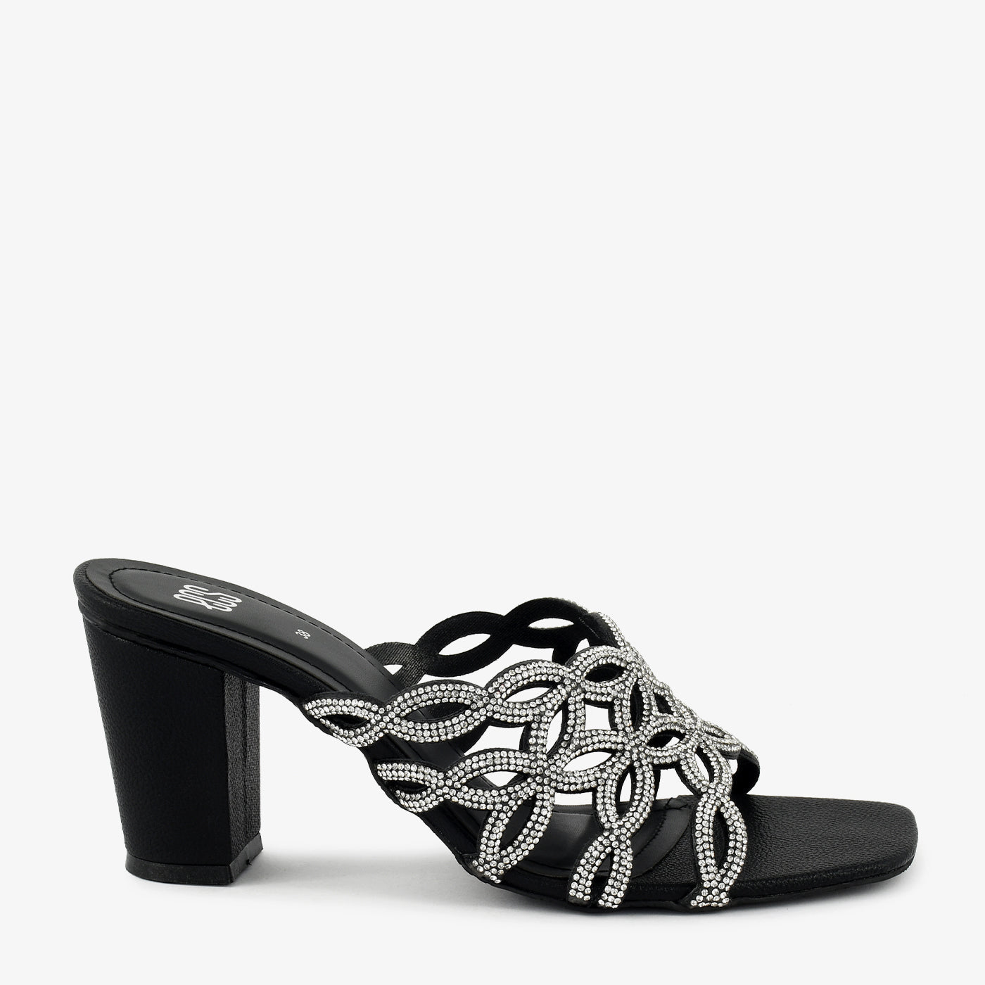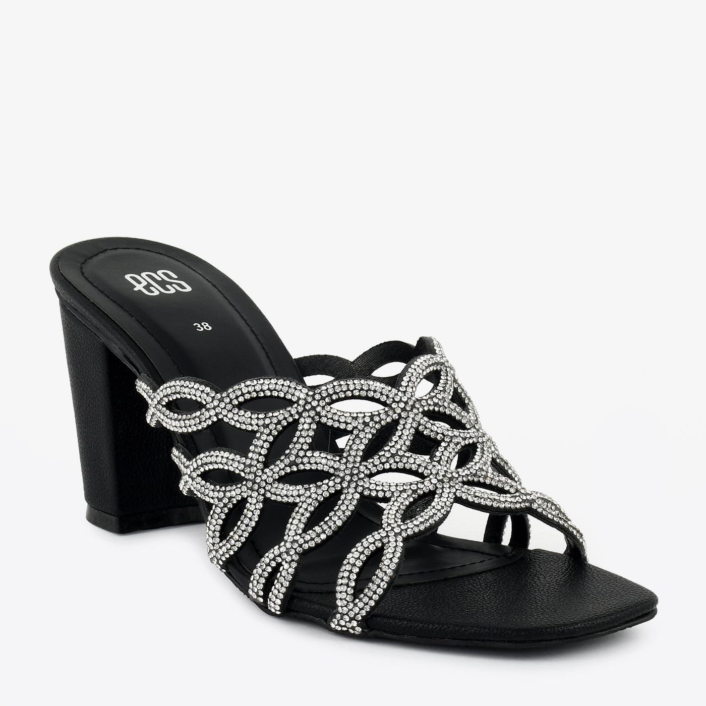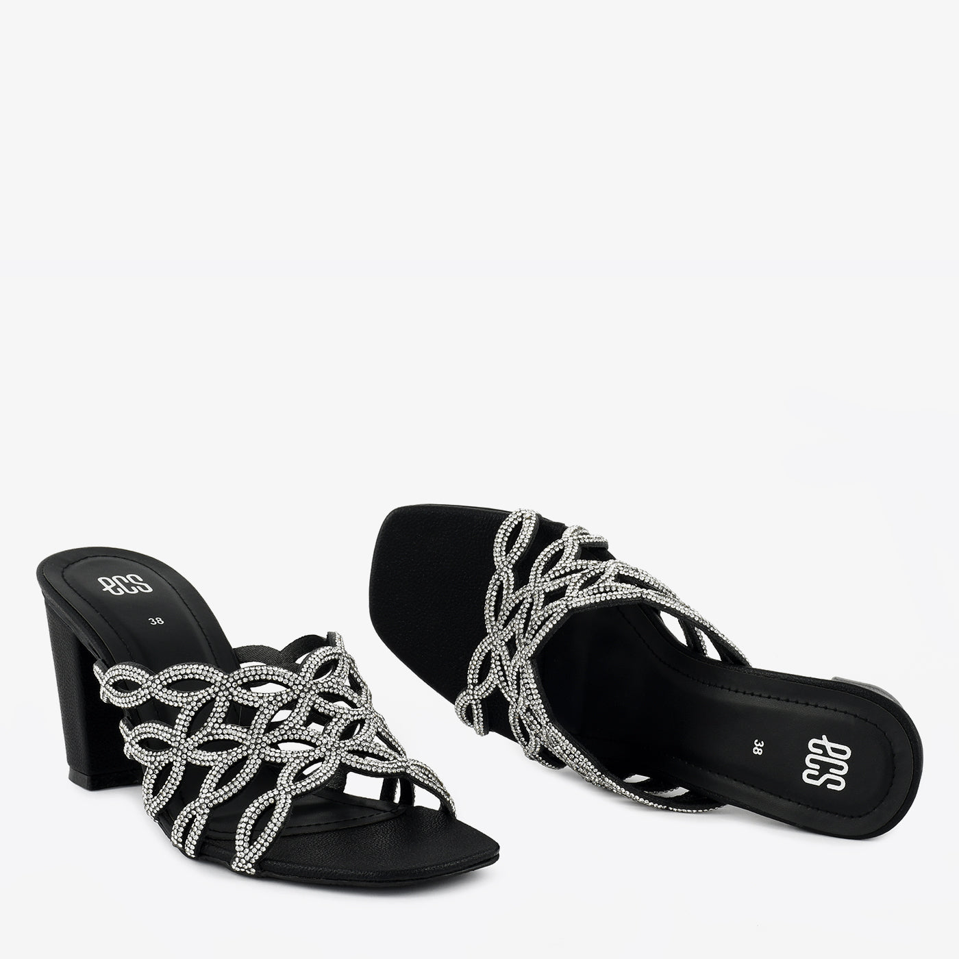 This bold block heel combines luxury and edge with its interwoven rhinestone pattern. The intricate design creates a statement finish, perfect for adding sparkle to any ensemble. Its sturdy heel ensures balance and comfort, while the open structure enhances breathability.