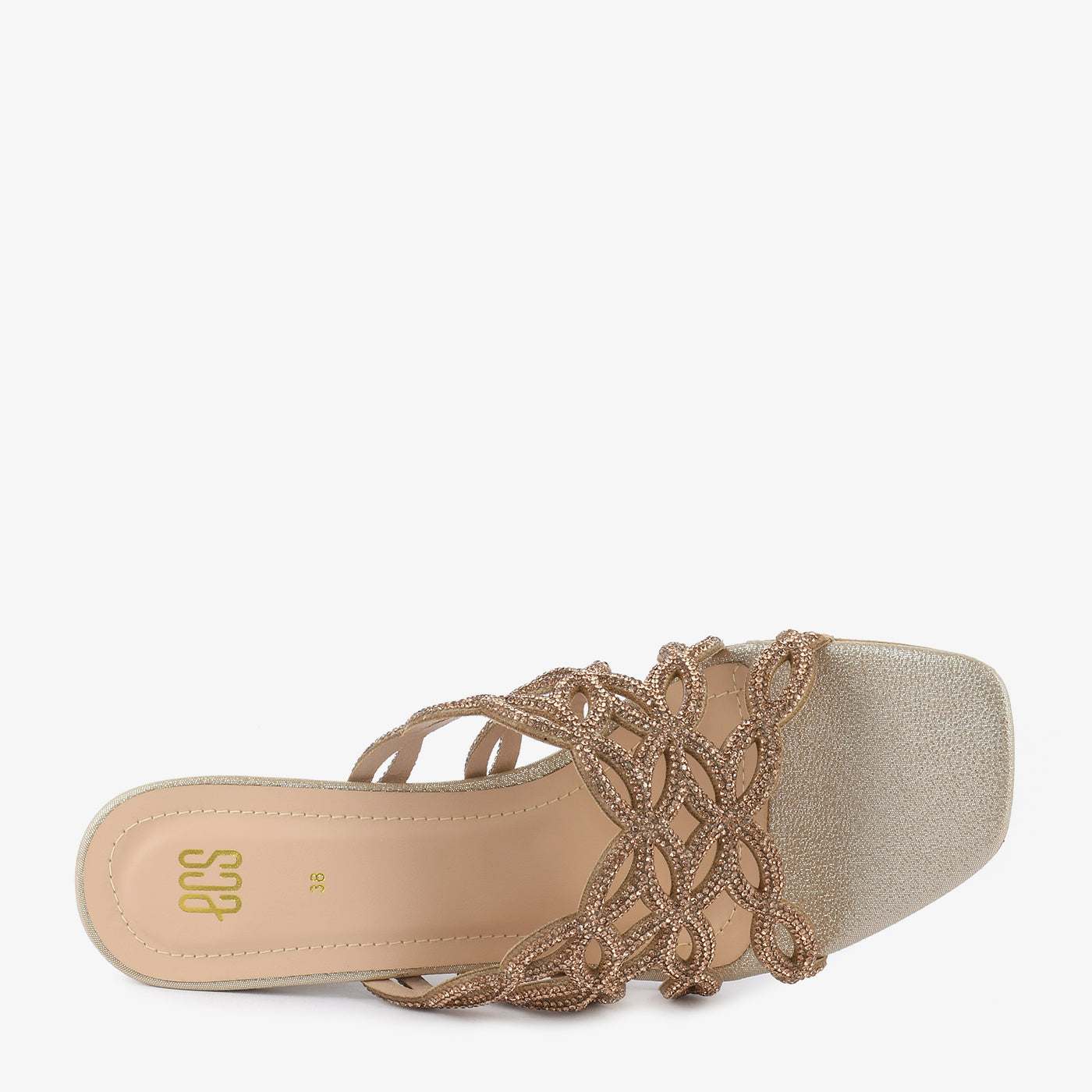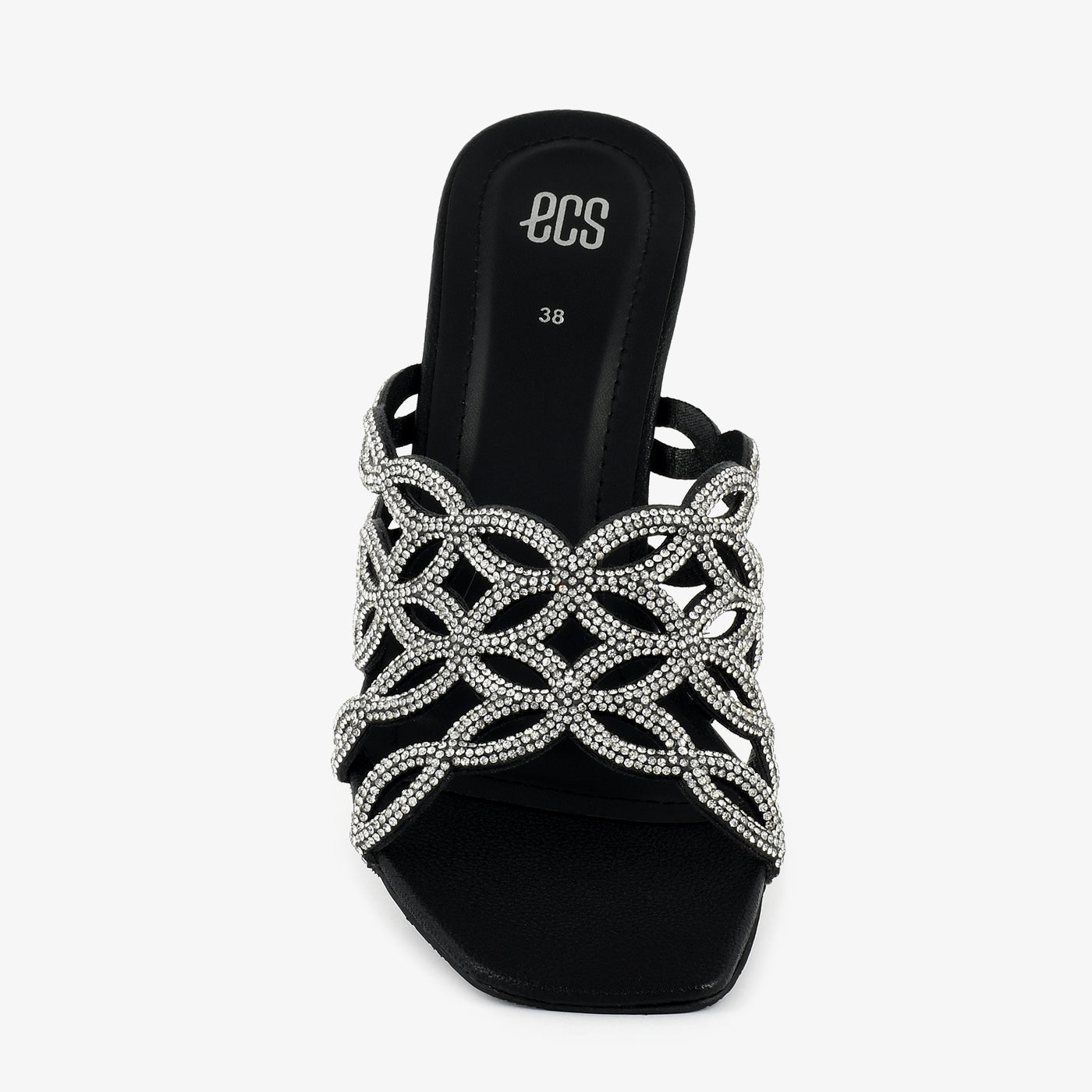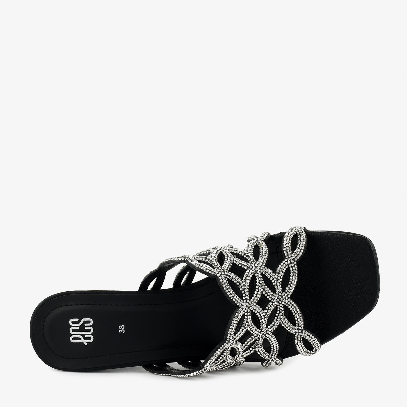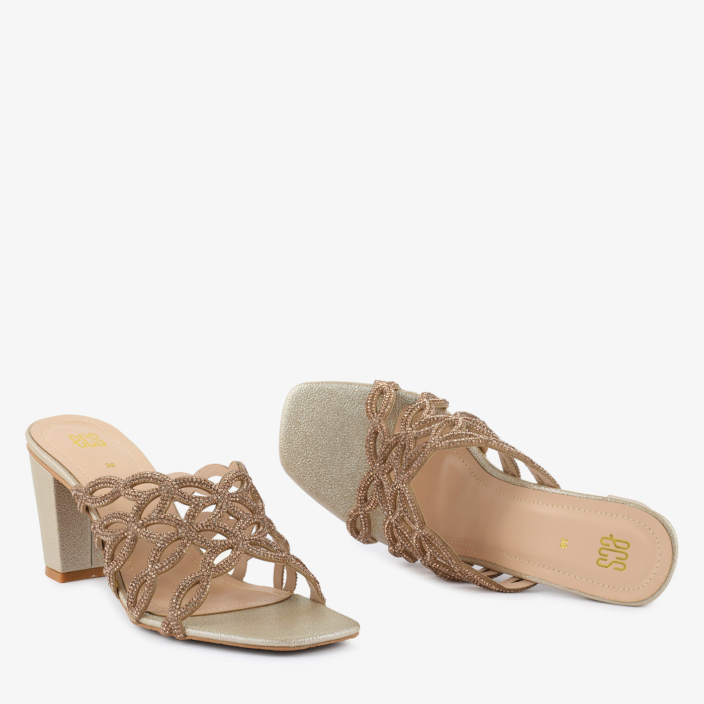 This bold block heel combines luxury and edge with its interwoven rhinestone pattern. The intricate design creates a statement finish, perfect for adding sparkle to any ensemble. Its sturdy heel ensures balance and comfort, while the open structure enhances breathability.