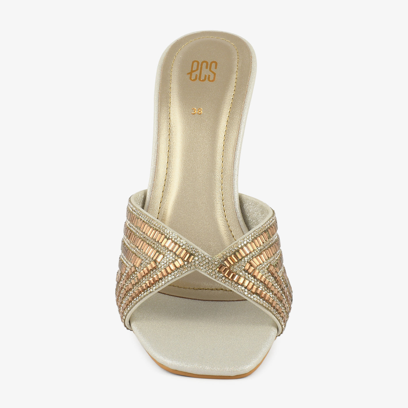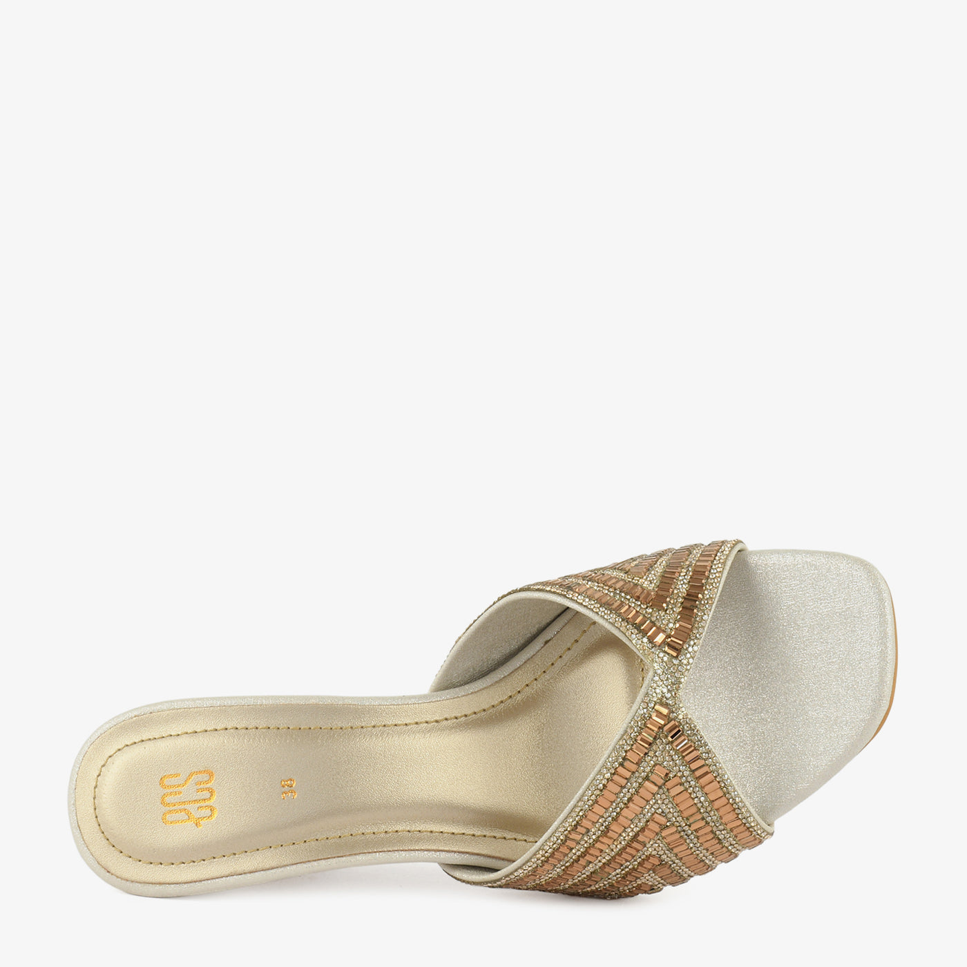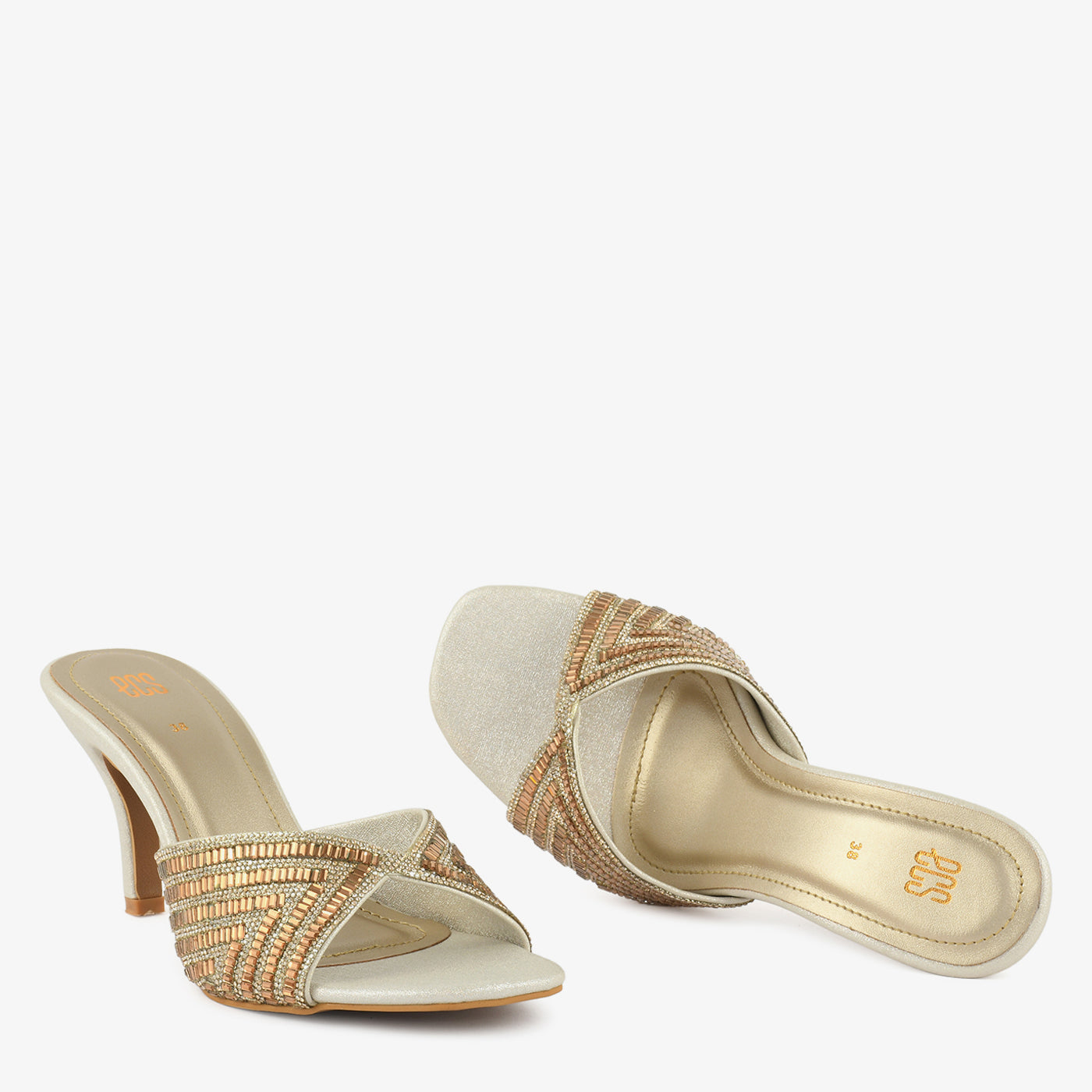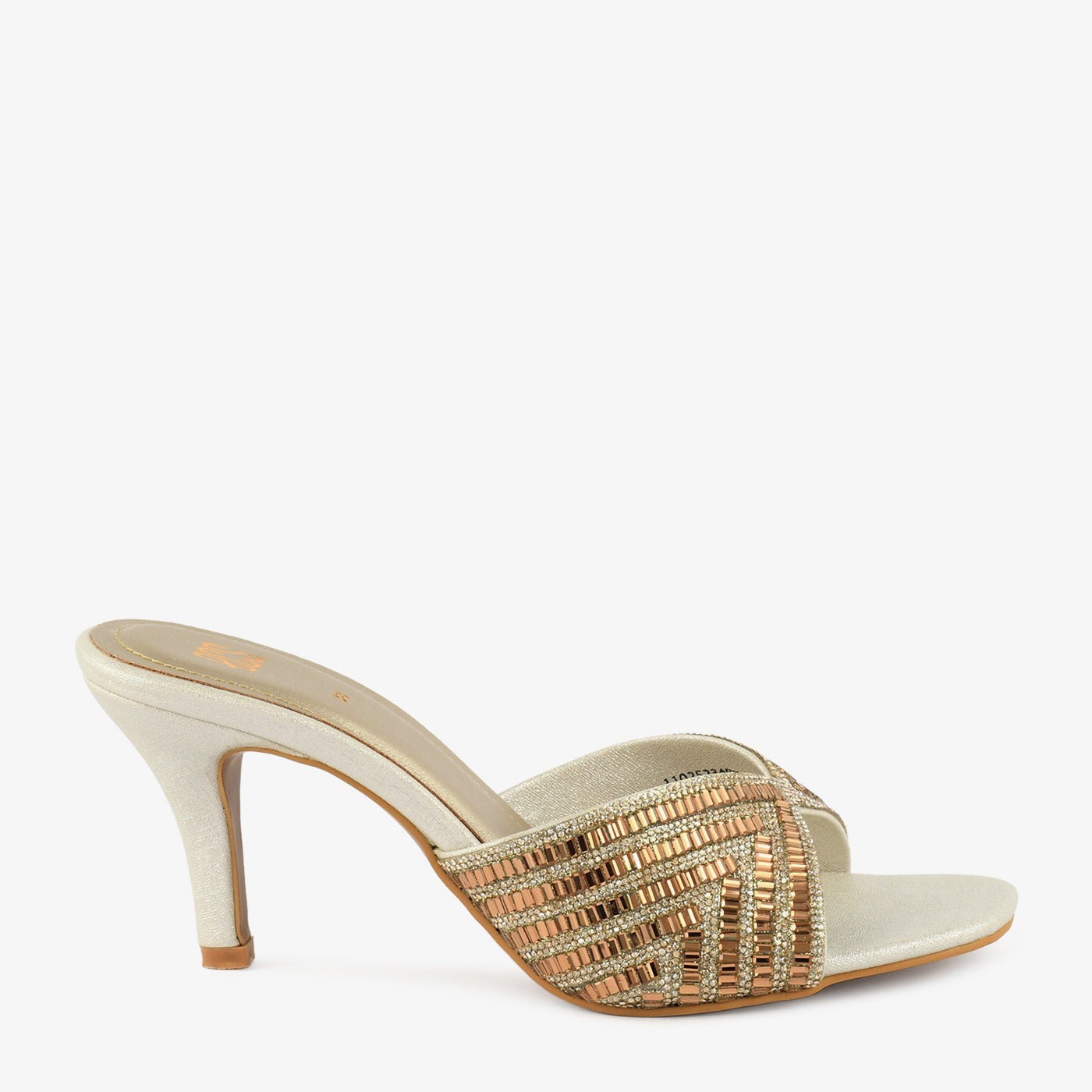 A refined slip on slipper designed with a sleek open-toe profile and a gracefully structured heel. The cushioned insole offers lasting comfort, while the detailed upper adds a touch of elegance. Ideal for festive wear or evening occasions, this slipper balances style with ease. The slip-on construction makes it effortless to wear without compromising on sophistication.