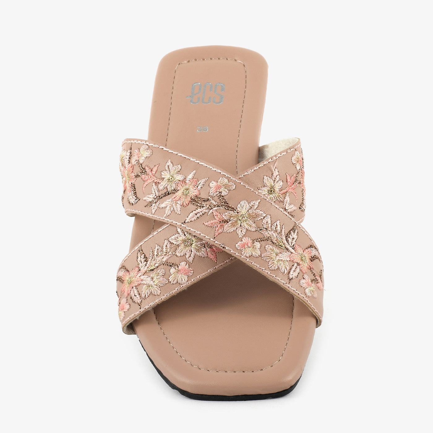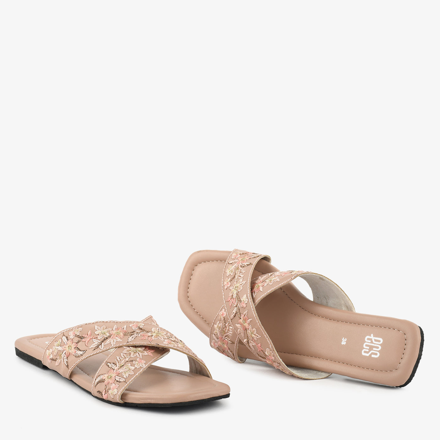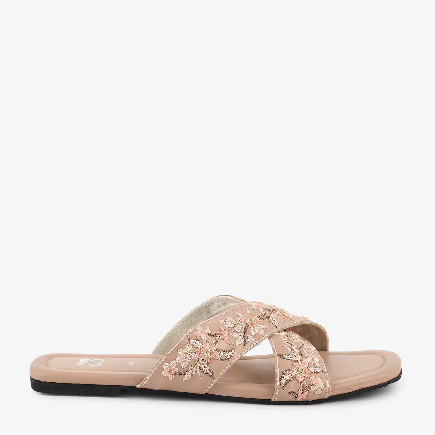 This elegant slip-on slipper features delicately embroidered floral detailing that adds a soft and graceful touch to your look. The criss-cross strap design offers a secure fit while enhancing its feminine appeal. Crafted with a smooth and cushioned footbed, it provides comfort for extended wear. The lightweight structure ensures easy movement throughout the day. Its slip-on style makes it convenient for quick outings and daily use. The finely finished edges improve durability and long-lasting wear. Perfect for casual and semi-formal occasions, it blends comfort with subtle elegance.