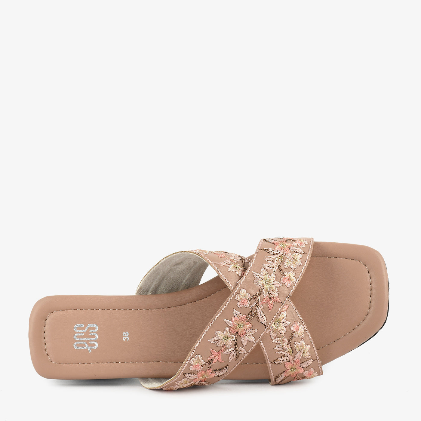 - Design: Slip-on slipper with embroidered criss-cross straps