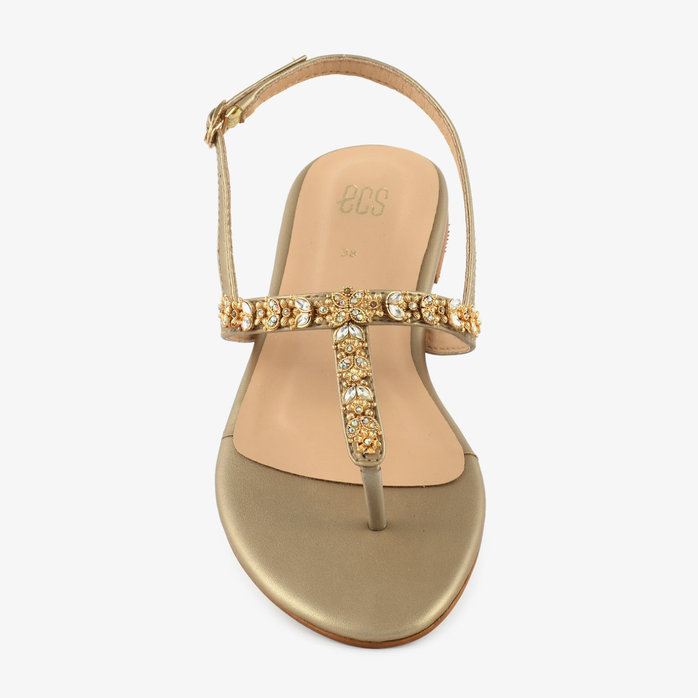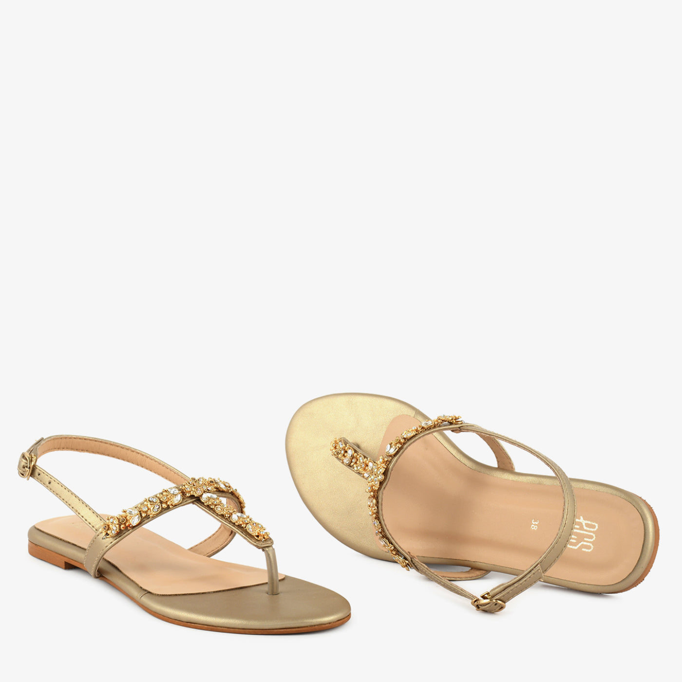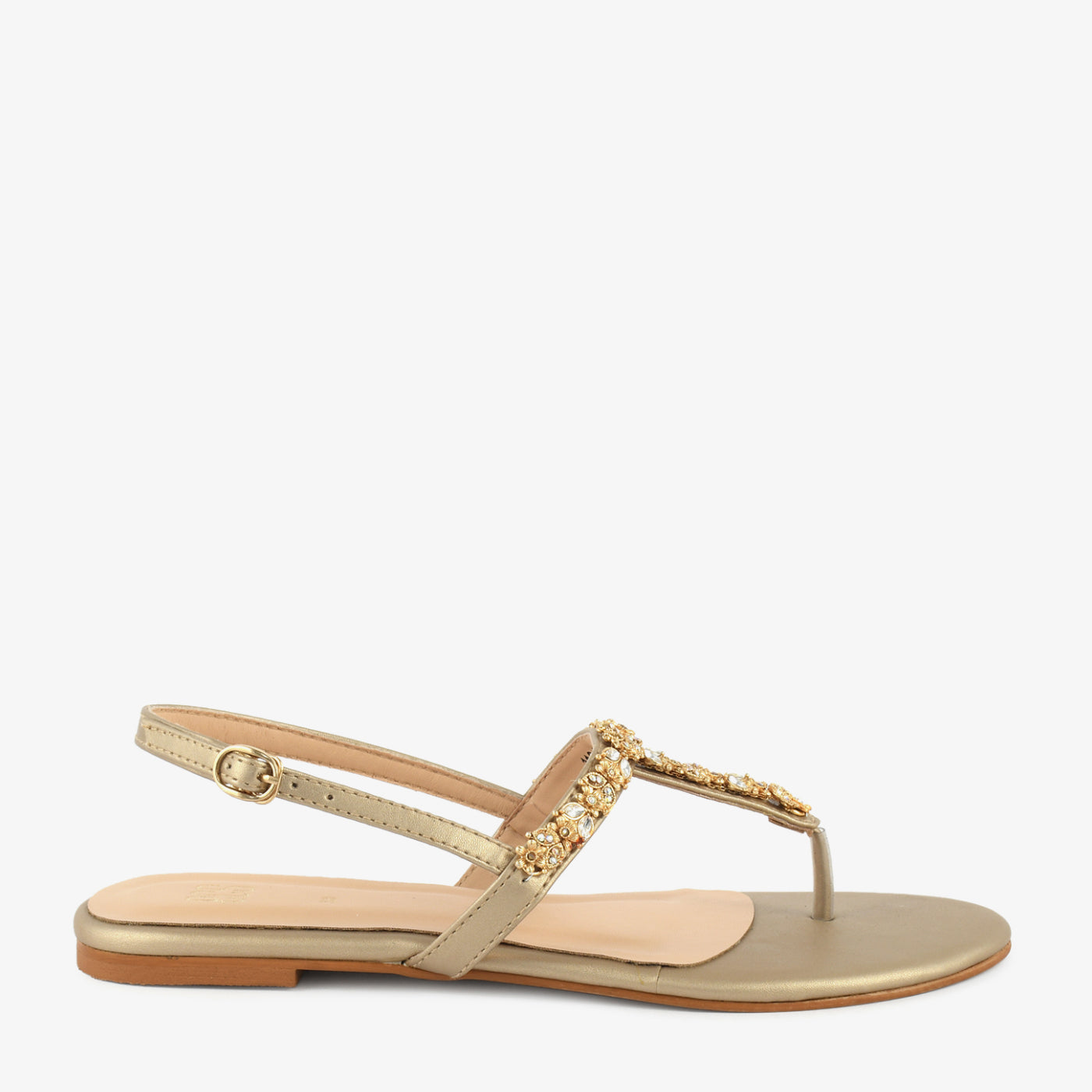 This refined women’s sandal features a flat sole designed for comfort and easy movement. The central thong strap is enhanced with decorative jewel-style accents for a polished appearance. Its lightweight construction makes it ideal for day-long wear. Designed as a women’s sandal, it blends simplicity with ornamental detail. The soft inner lining adds comfort against the skin. A secure back strap ensures a stable fit. Perfect for casual outings with a touch of elegance.