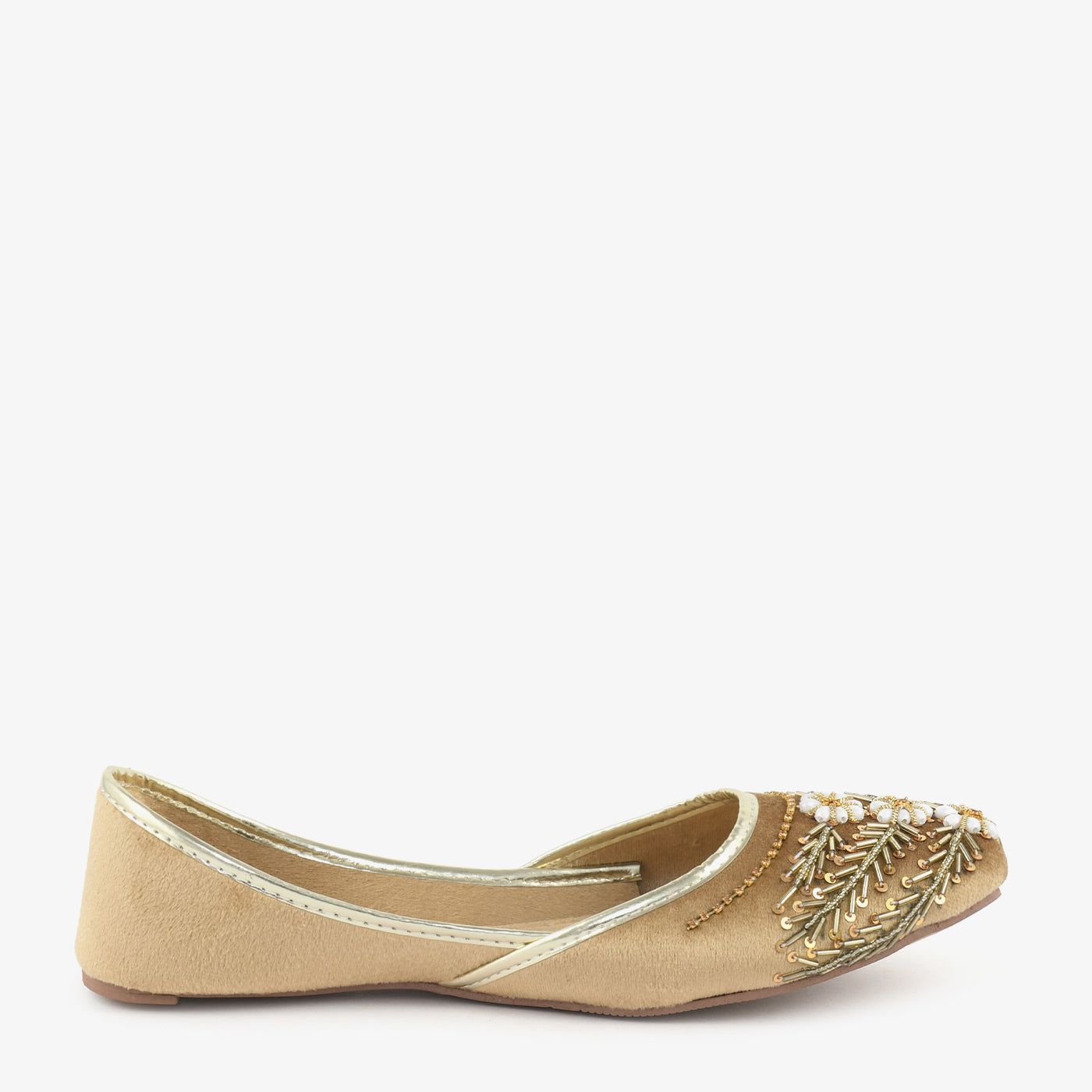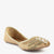 This beautifully designed khussa features intricate hand embellishments that create a rich and festive appeal. The detailed bead and thread work on the front adds a touch of elegance and artistic craftsmanship. Its soft inner lining ensures a comfortable fit, making it ideal for extended wear. The slip-on design allows easy movement, while the flat sole provides stability throughout the day. Perfect for festive occasions and traditional gatherings, it complements a variety of outfits effortlessly. A timeless piece that blends heritage style with modern charm.
