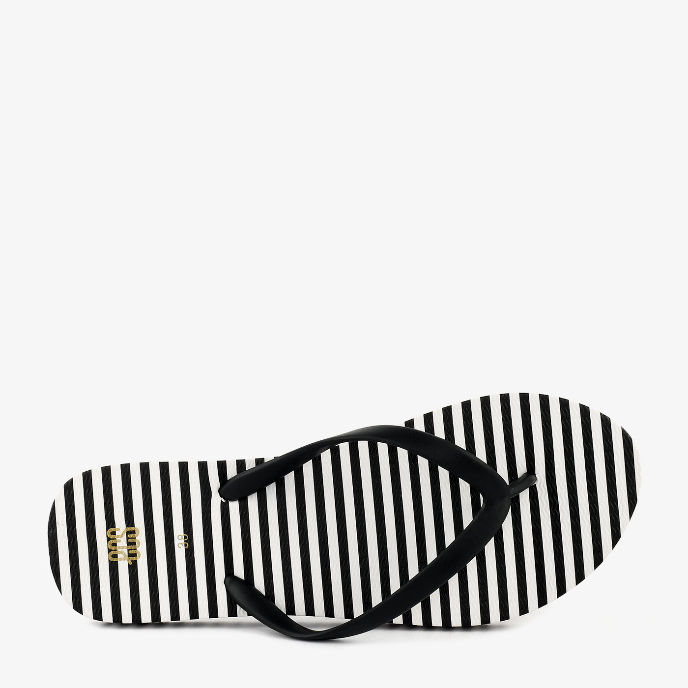 • Material: Rubber footbed with diagonal stripe print, slim rubber Y-strap, and flat rubber outsole with gold-tone brand emboss
