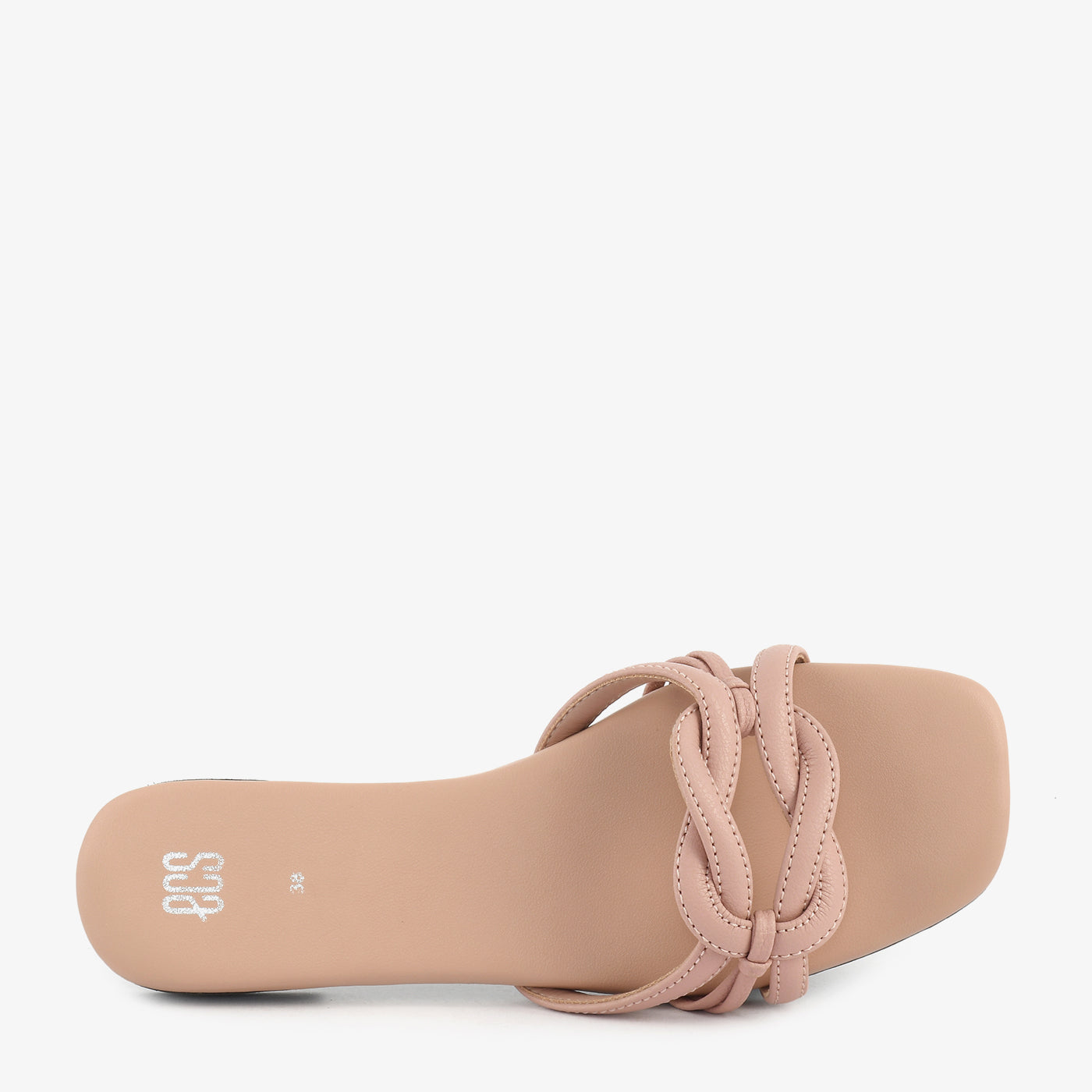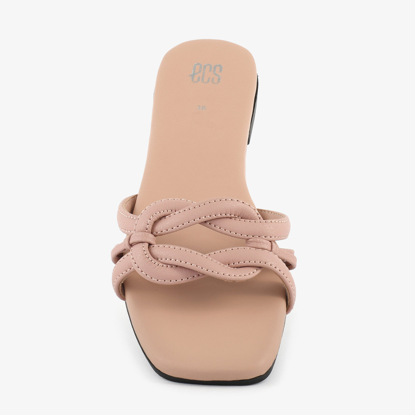 Refined and minimal, this flat open-toe slipper features a smooth cushioned footbed with a lightweight sole that provides comfort throughout the day. Three slim padded tubular straps interlock and loop through each other in a structured chain-link weave arrangement across the front, creating a distinctive and tactile focal point. The slip-on open-toe construction ensures an easy and comfortable fit for casual and smart everyday wear.
