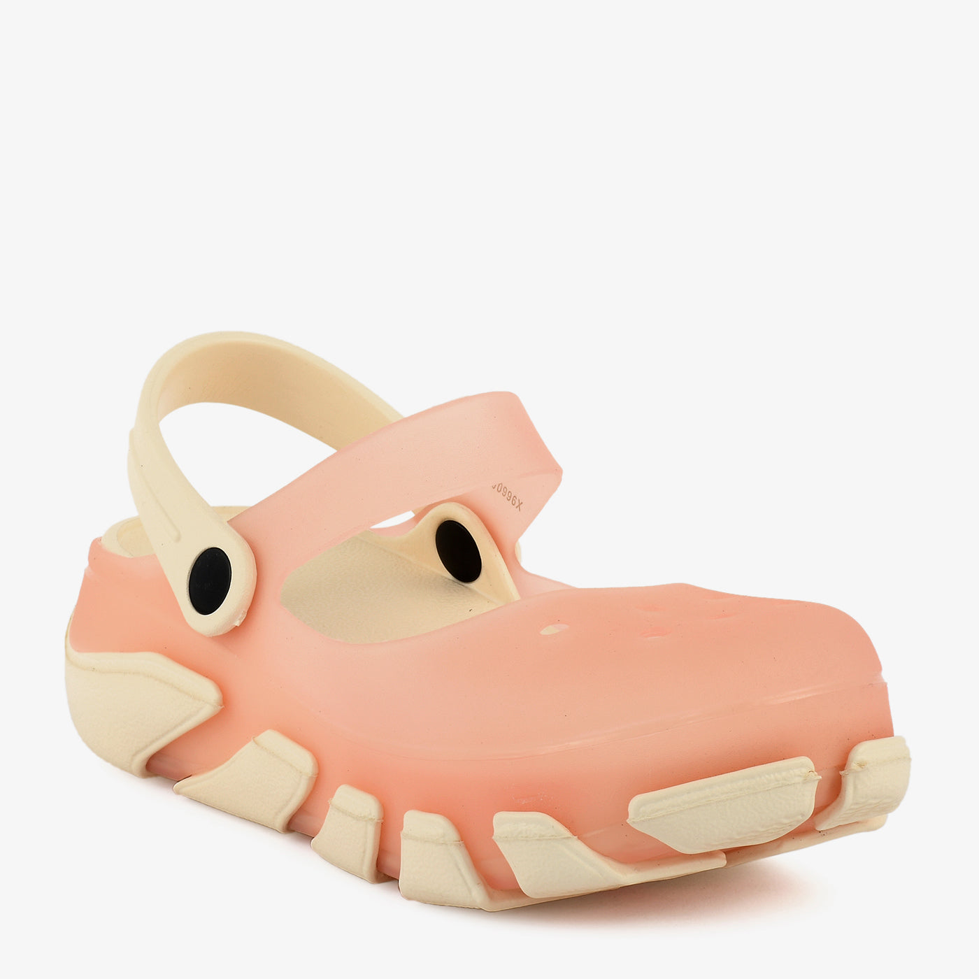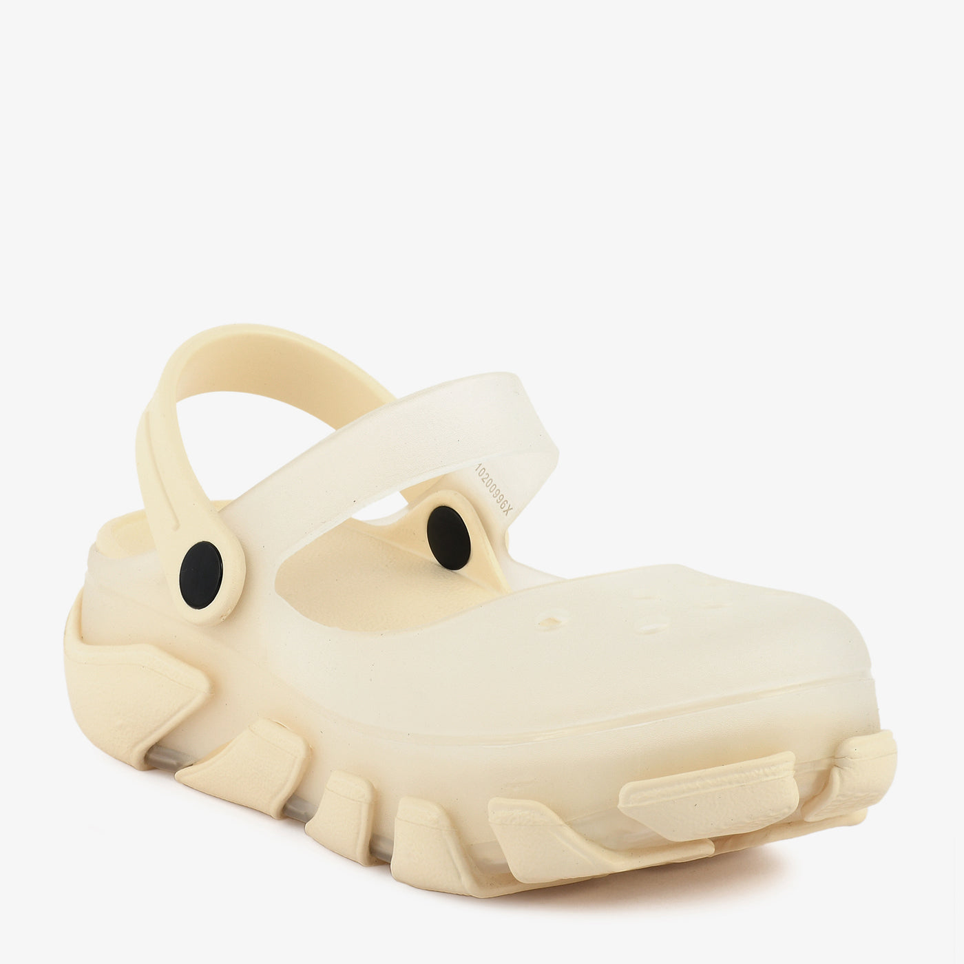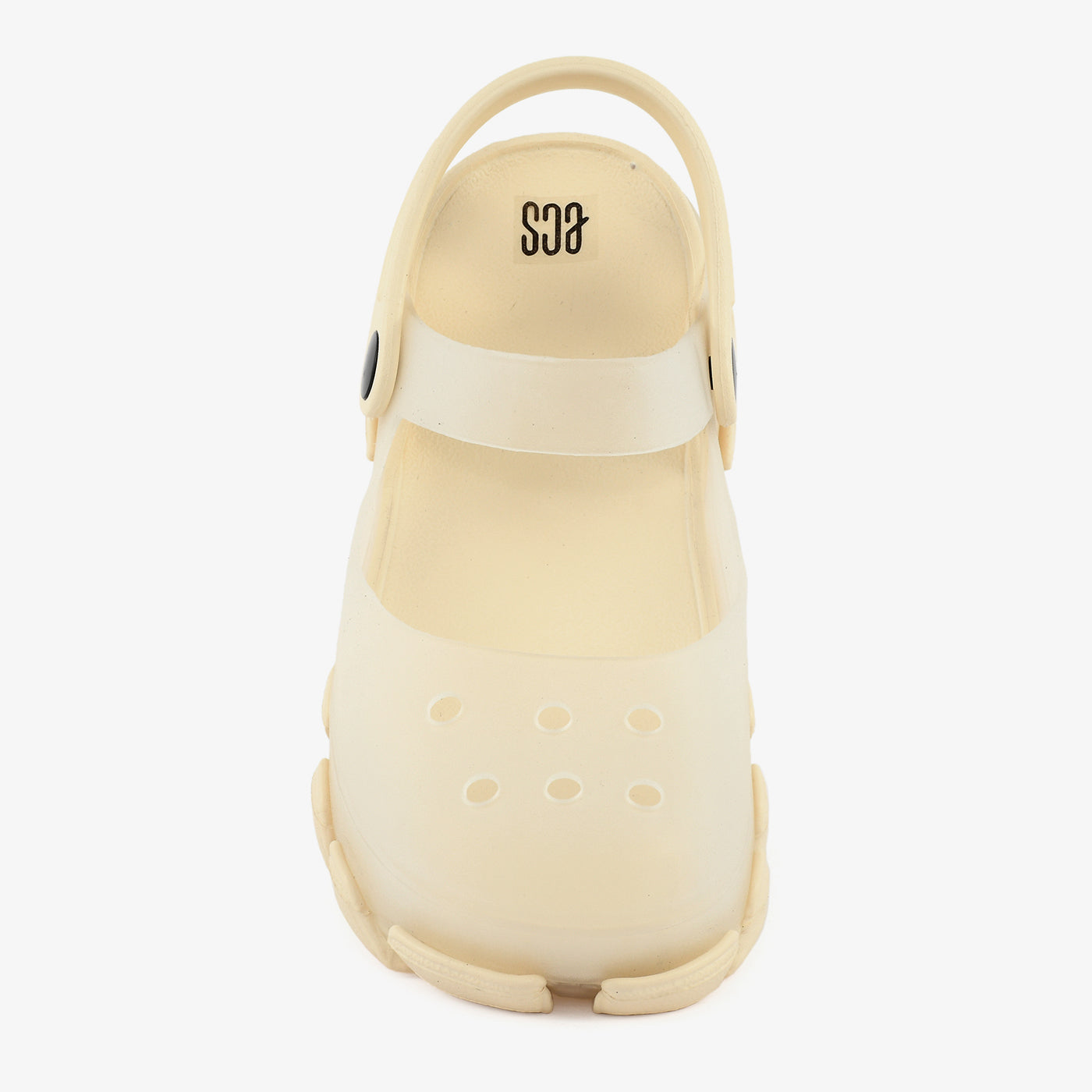 A lightweight EVA women's sandal constructed in a nature-inspired character mould, featuring a sculpted textured upper with dimensional detailing at the vamp, a chunky ridged outsole that adds a bold and expressive silhouette, and a fully enclosed toe box that provides a secure and protective fit. A flexible ankle strap with a hook-and-loop closure wraps around the back of the heel, offering an adjustable and comfortable fit suited for extended casual wear. The fully moulded one-piece EVA construction makes this sandal water-resistant, lightweight, and easy to clean, suited for outdoor settings, beach outings, and relaxed everyday use.Â