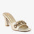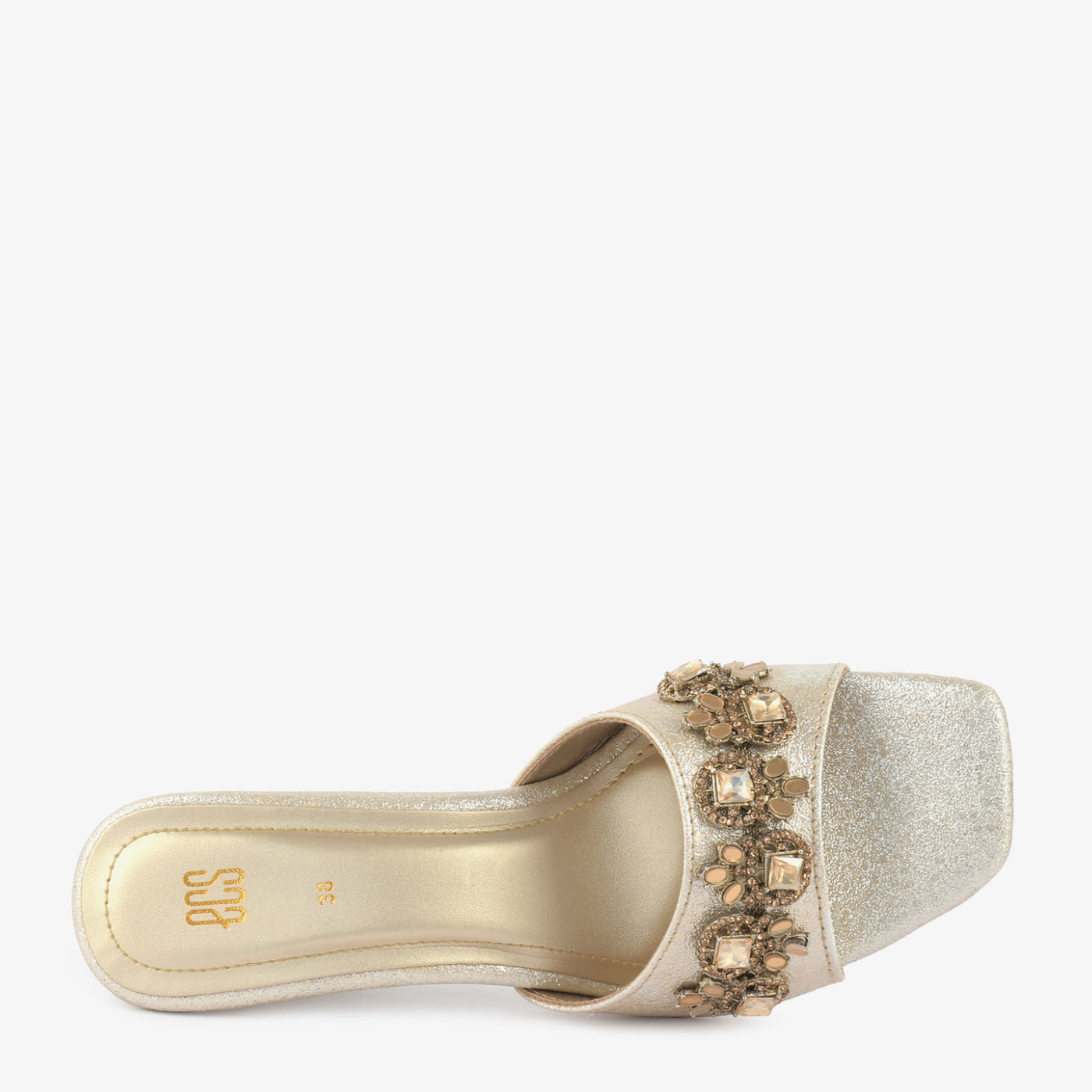Step into elegant ease with these women's low-heeled footwear. They feature a comfortable, low block heel and a wide strap across the foot, beautifully adorned with shimmering, braided embellishments....