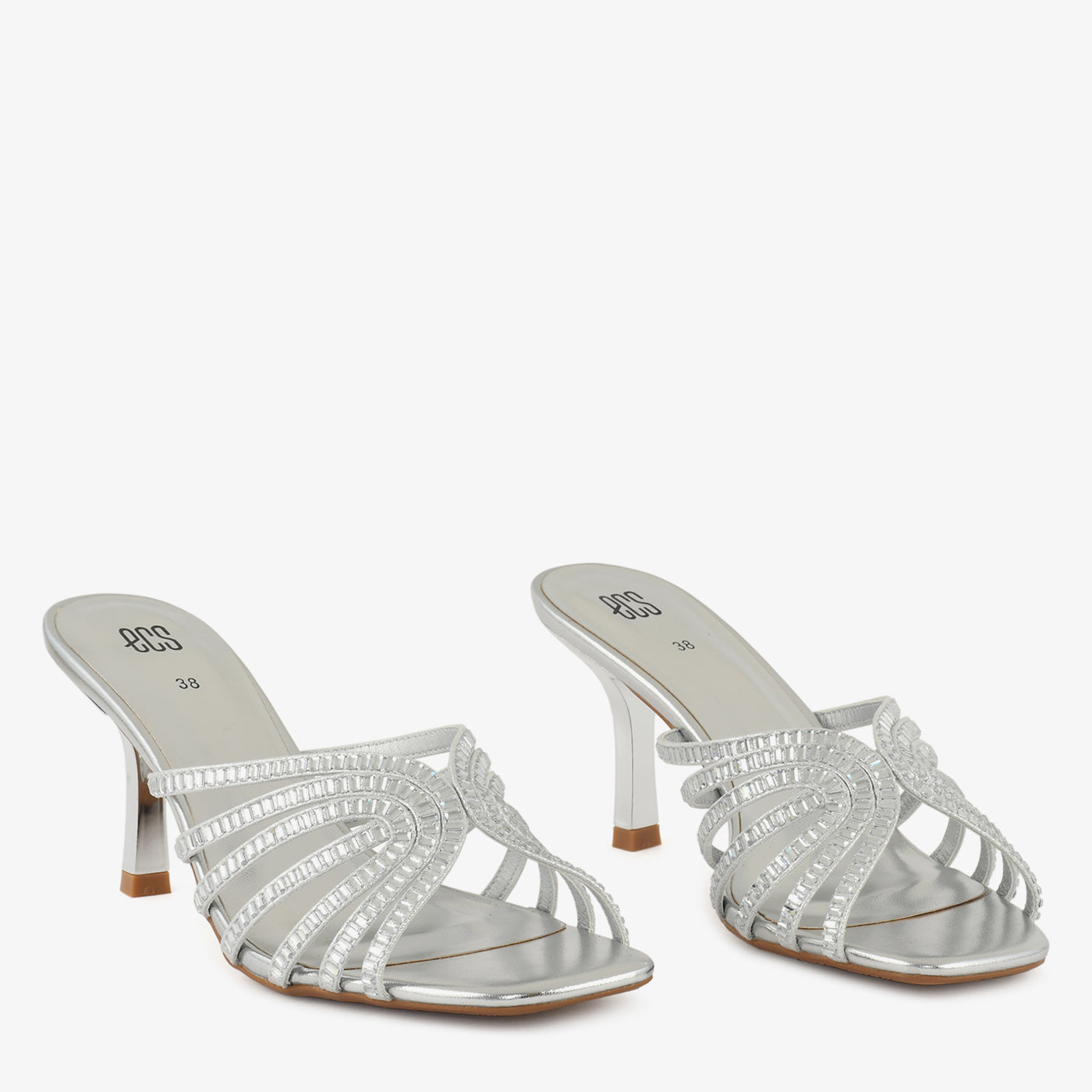 • Design: Kitten heel open-toe heel with sweeping arc baguette crystal straps and slim curved heel