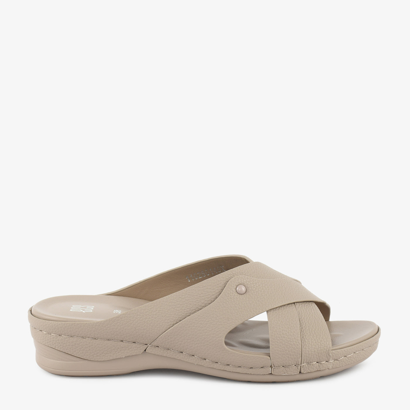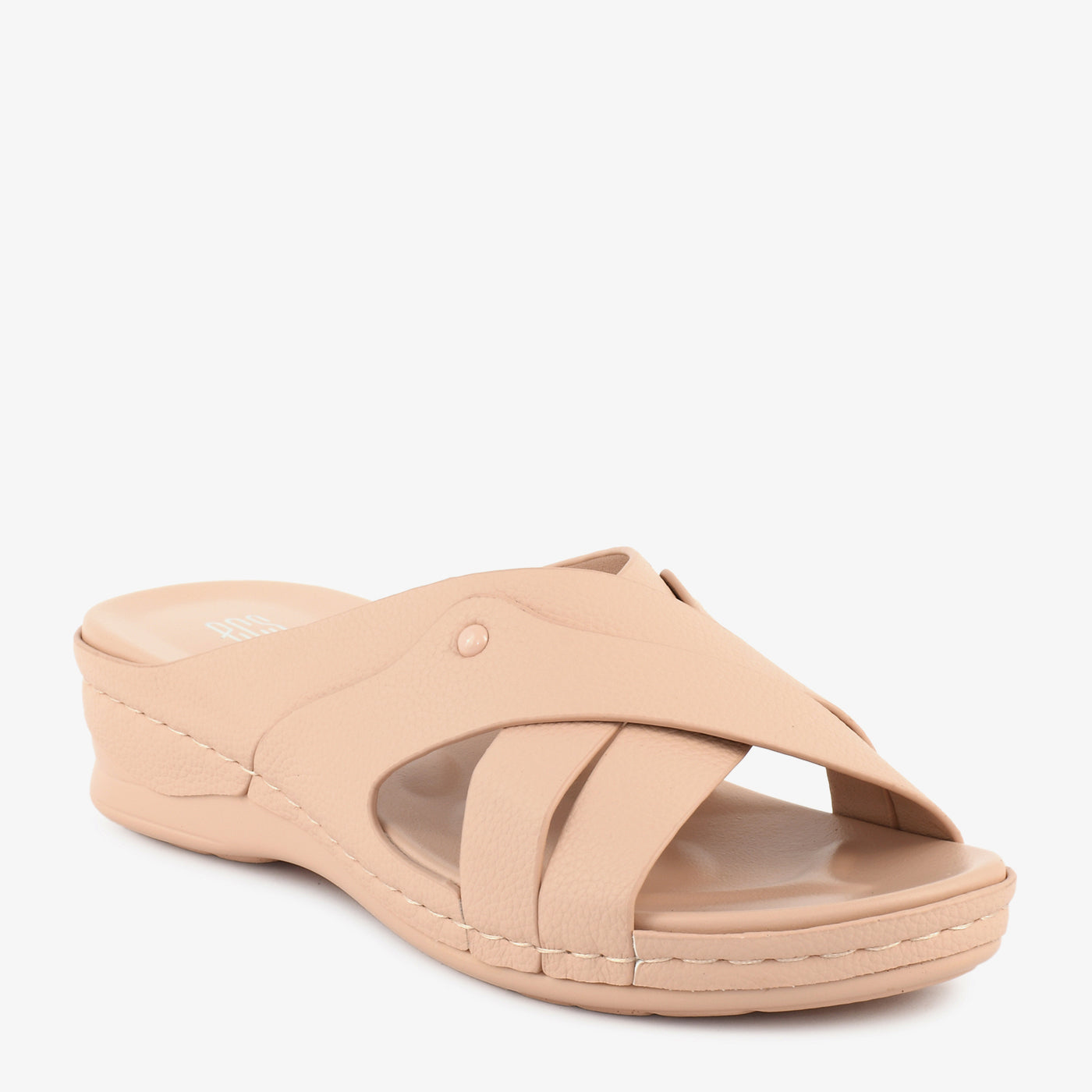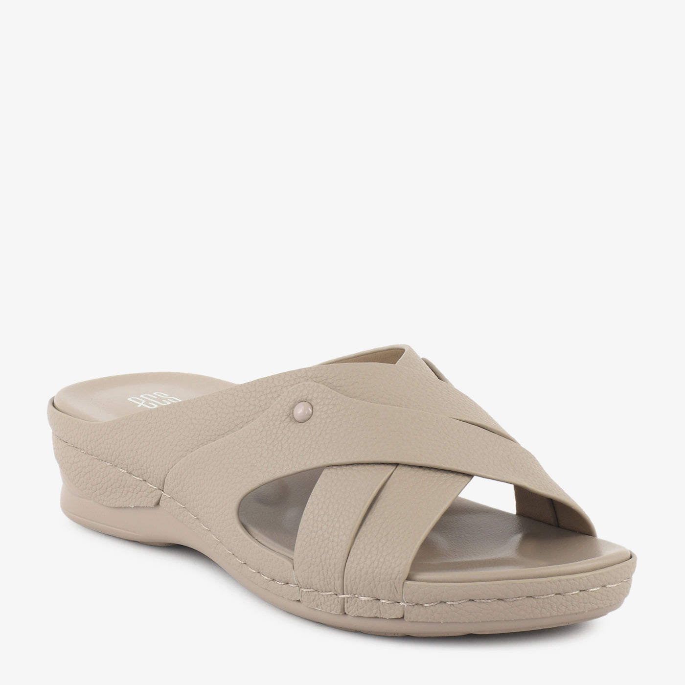 Comfortable and everyday-ready, this low wedge open-toe slipper features a smooth contoured cushioned footbed with a lightweight low wedge sole that provides gentle elevation and superior support throughout the day. Two wide smooth crossover bands overlap in a clean X-formation across the front, accented with a small gold rivet stud at the side junction for a subtle and refined detail. The slip-on open-toe construction makes it ideal for extended casual wear, travel, and daily use.