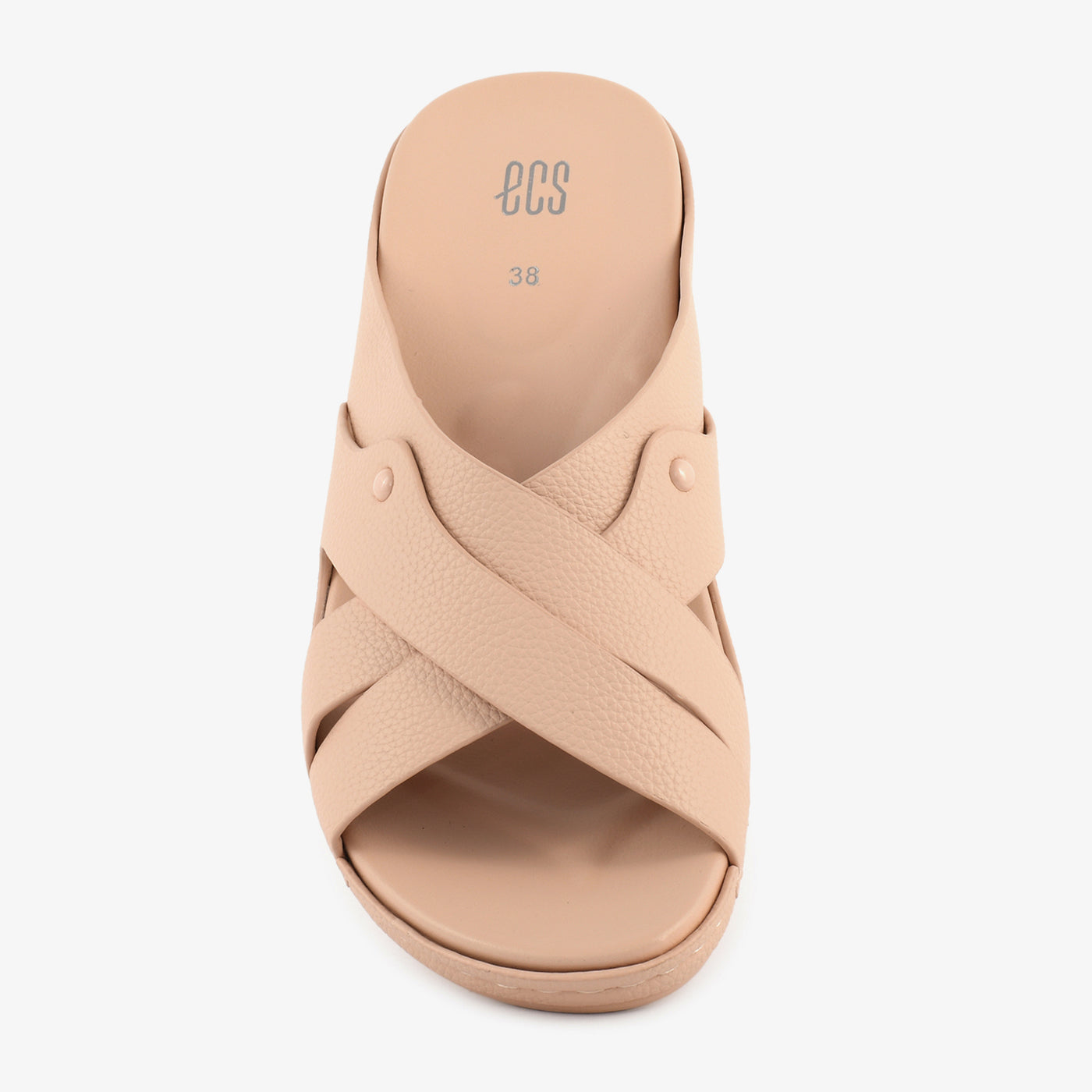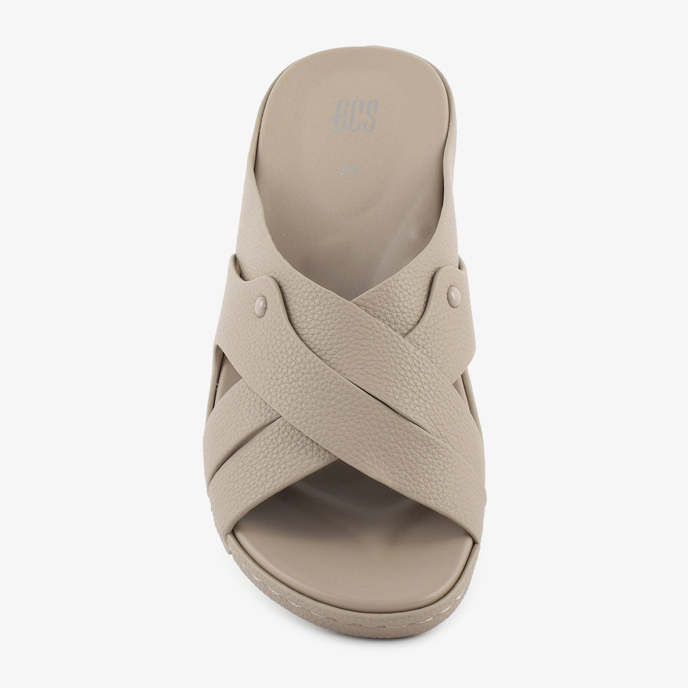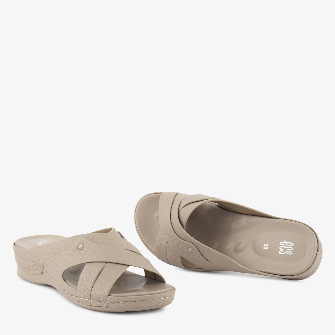 Comfortable and everyday-ready, this low wedge open-toe slipper features a smooth contoured cushioned footbed with a lightweight low wedge sole that provides gentle elevation and superior support throughout the day. Two wide smooth crossover bands overlap in a clean X-formation across the front, accented with a small gold rivet stud at the side junction for a subtle and refined detail. The slip-on open-toe construction makes it ideal for extended casual wear, travel, and daily use.