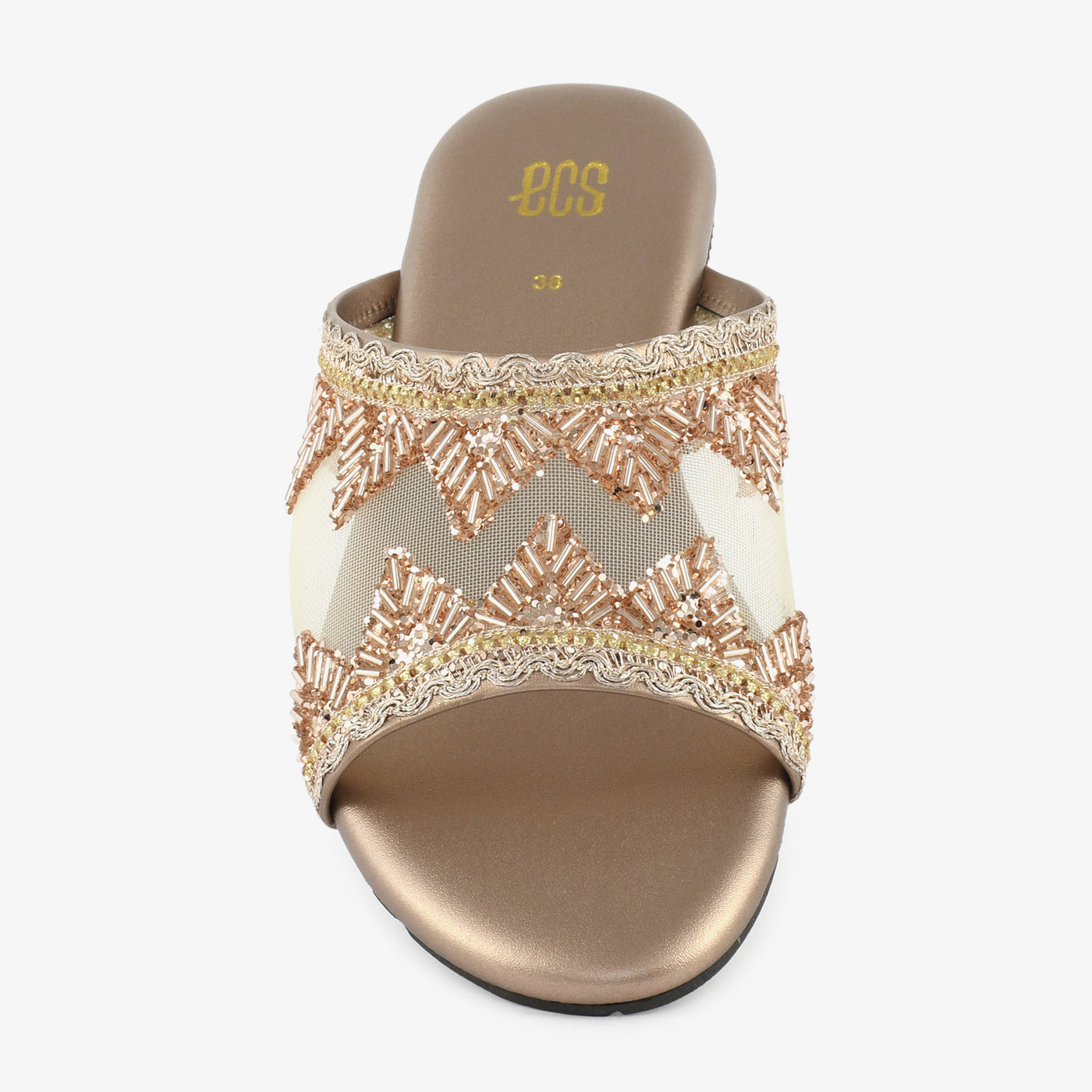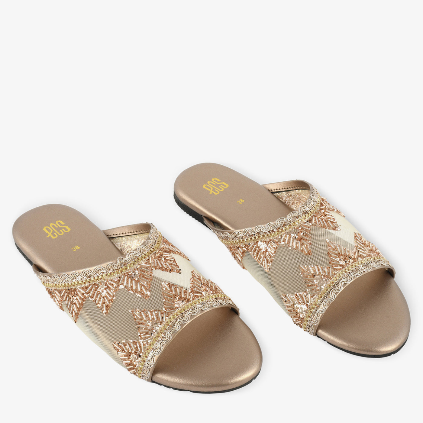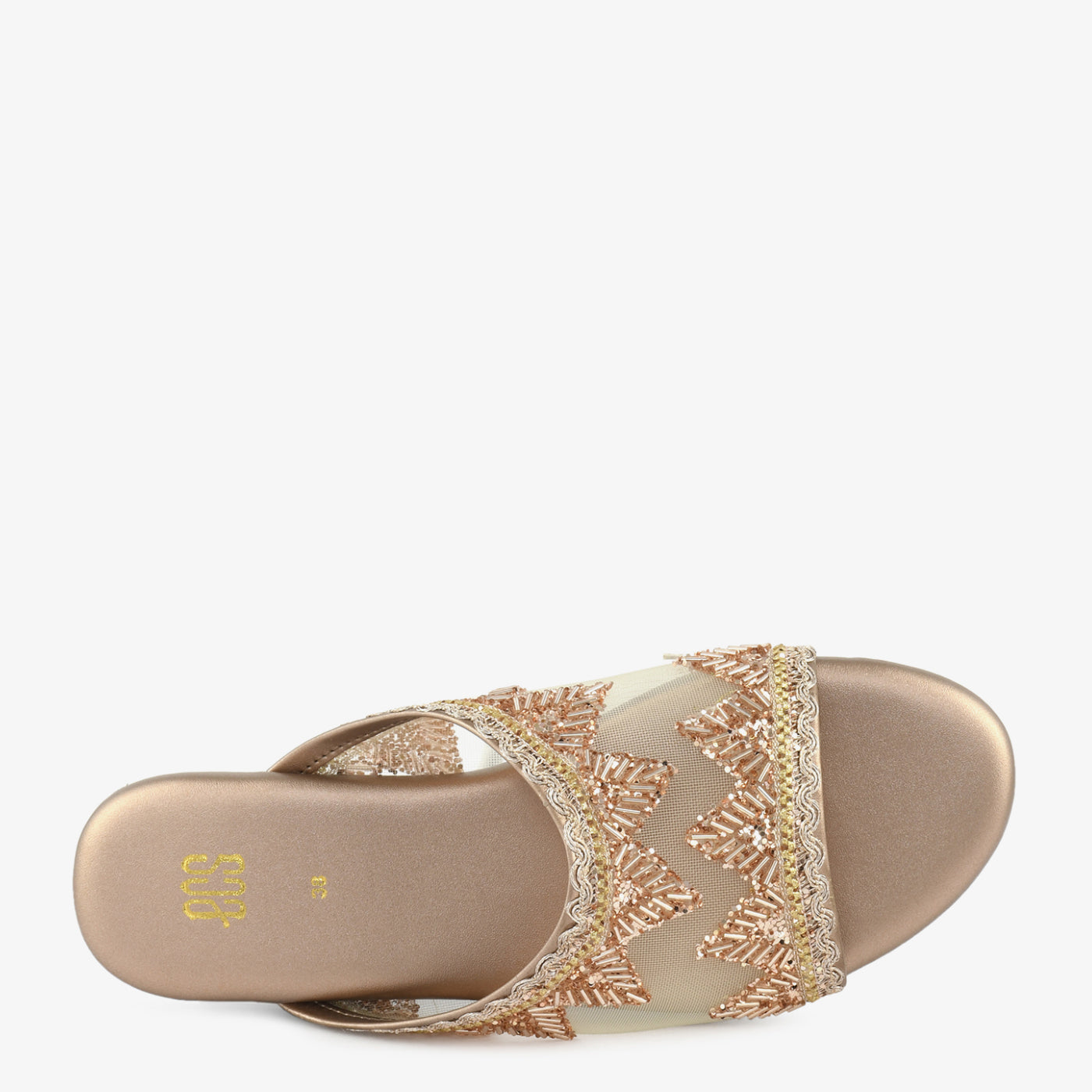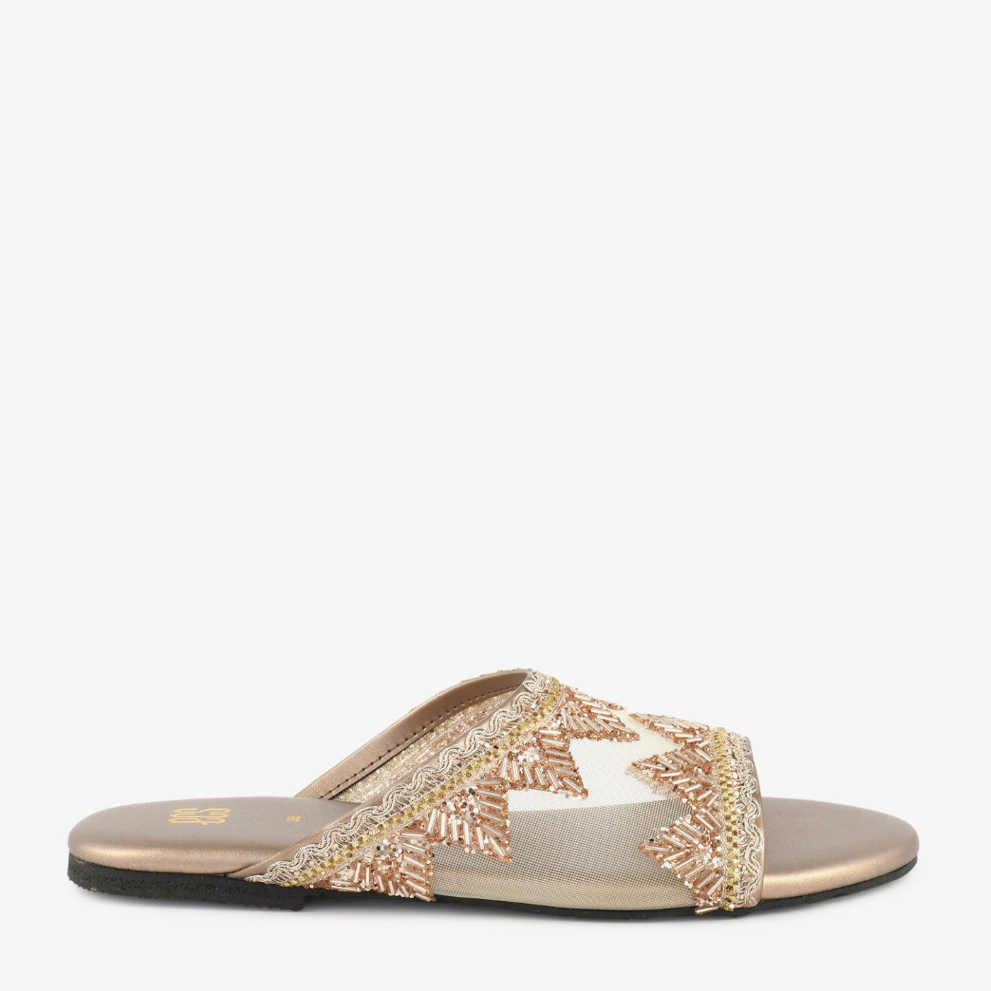 - Design: Wide mesh strap flat slipper with symmetrical fan and chevron bugle bead motif and gold zari scalloped edge trim