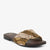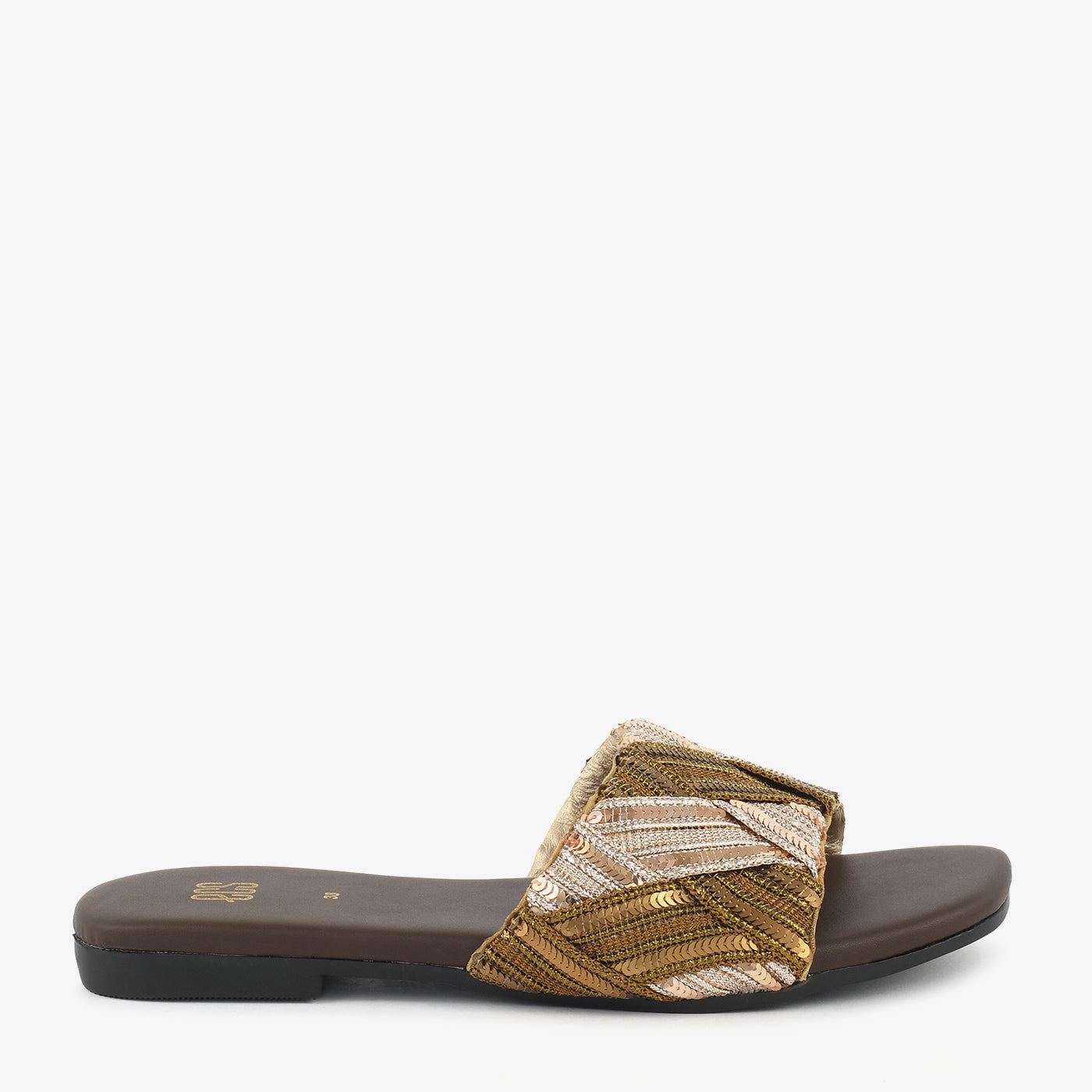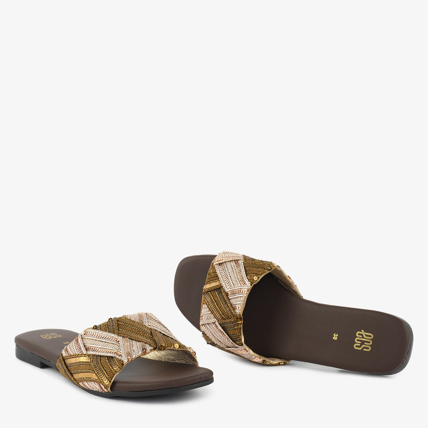 - Design: Wide strap flat slipper with continuous chevron and diagonal zari cord work in alternating metallic tones across the full vamp