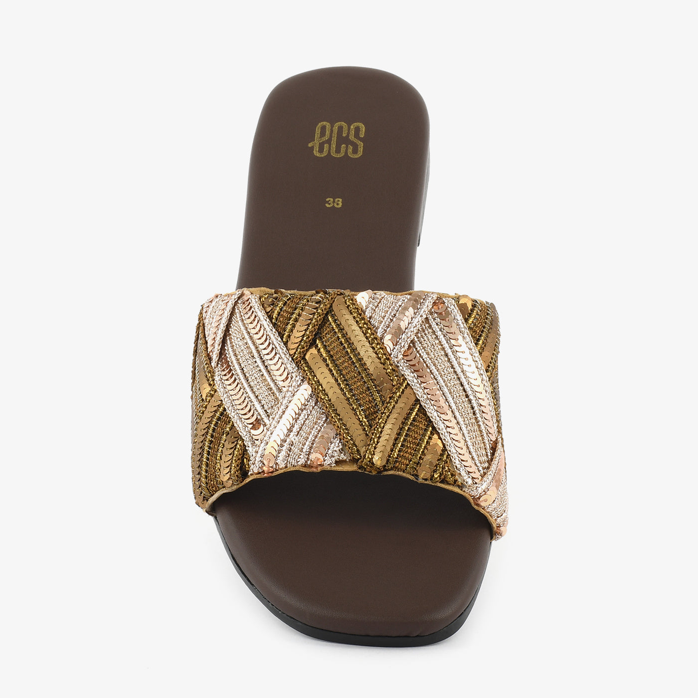 - Material: Fabric upper with hand-applied zari cord chevron embroidery and scattered sequin detailing, cushioned insole, and flat rubber outsole