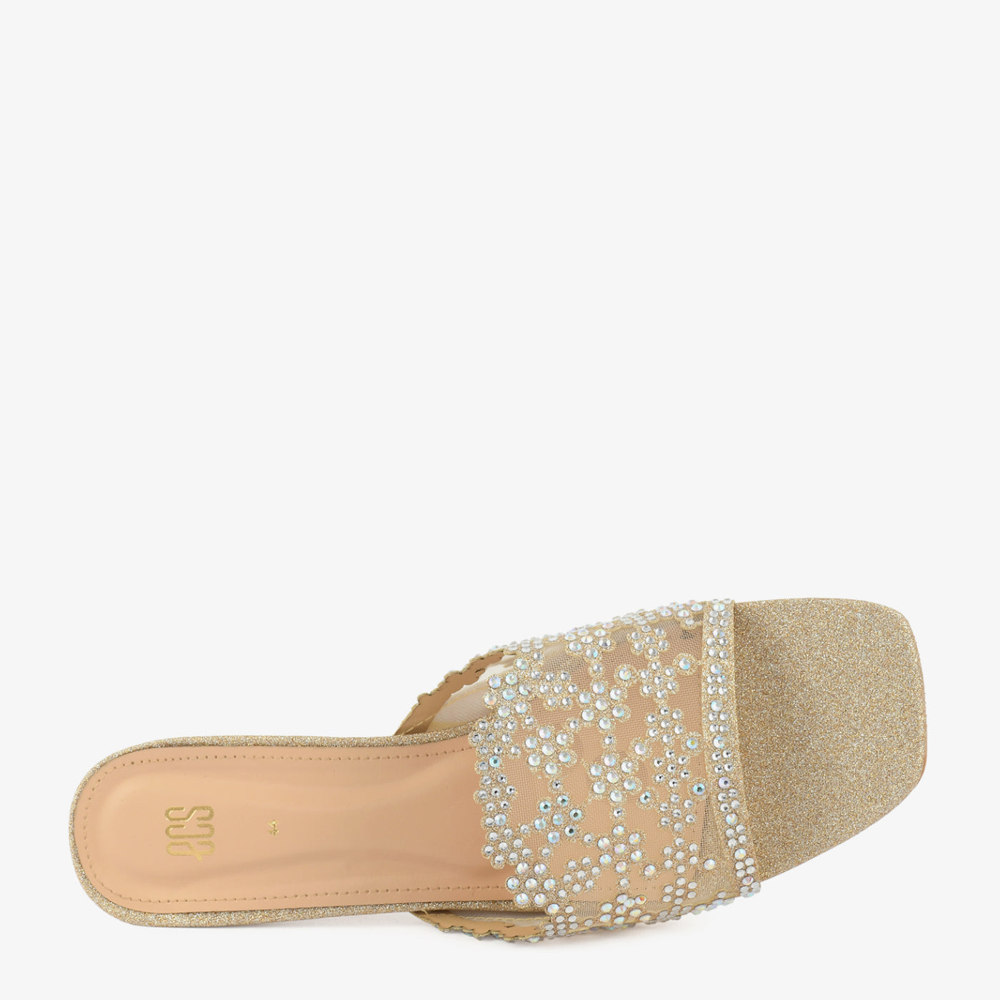 - Design: Wide mesh strap block heel slipper with continuous crystal flower and vine motif across the full vamp on a glitter block heel