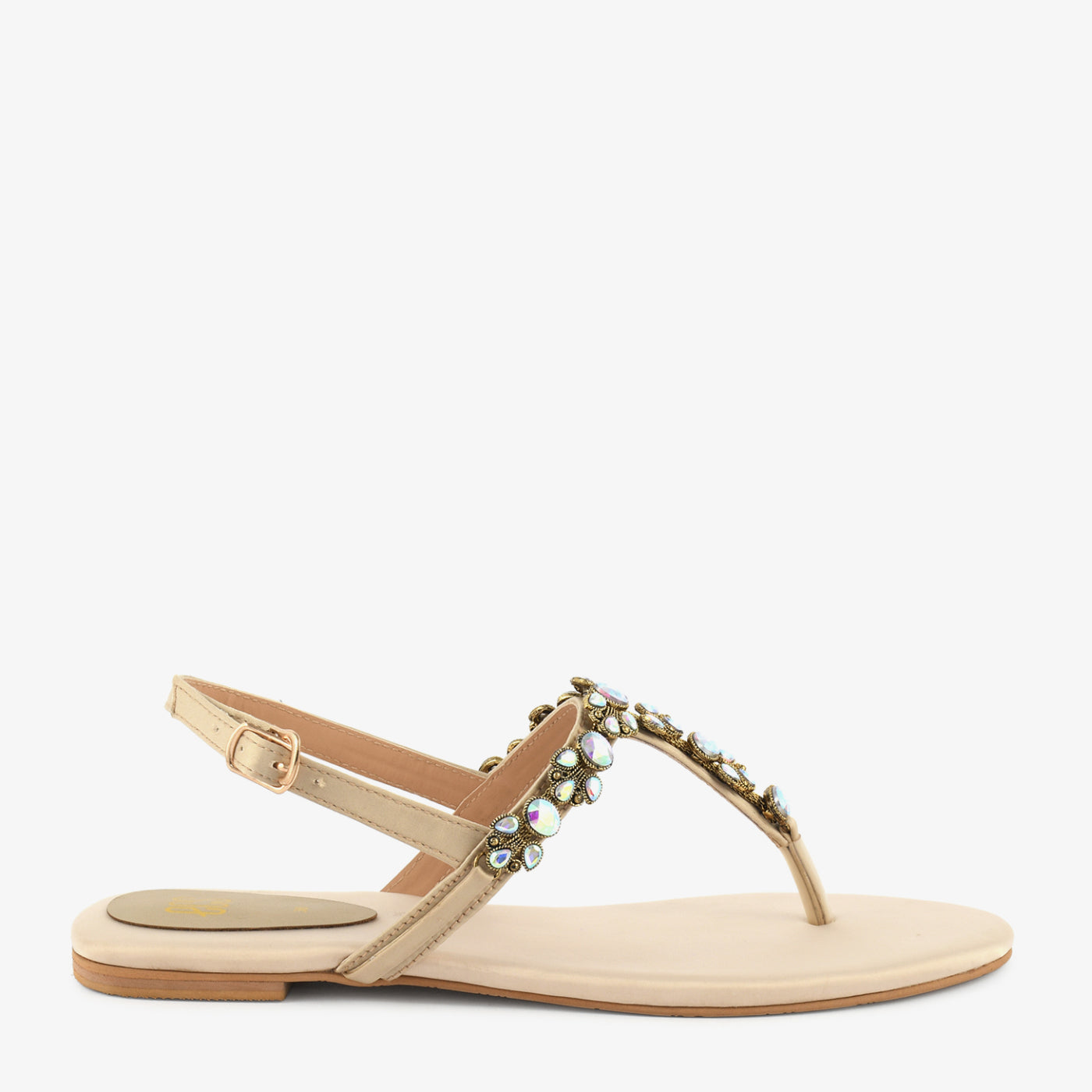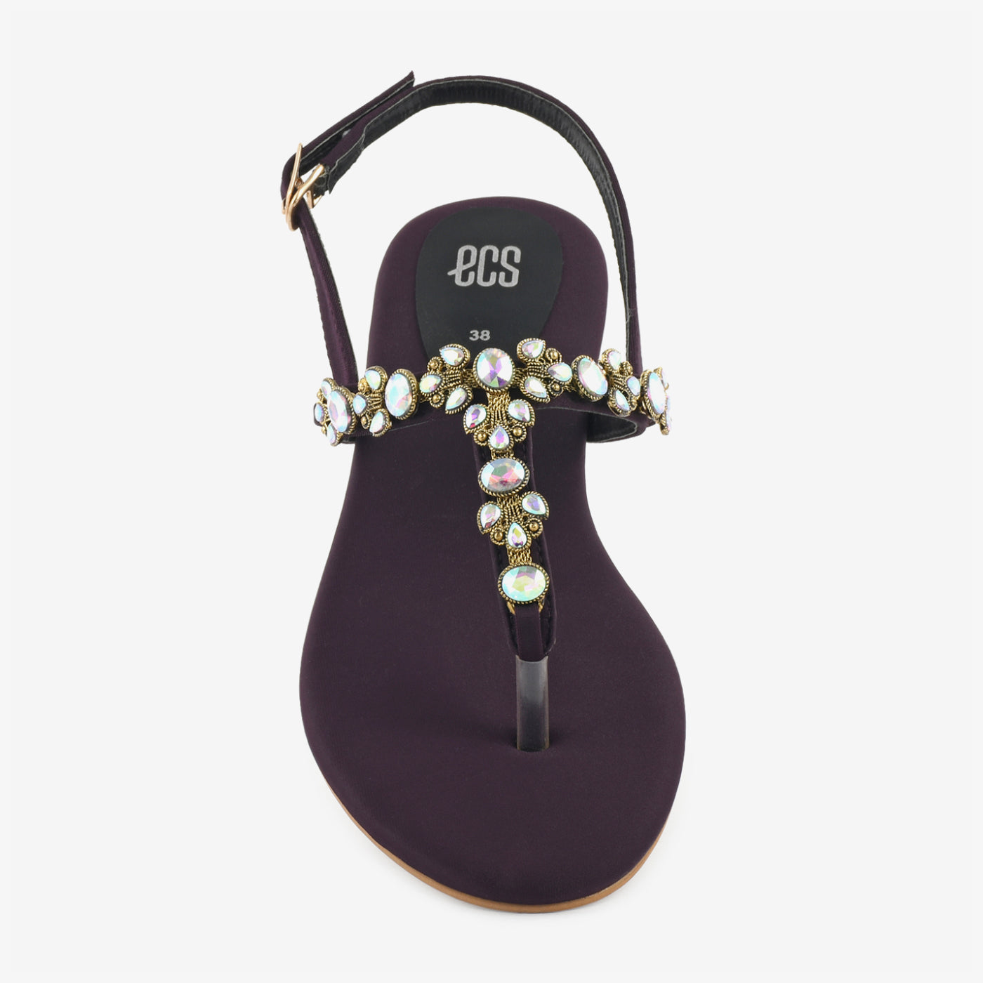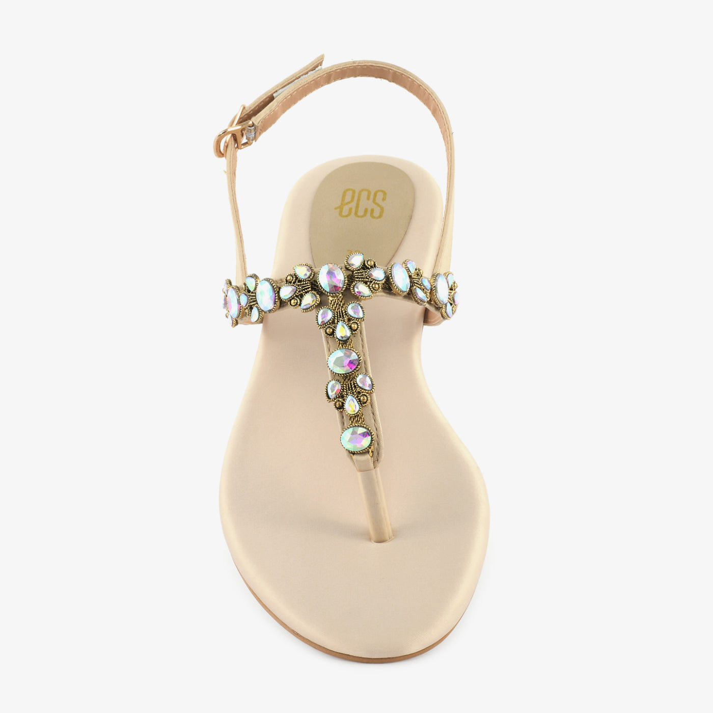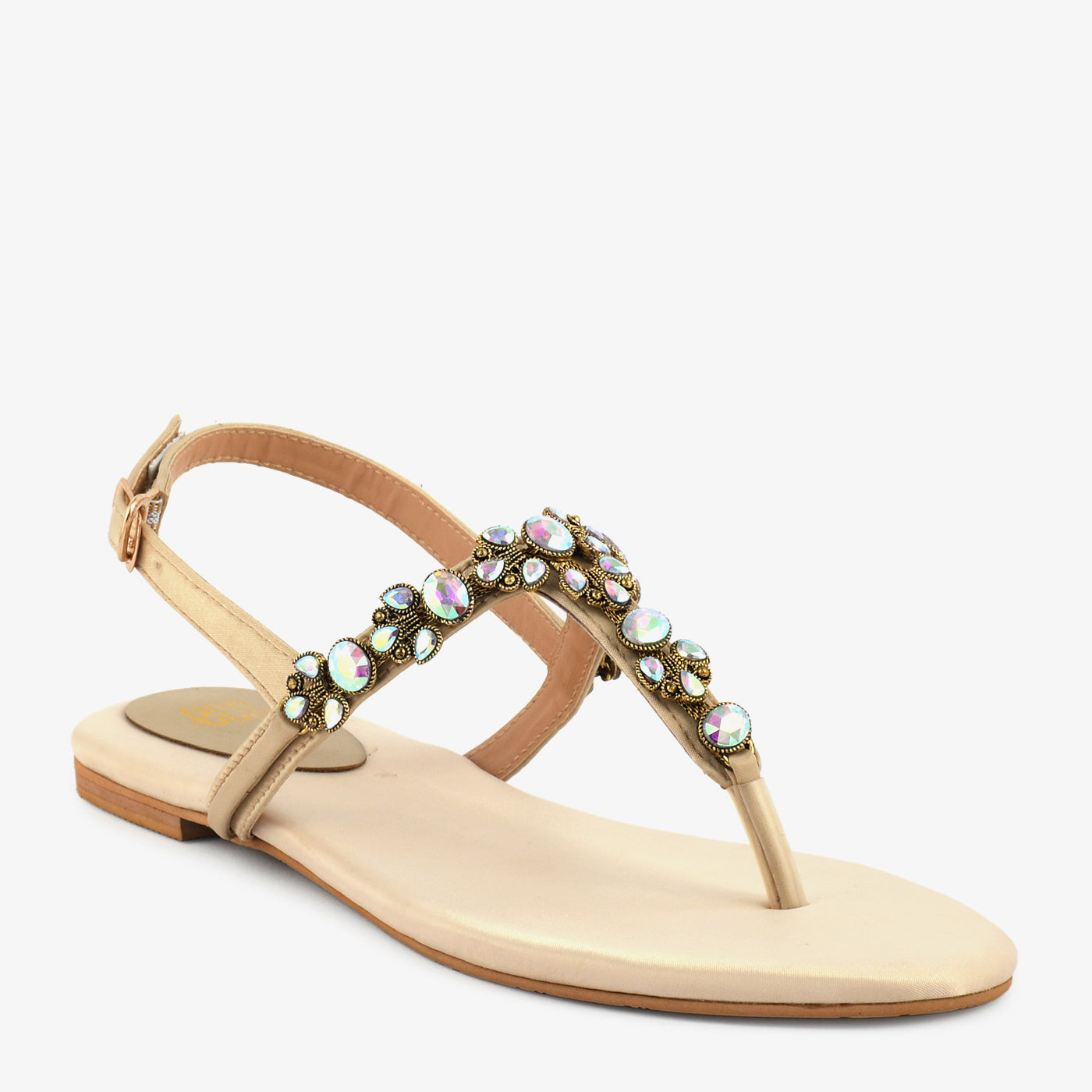 This elegant women’s sandal features a graceful T-strap design adorned with shimmering stone embellishments that create a striking focal point. The intricate detailing along the upper adds a refined and festive touch, making it perfect for special occasions. Designed with a soft, cushioned footbed, it ensures comfortable wear throughout the day or evening. The adjustable back strap provides a secure and personalized fit, while the flat sole offers ease of movement and stability. Combining delicate craftsmanship with everyday comfort, this sandal is a versatile addition to any wardrobe.