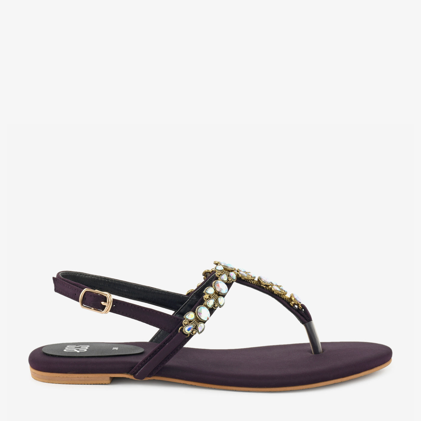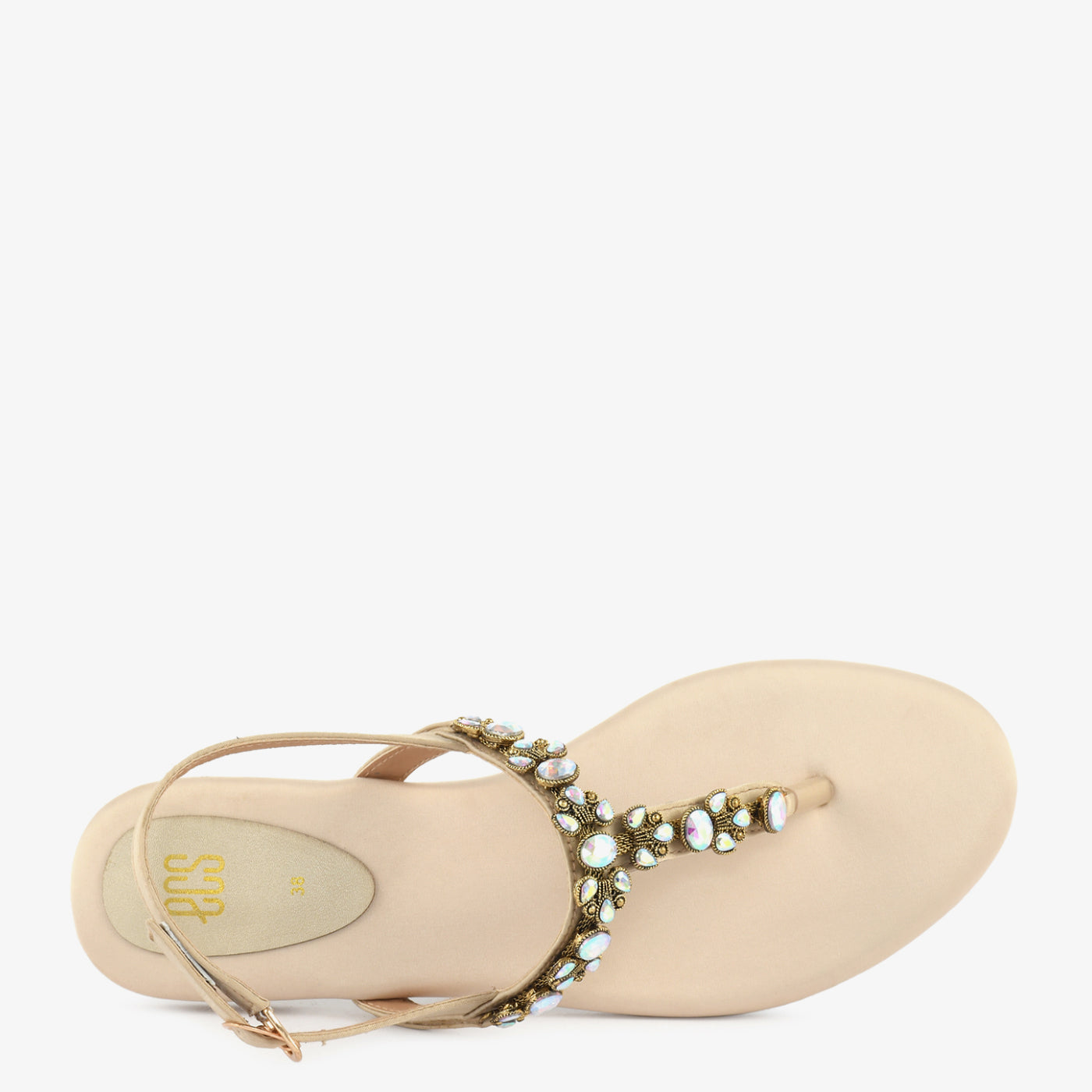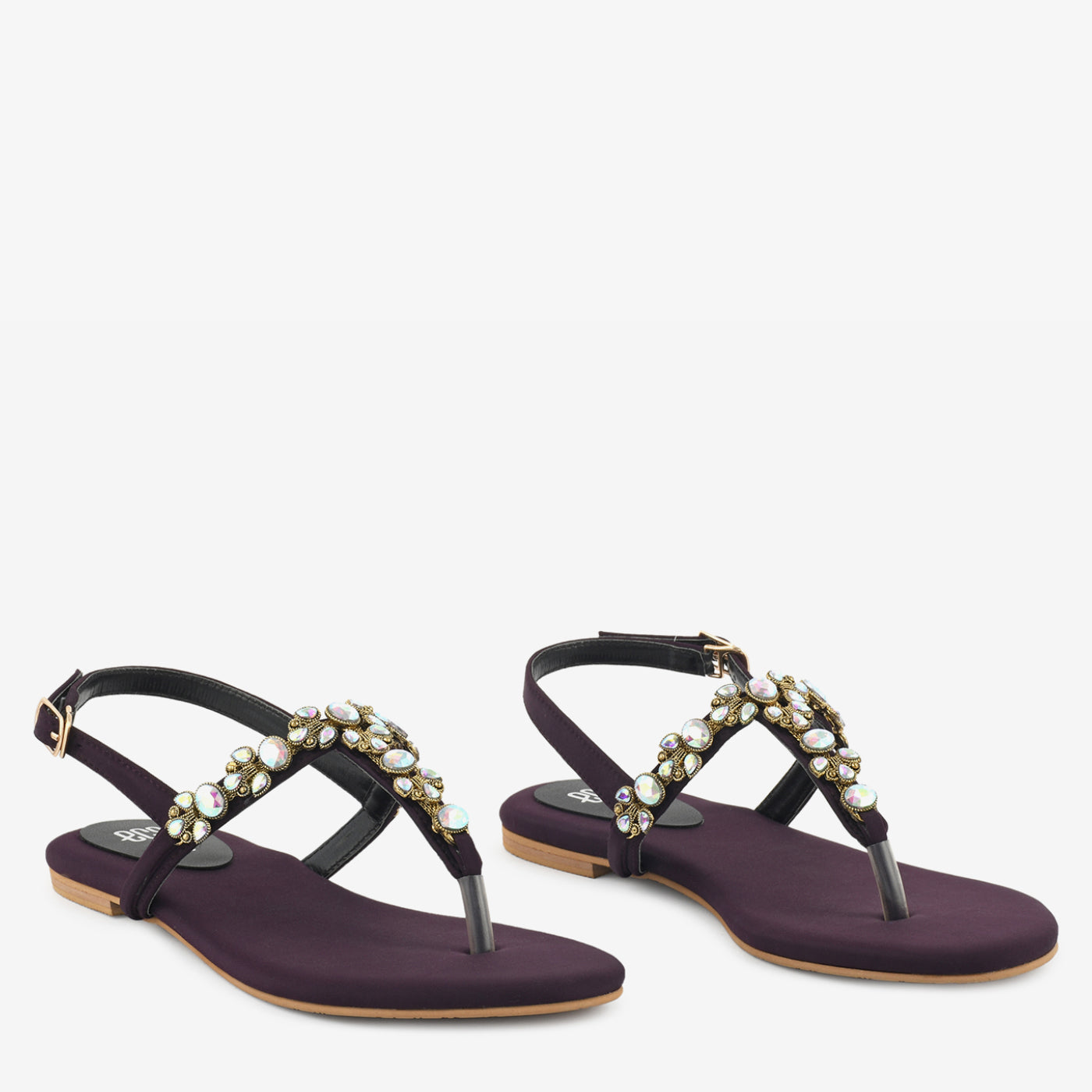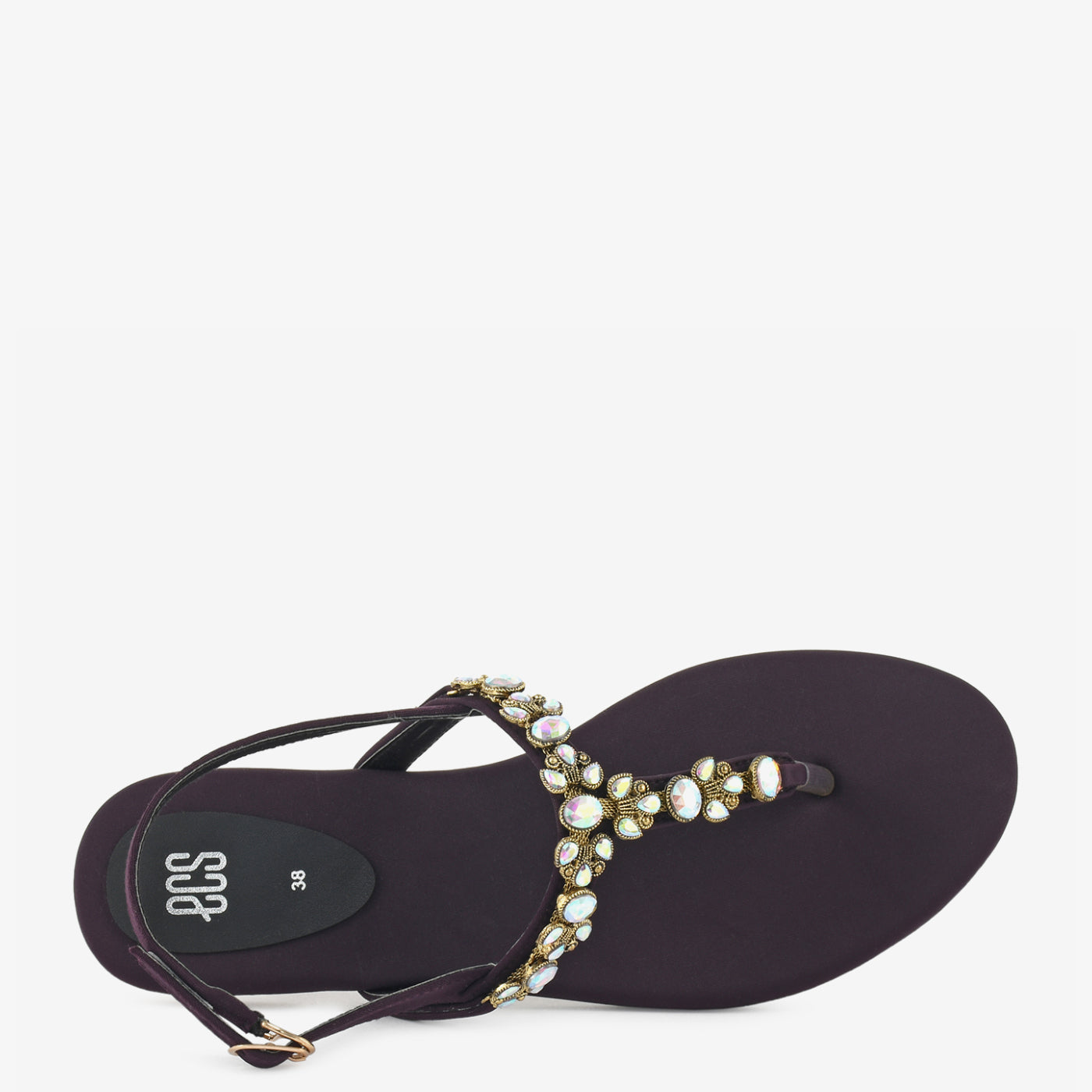 This elegant women’s sandal features a graceful T-strap design adorned with shimmering stone embellishments that create a striking focal point. The intricate detailing along the upper adds a refined and festive touch, making it perfect for special occasions. Designed with a soft, cushioned footbed, it ensures comfortable wear throughout the day or evening. The adjustable back strap provides a secure and personalized fit, while the flat sole offers ease of movement and stability. Combining delicate craftsmanship with everyday comfort, this sandal is a versatile addition to any wardrobe.