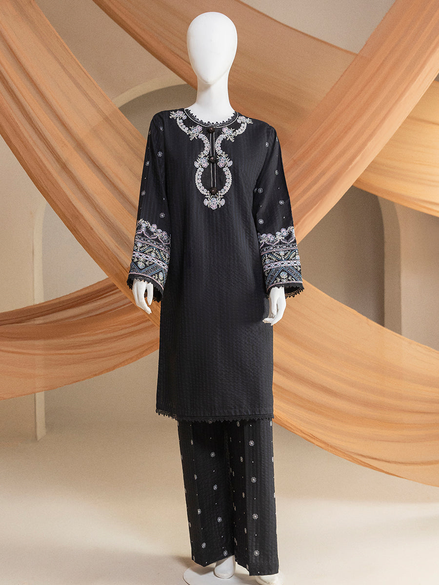 Gentle Weave is a 2-piece outfit crafted with a dobby shirt and linen trouser. The medium-length basic shirt paired with trousers creates a refined and comfortable silhouette. Dyed and embroidered details add elegance, making it perfect for modest everyday and semi-formal wear.