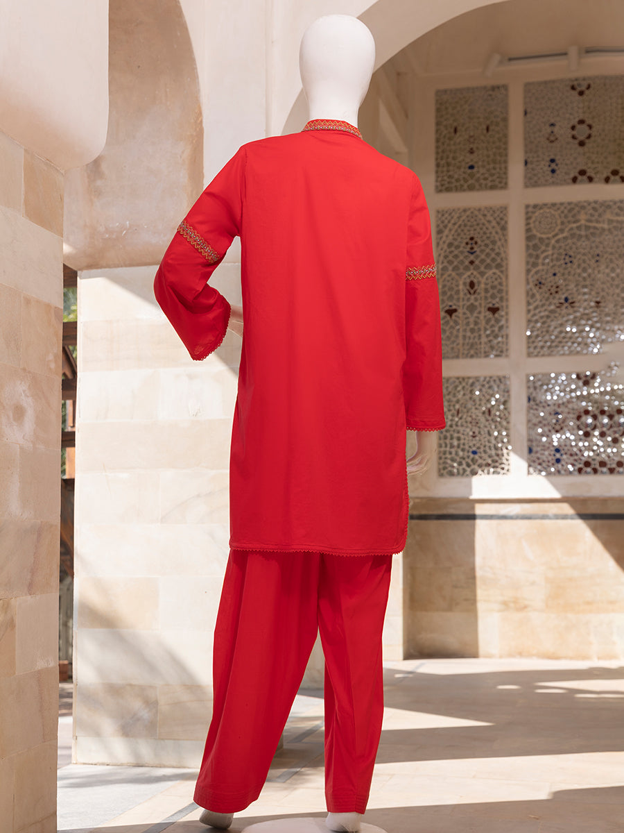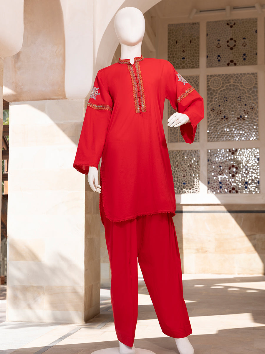 Royal Ember 2 Piece is a beautifully tailored outfit crafted from premium Lawn and Cambric fabric, offering breathable comfort with a bold yet refined everyday appeal. The basic shirt paired with a matching shalwar creates a balanced and modest silhouette, perfect for regular wear. Elegant embroidery on the neckline and detailed sleeve accents add a graceful statement, while the clean hem finish enhances its polished look. The lightweight fabric ensures ease of movement and lasting comfort throughout the day. Designed with simplicity and charm, this outfit is ideal for casual gatherings, festive moments, and daily styling.