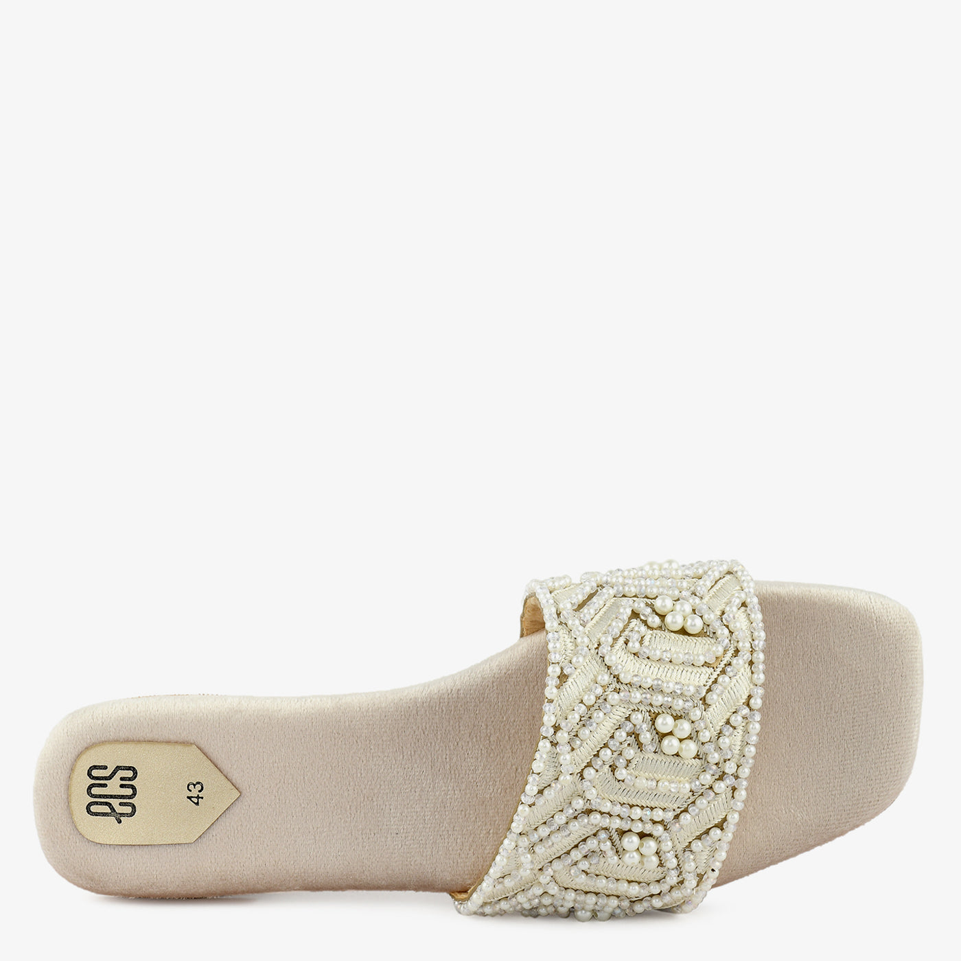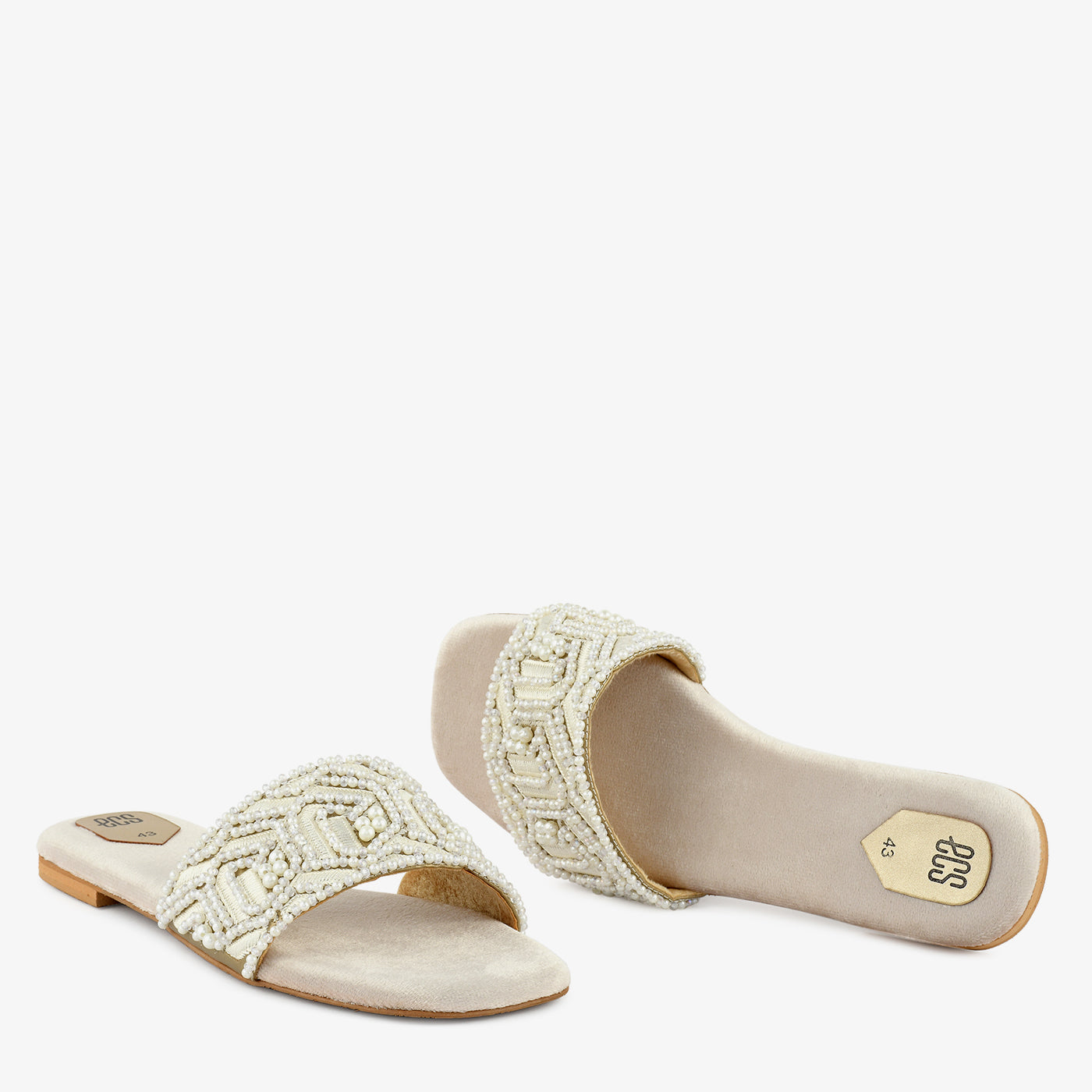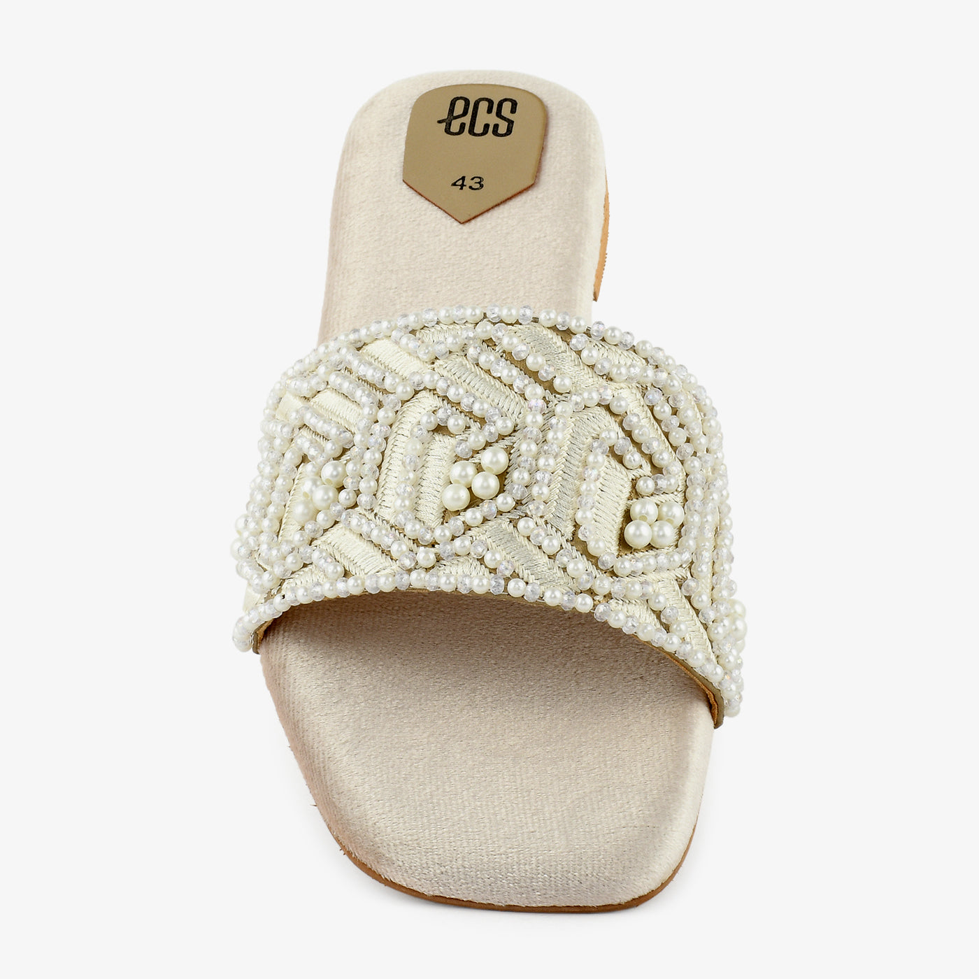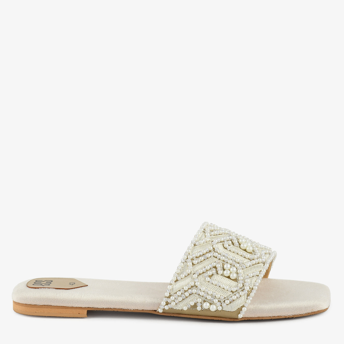 This flat slip-on features intricate pearl beading over a plush upper. Designed for special moments, it brings comfort and craft together.