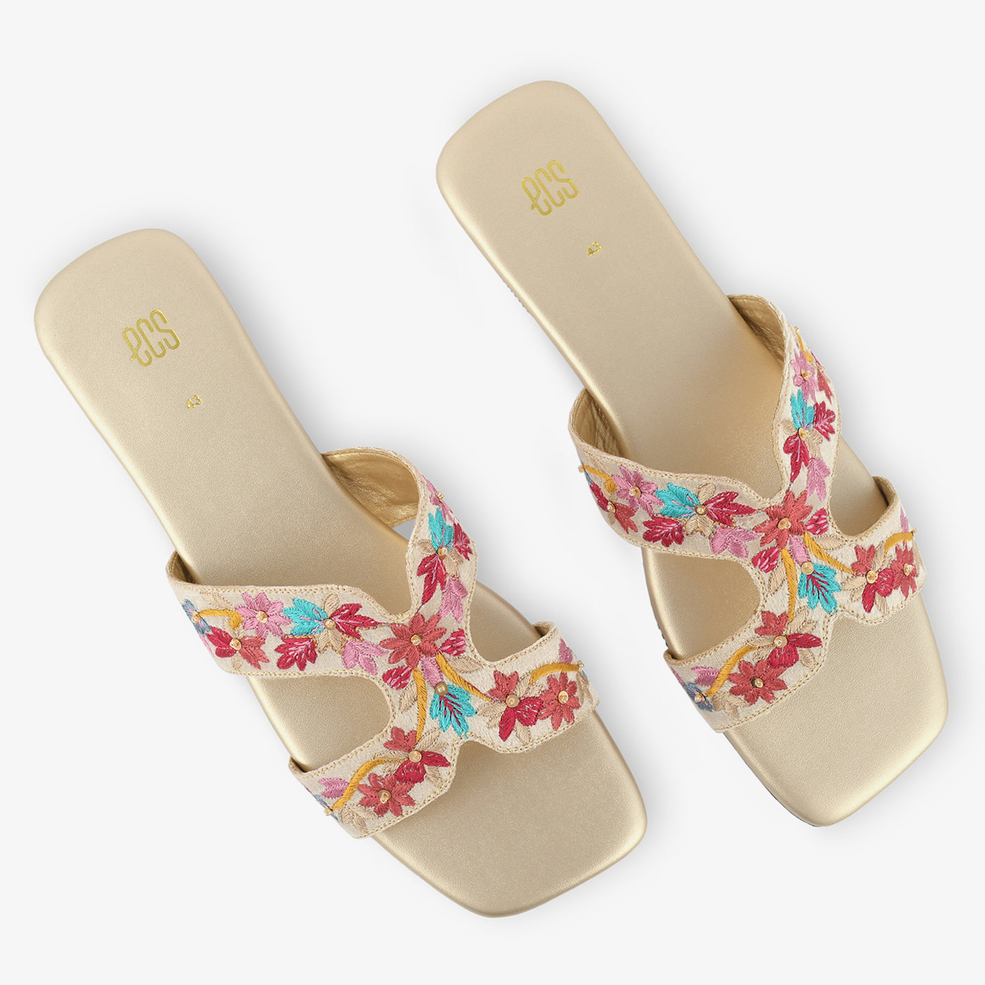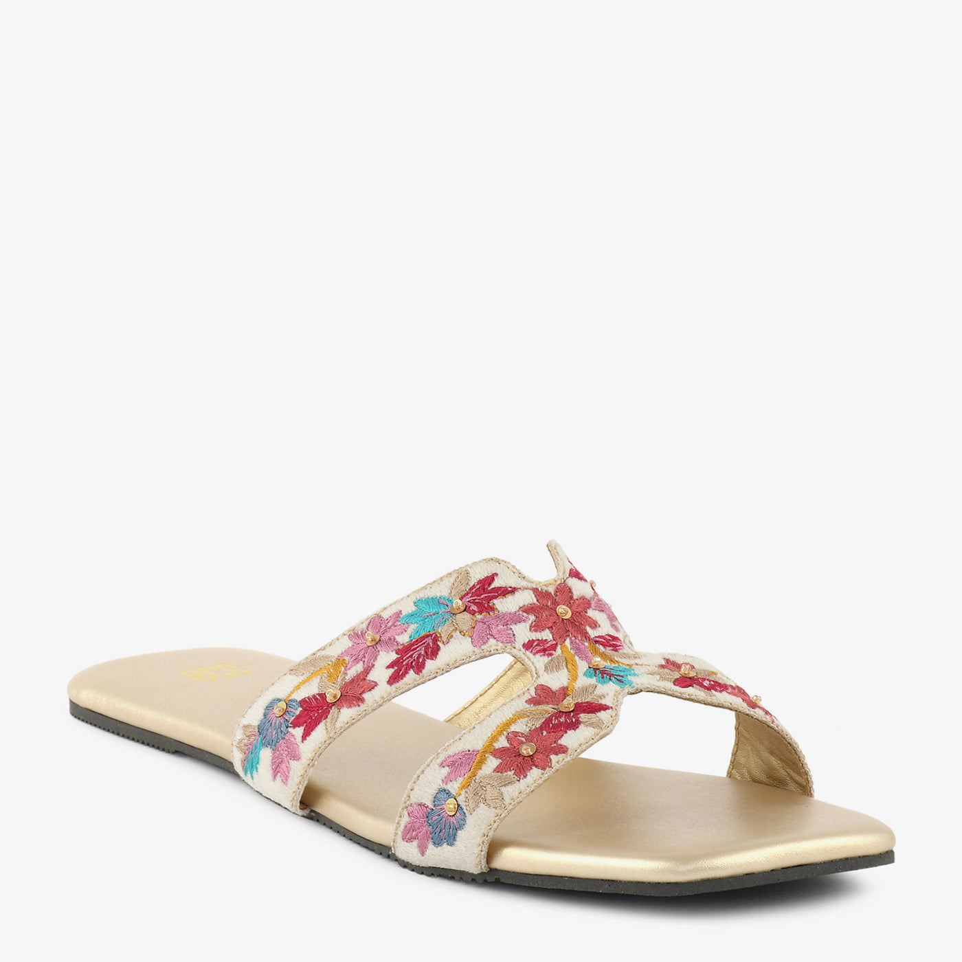 A festive slipper adorned with vibrant threadwork in a cross-strap silhouette. Light yet detailed, it's perfect for ethnic or fusion dressing.
