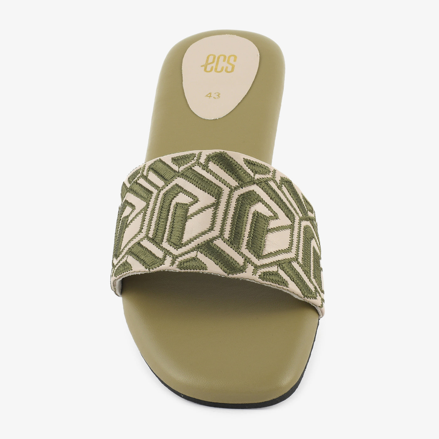 A flat slide with a softly cushioned footbed and geometric embroidery on the band. This understated piece is designed for comfort with quiet style.