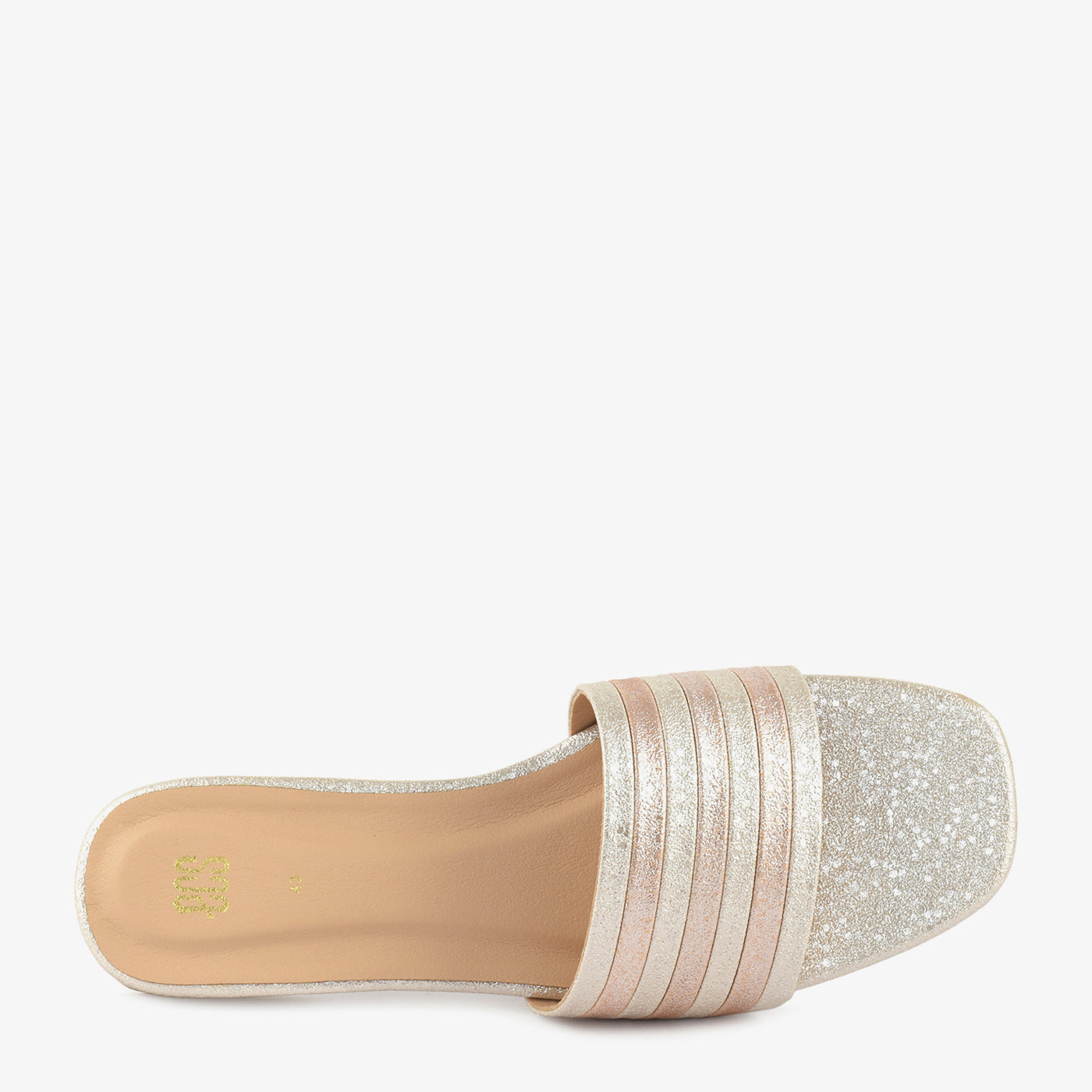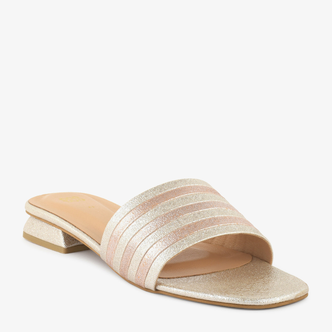Slide into effortless elegance with these shimmering golden slippers. The broad strap features subtle stripes, adding a touch of texture and visual appeal. The comfortable, low block heel makes them perfect for both relaxed days and casual evenings around.