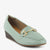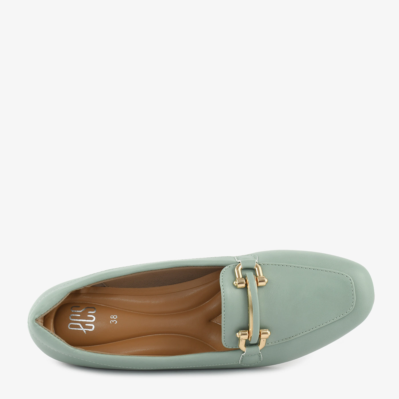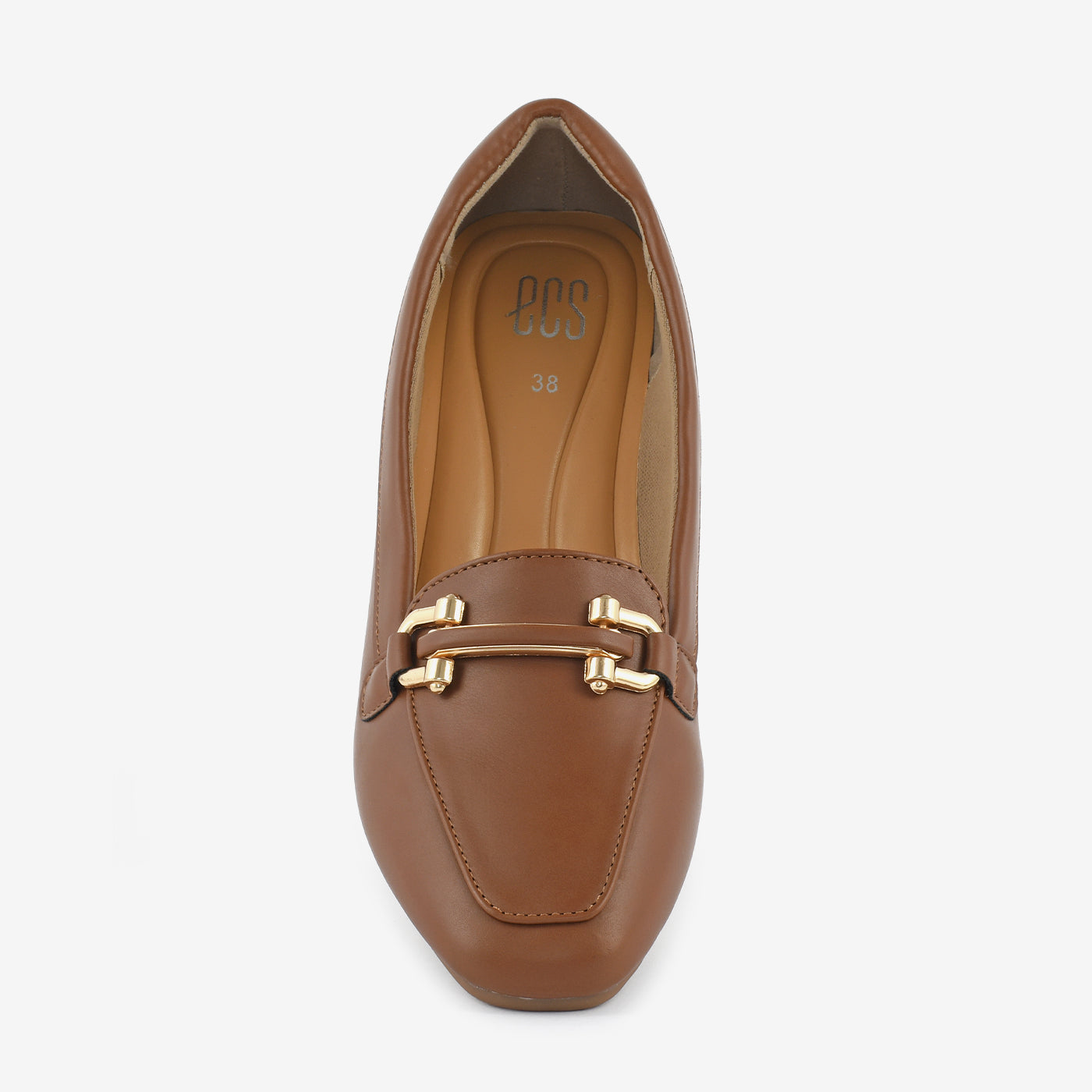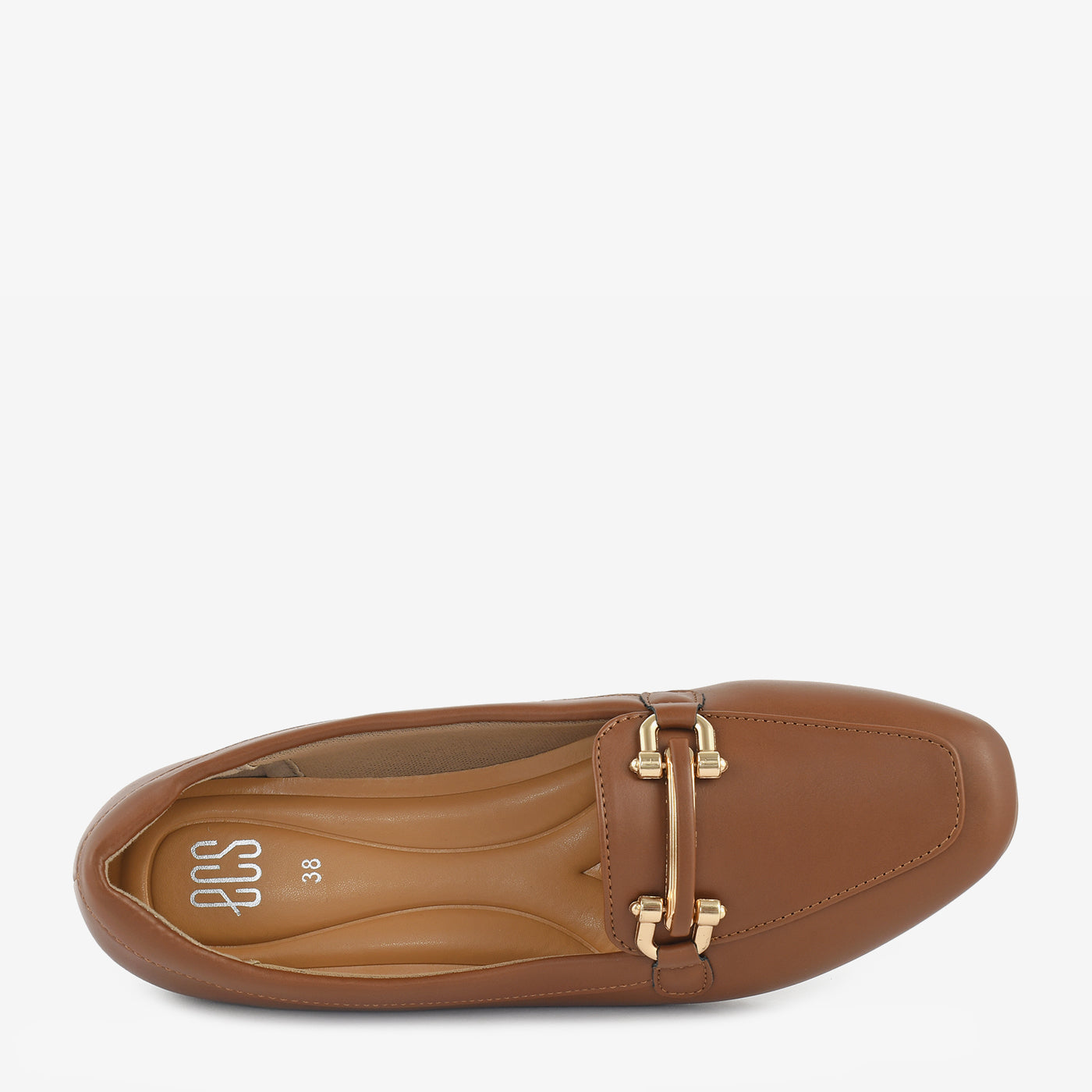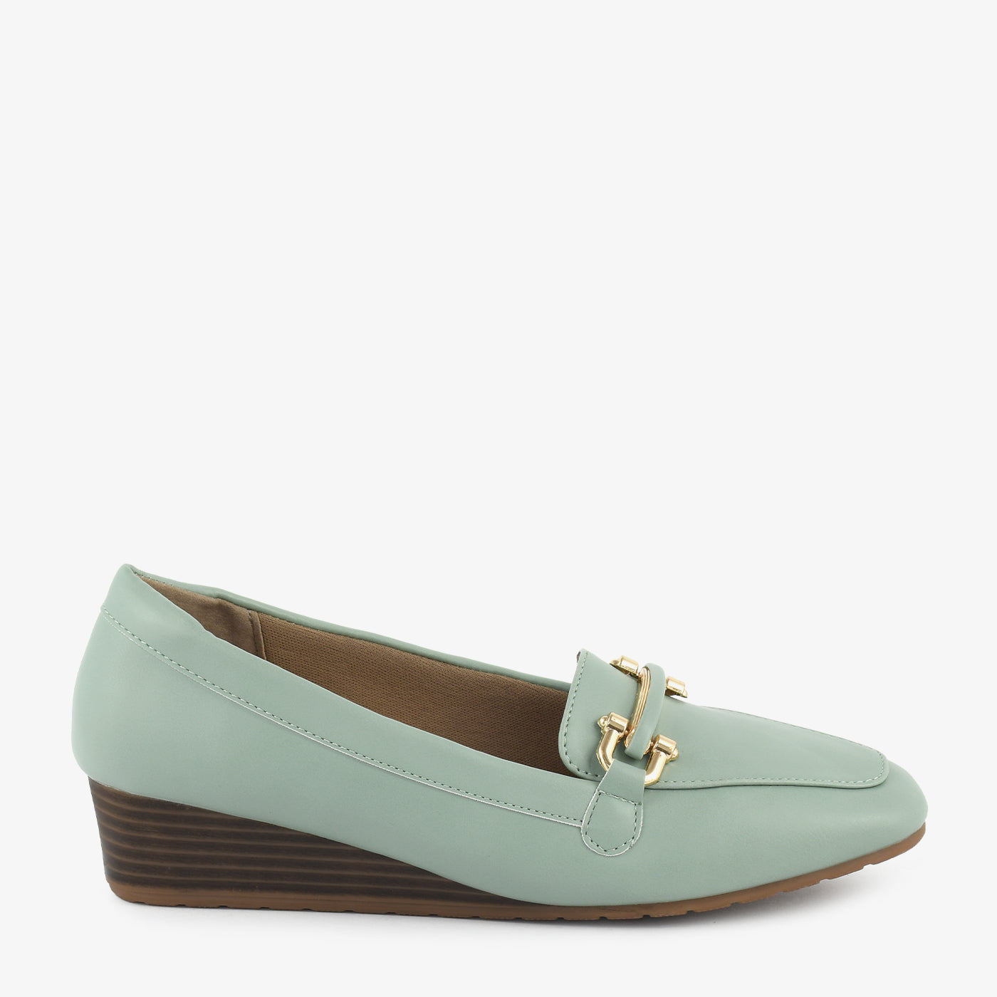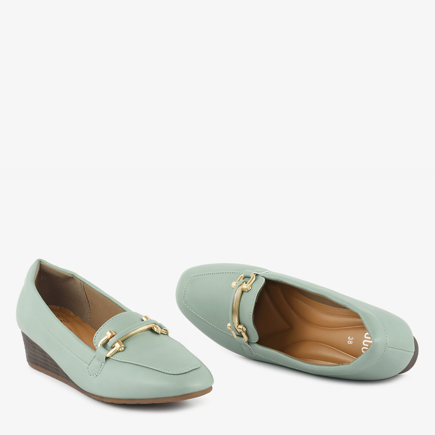 A wedge loafer with a gold-tone buckle detail. Offers modest height and maximum comfort for daily wear.