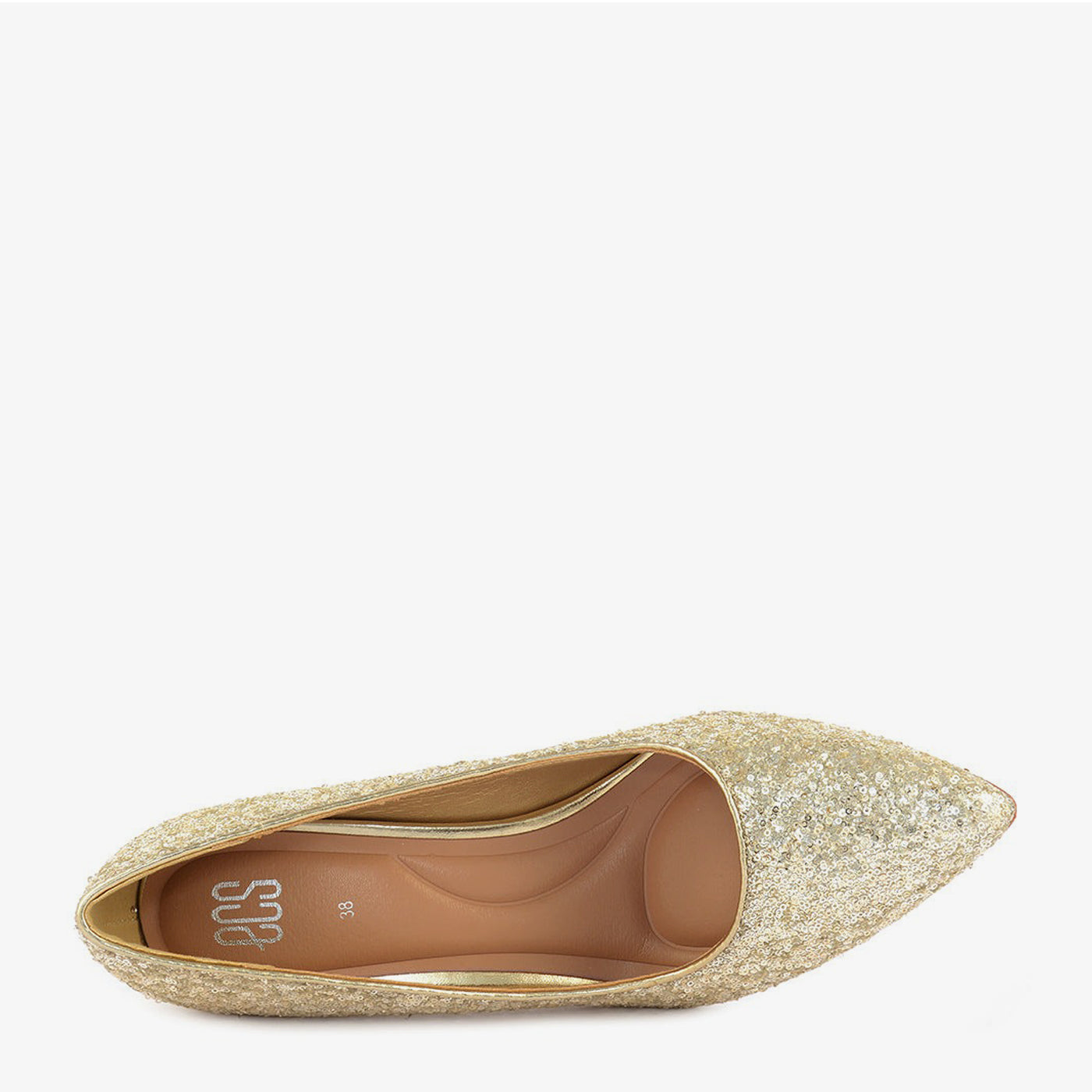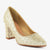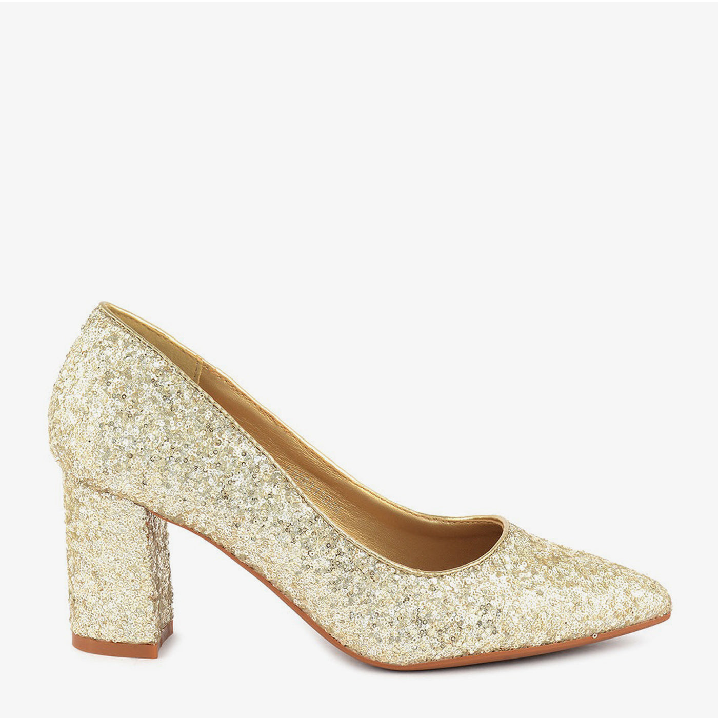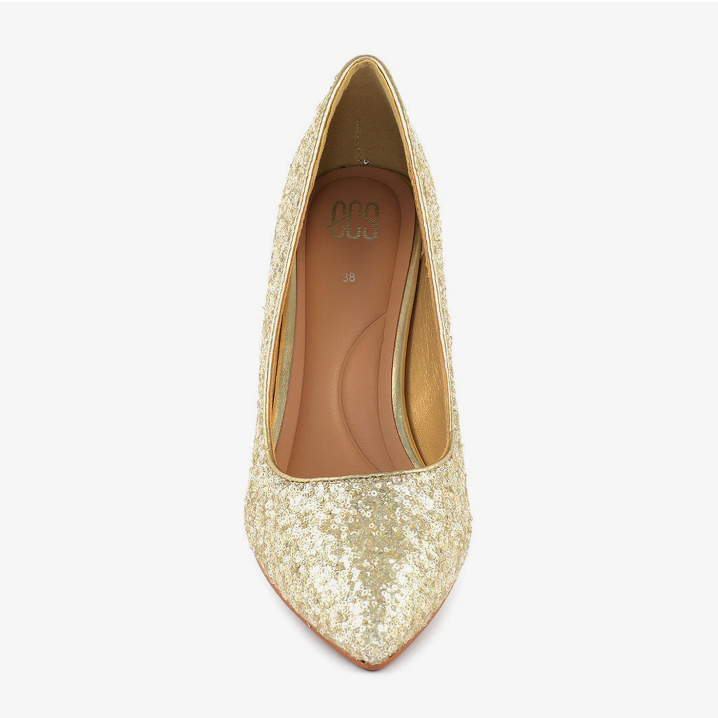A shimmery block heel that balances sparkle with structure. Its glittery surface and classic pointed toe make it perfect for formal occasions.