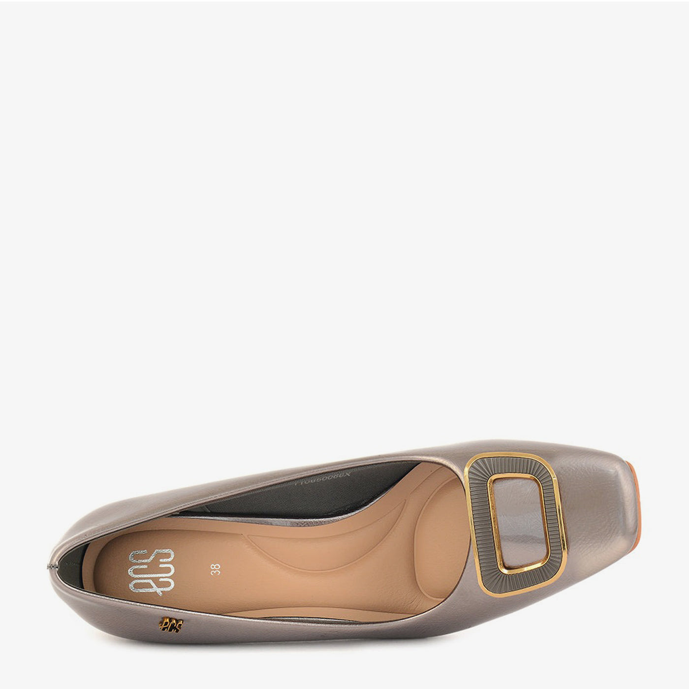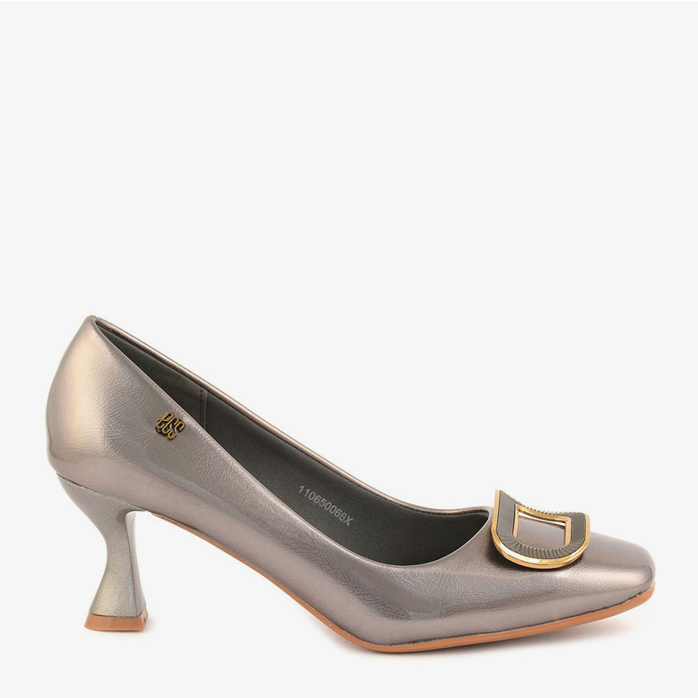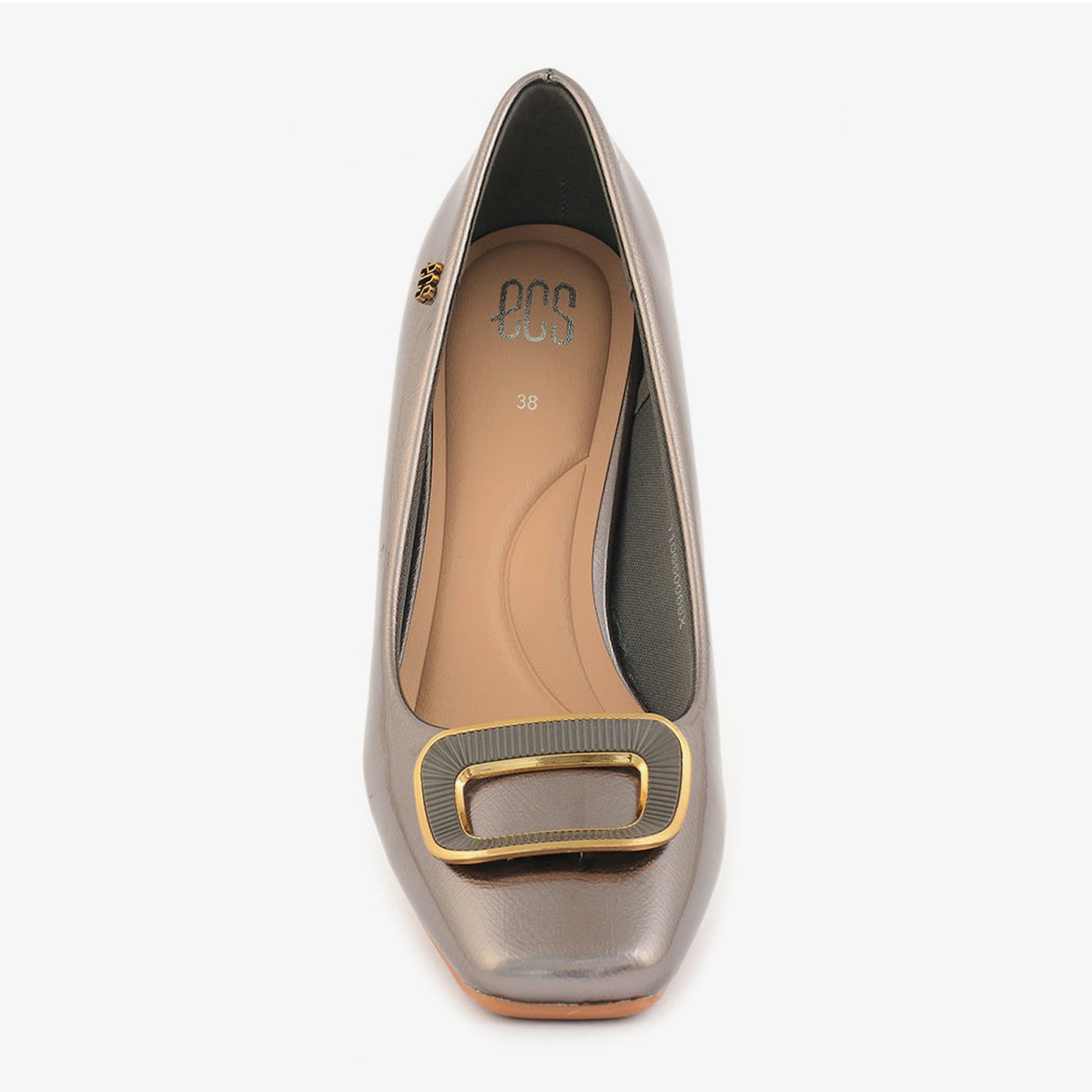 - Design: Square-toe pump with a sculpted heel and statement buckle