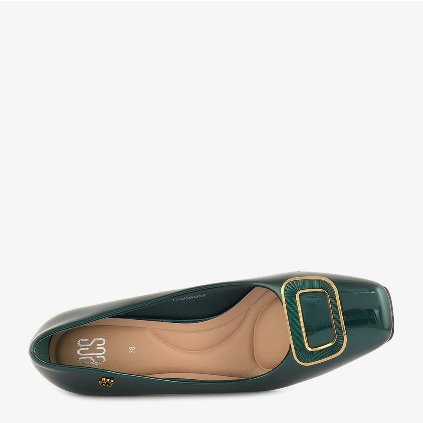 A stylish pump in a glossy emerald green. It features a square toe and a unique, sculpted heel. The statement buckle has a glossy green inlay framed by a gold-tone border, offering a contemporary and chic look.