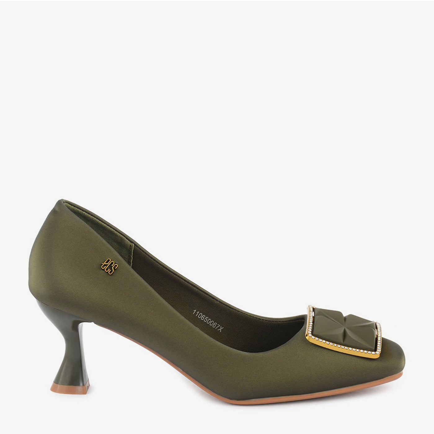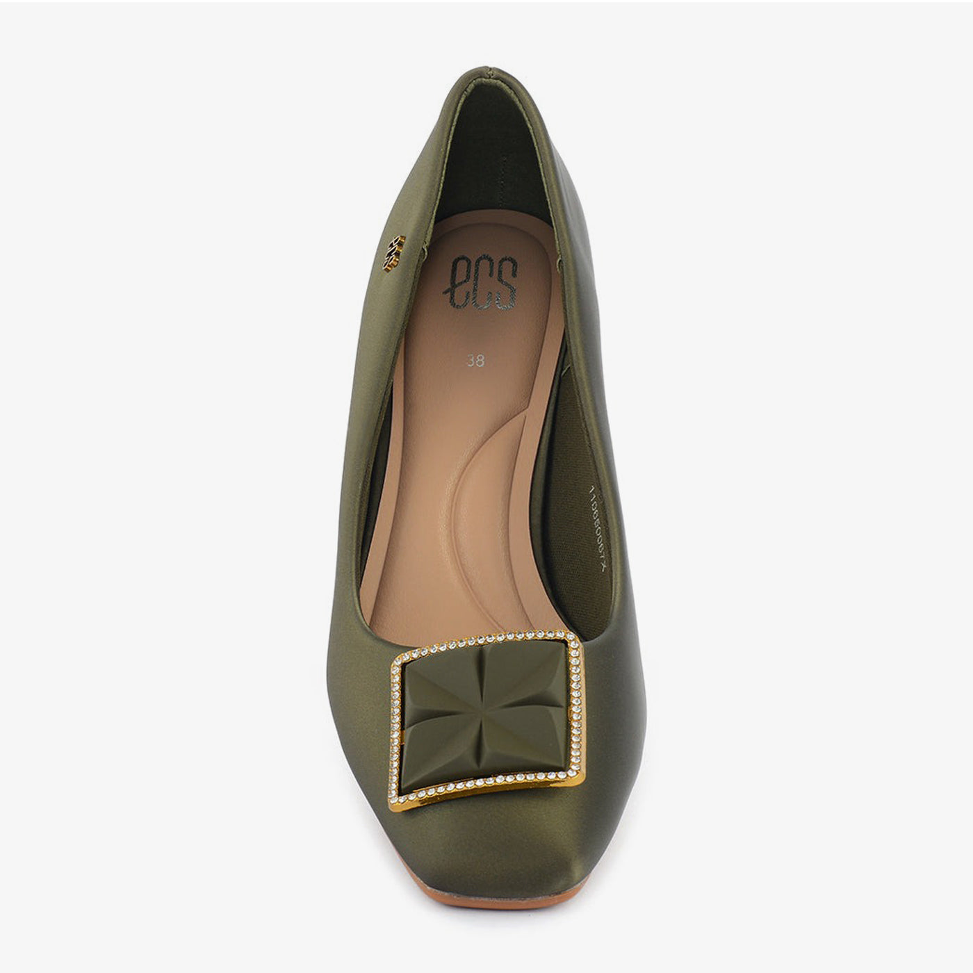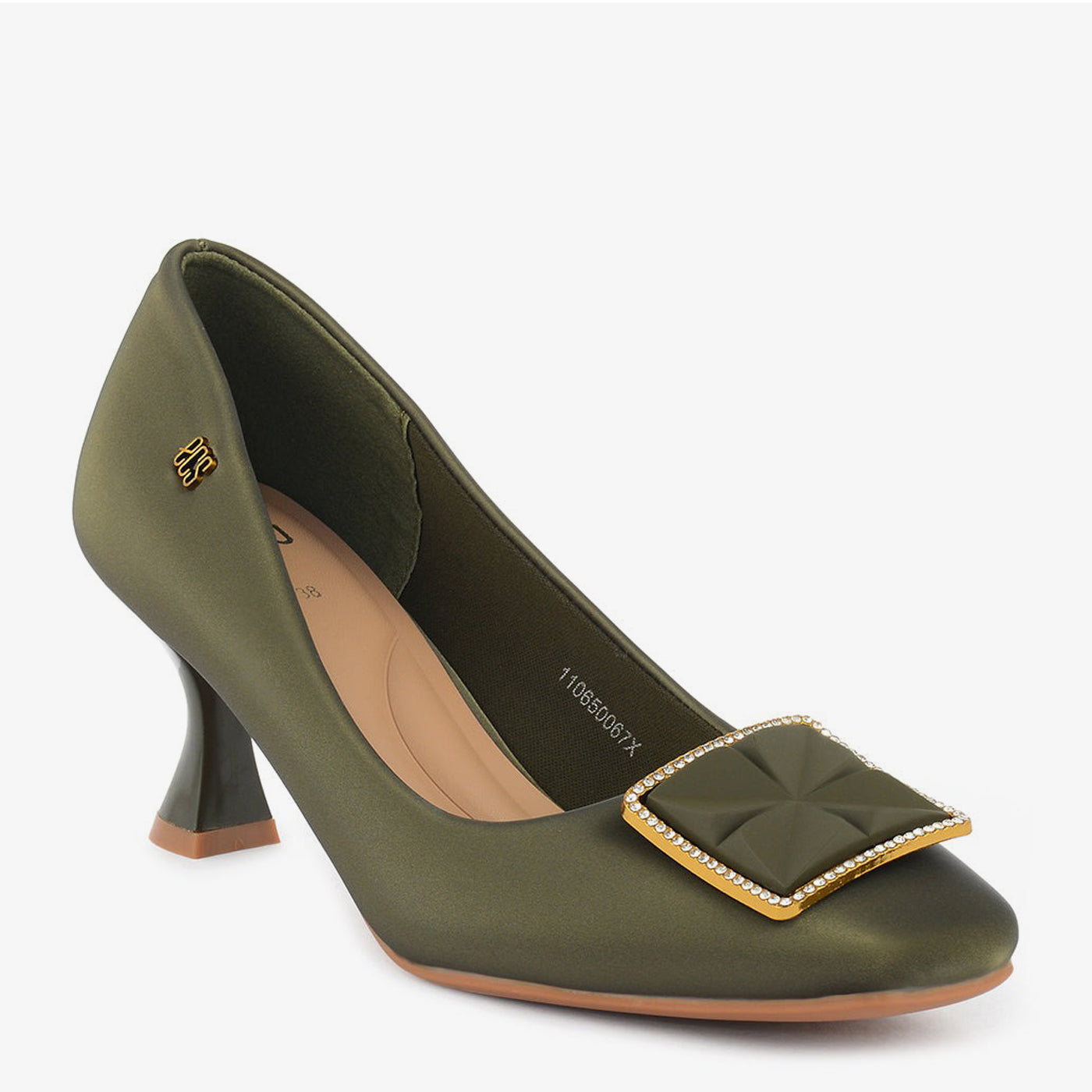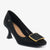 - Design: Rounded-toe pump with a sculpted heel and statement buckle