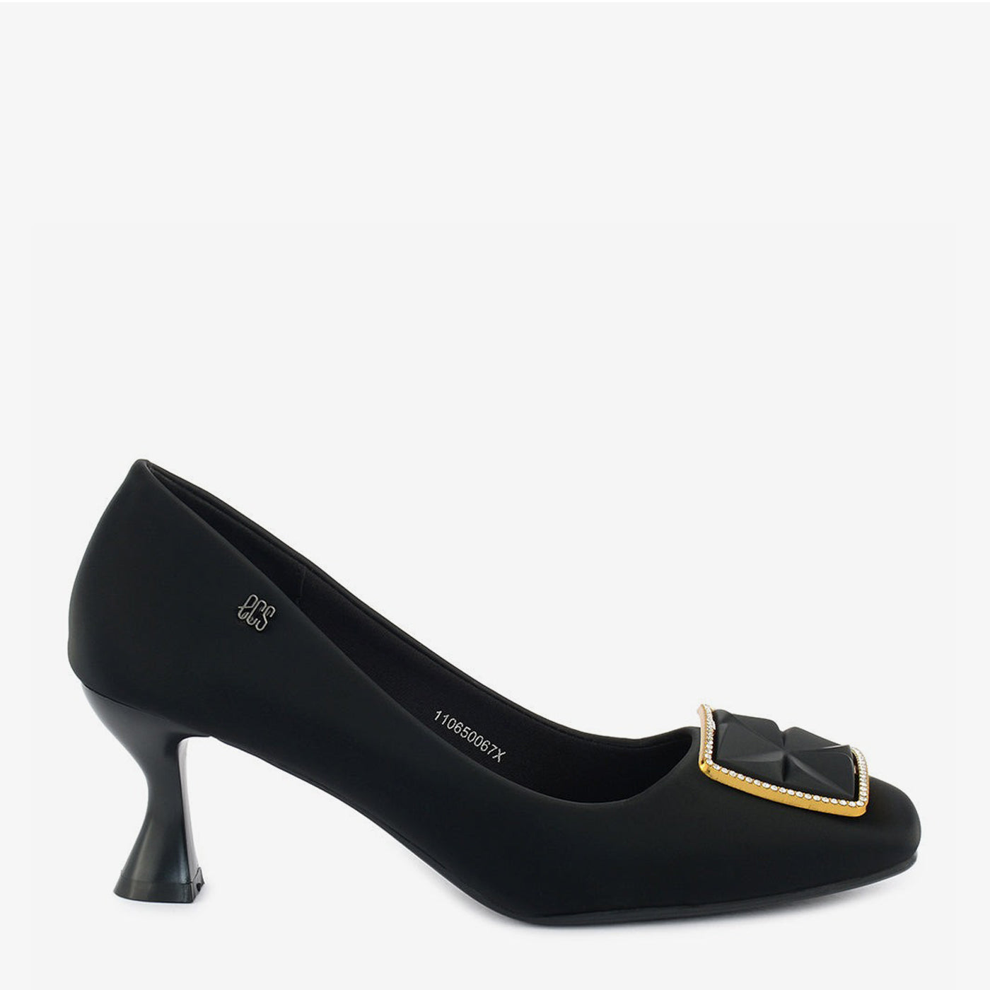 A sleek black pump with a rounded toe and a unique, sculpted heel. It features a statement square buckle adorned with a faceted center and a border of small...