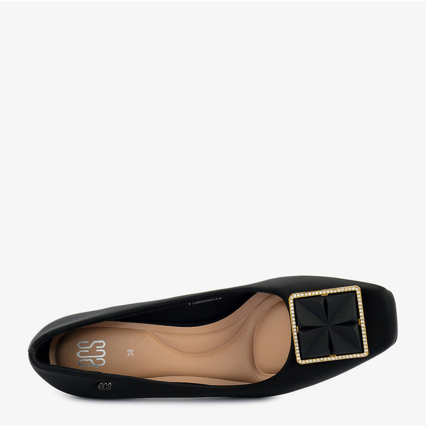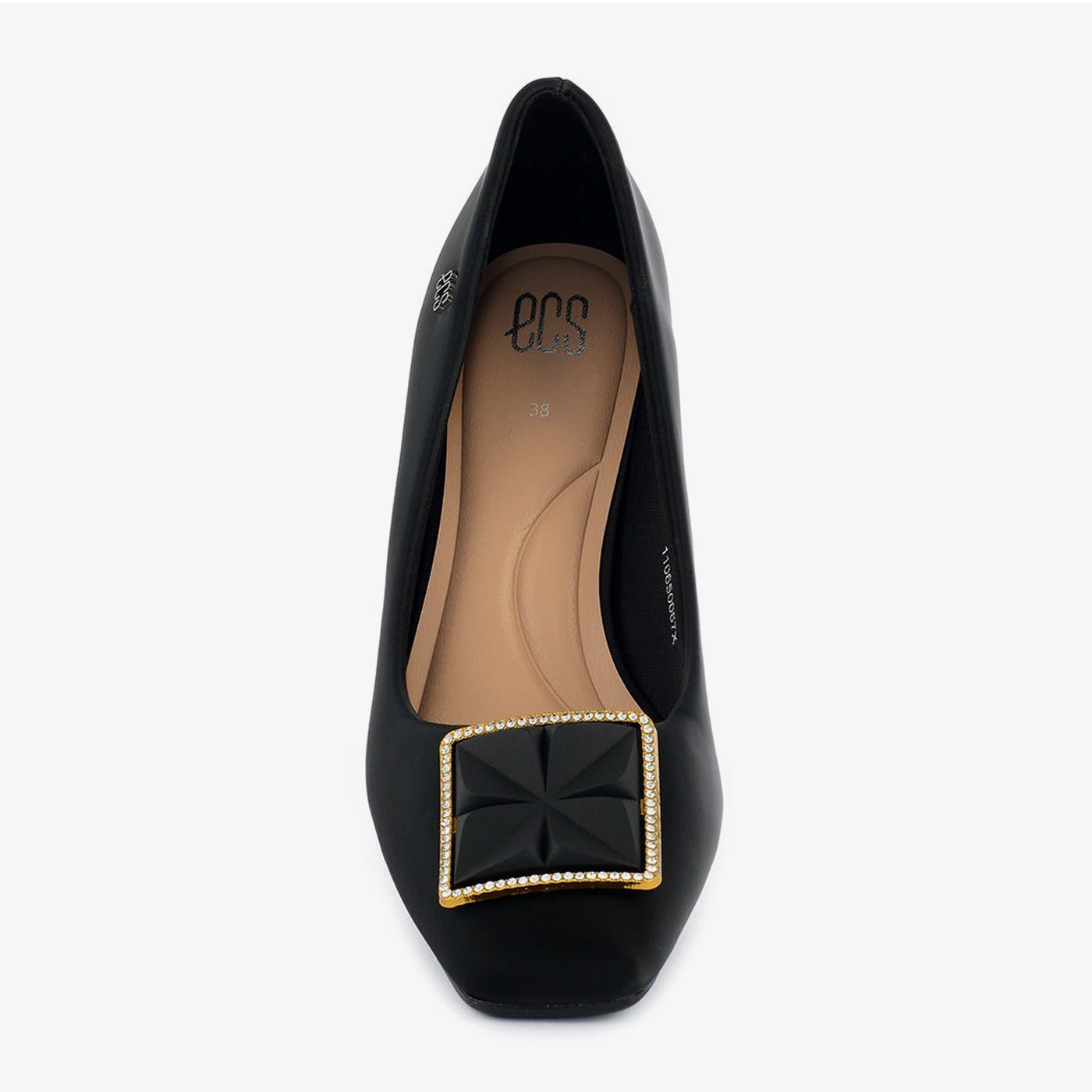 A sleek black pump with a rounded toe and a unique, sculpted heel. It features a statement square buckle adorned with a faceted center and a border of small crystals, adding a touch of modern elegance.