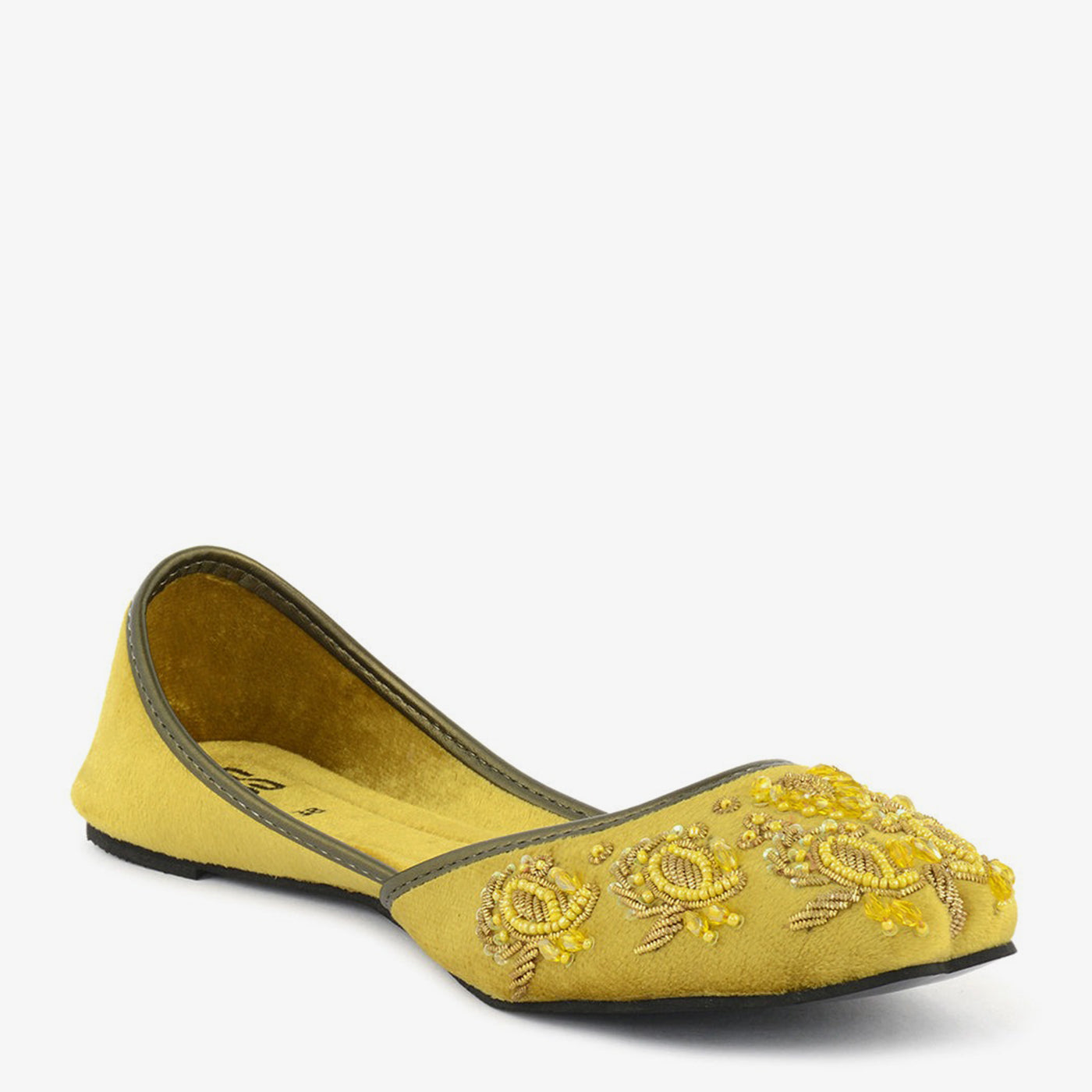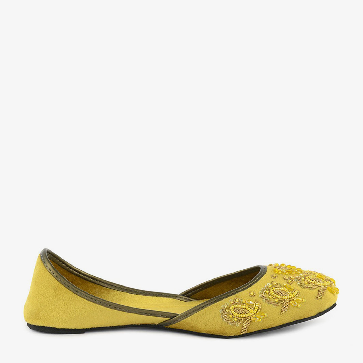 A flat, pointed-toe khussa featuring a cluster of raised floral designs made of small beads on the front. A detailed choice for a warm morning in Lahore.