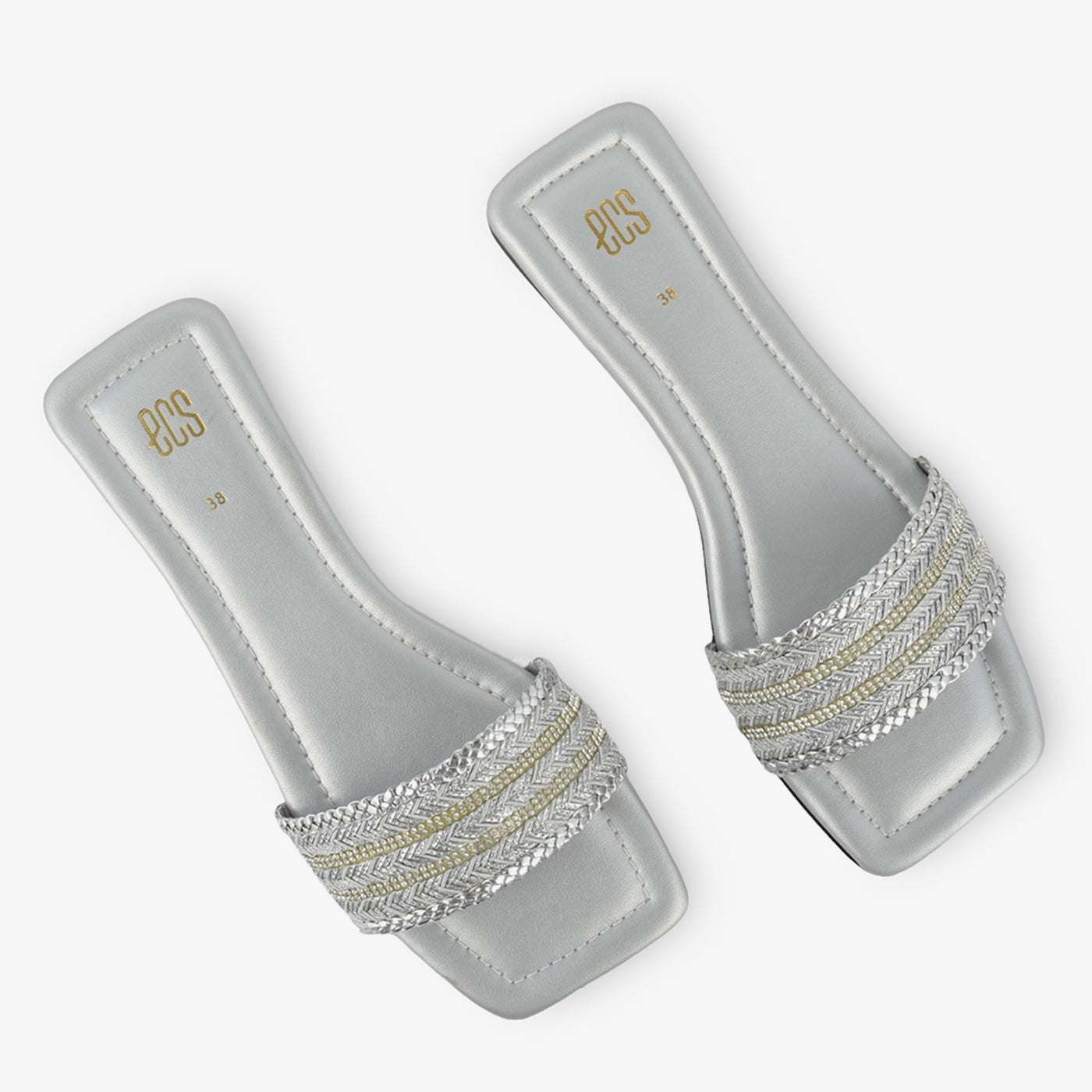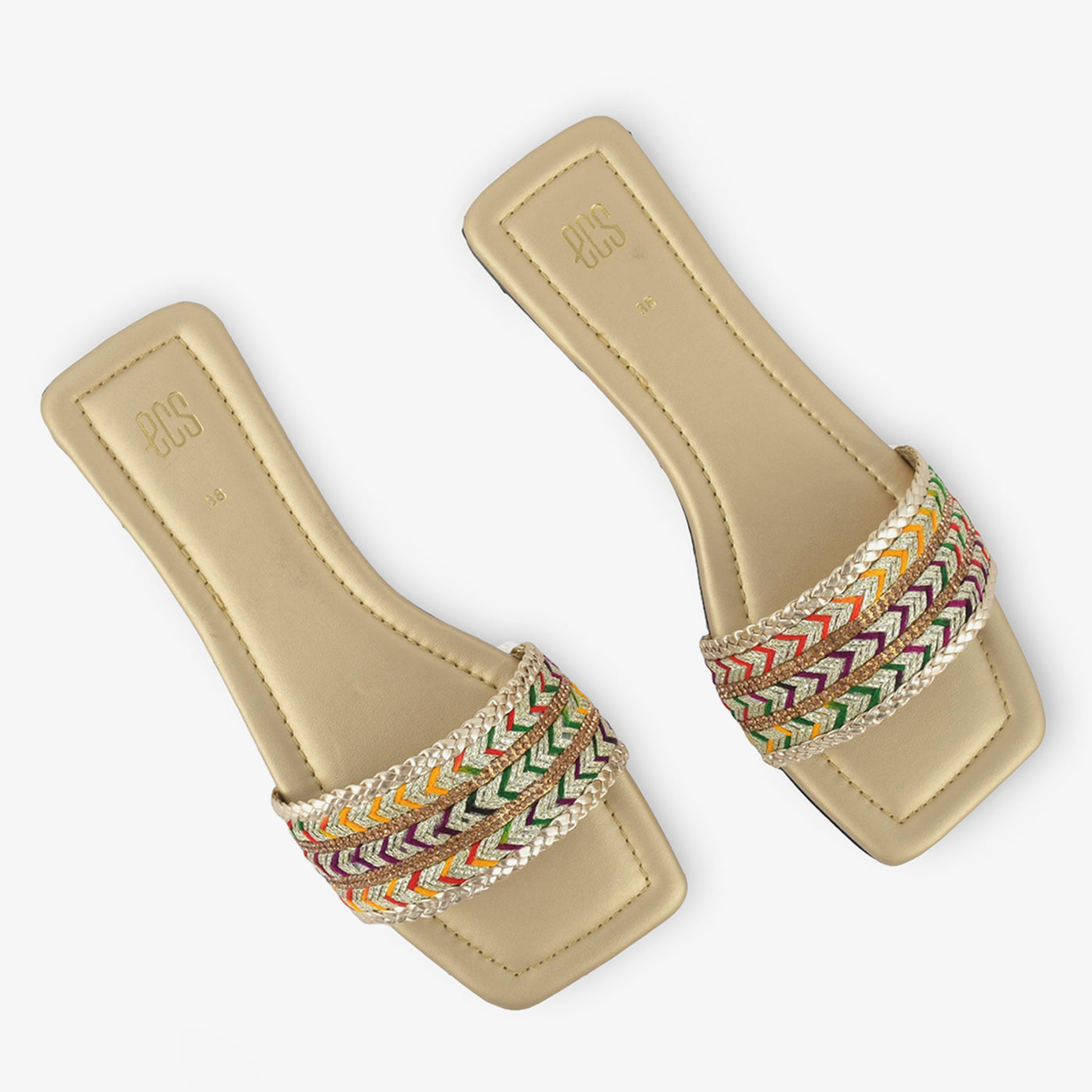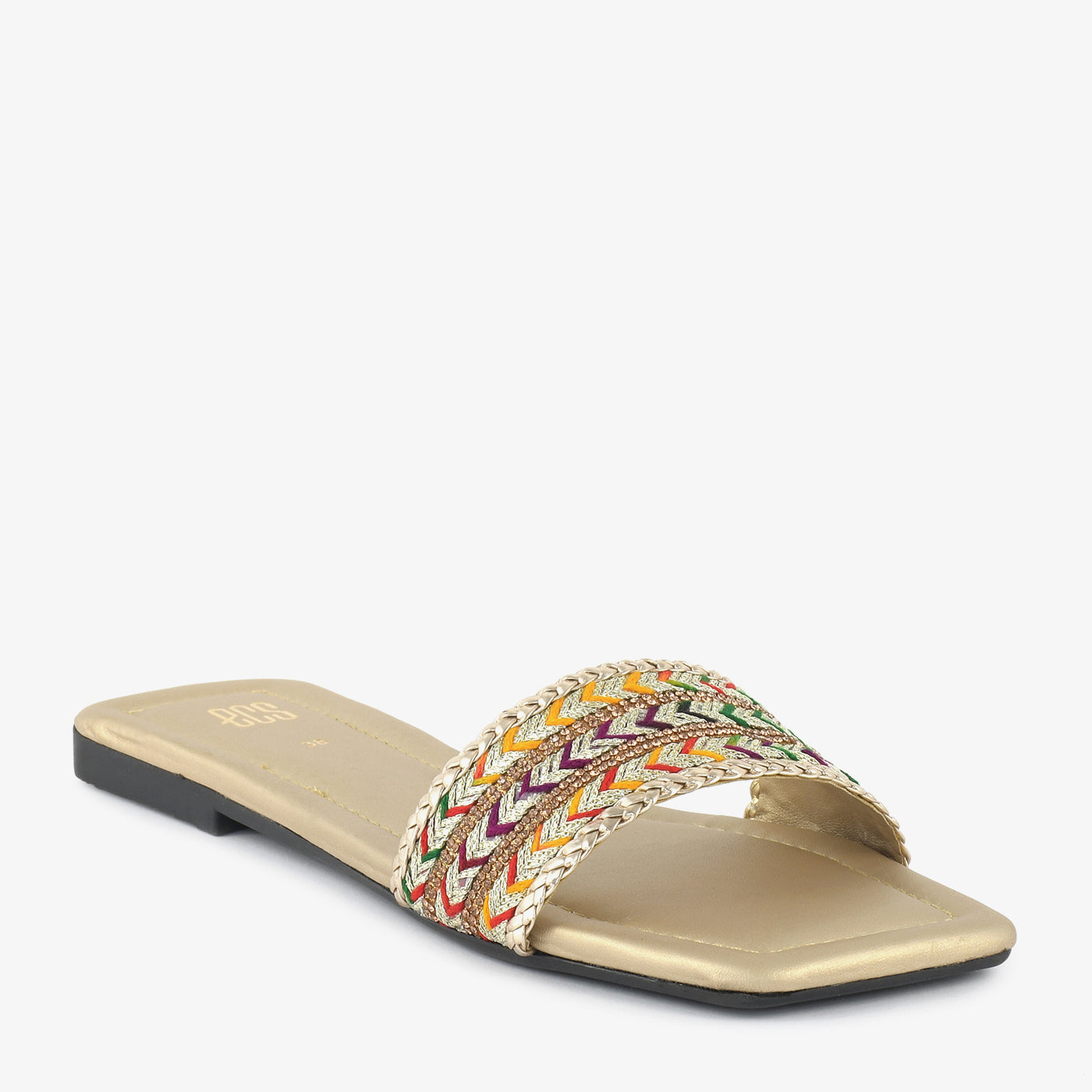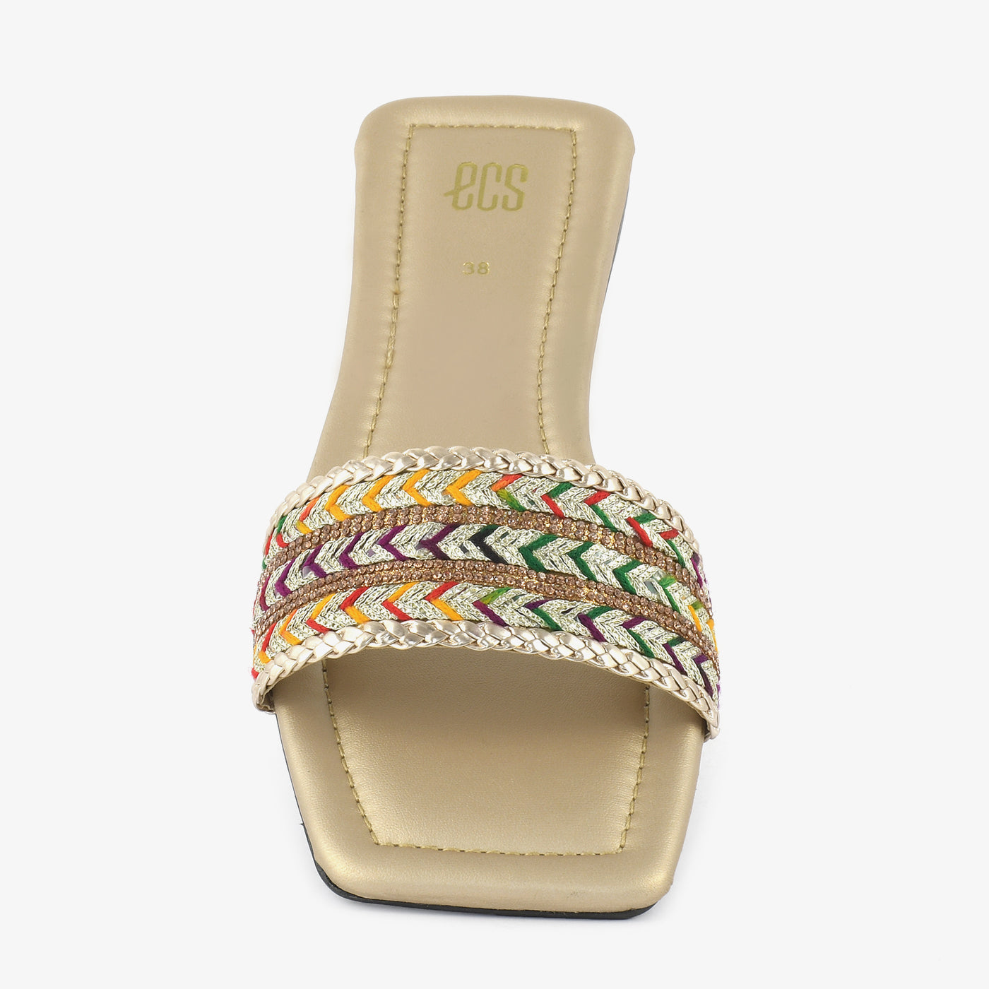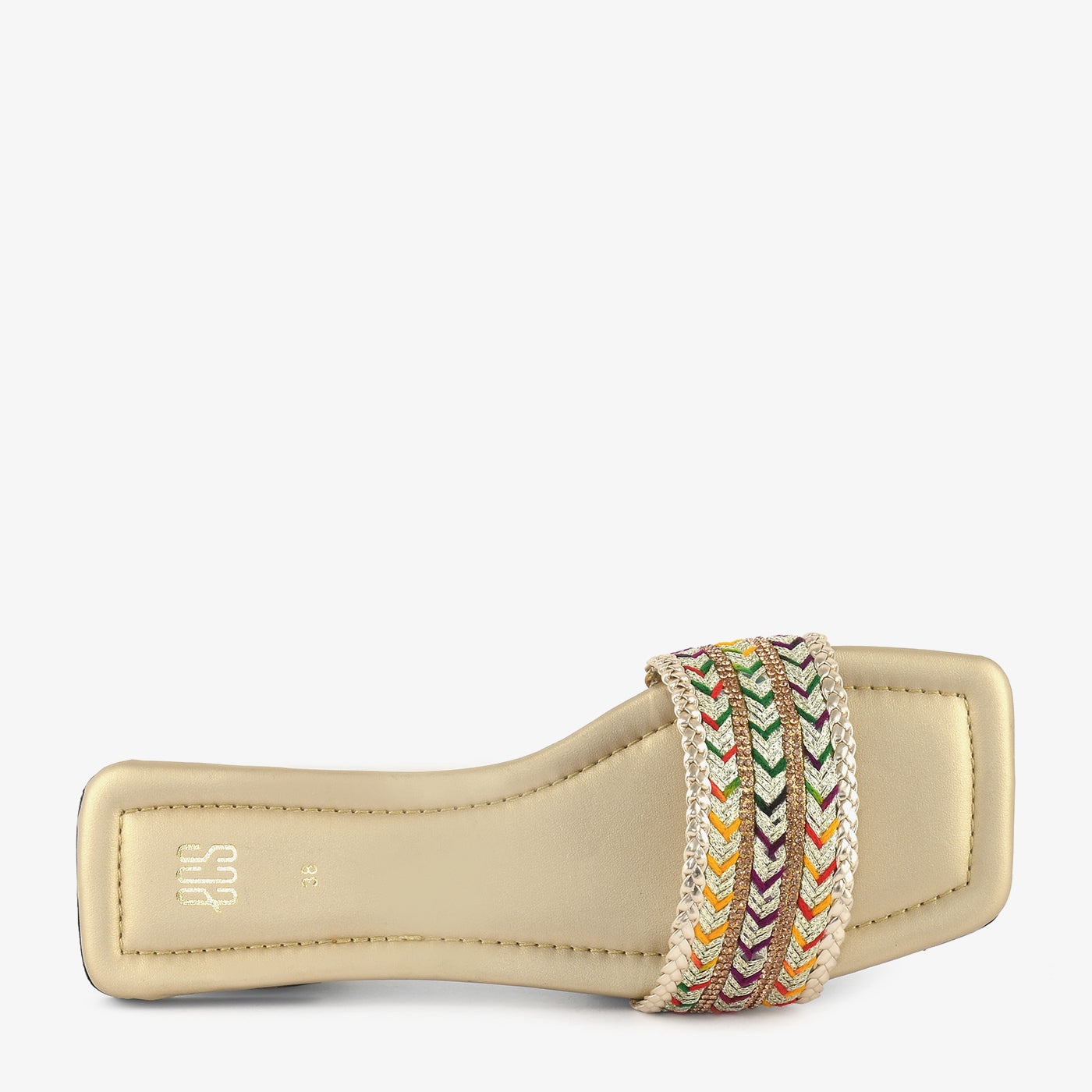 Step into cultural flair with the Ethnic Weave. These stylish tan flats feature a wide strap adorned with a vibrant, embroidered chevron pattern. The flat sole offers comfort, while the colorful detailing adds an ethnic touch to your look.