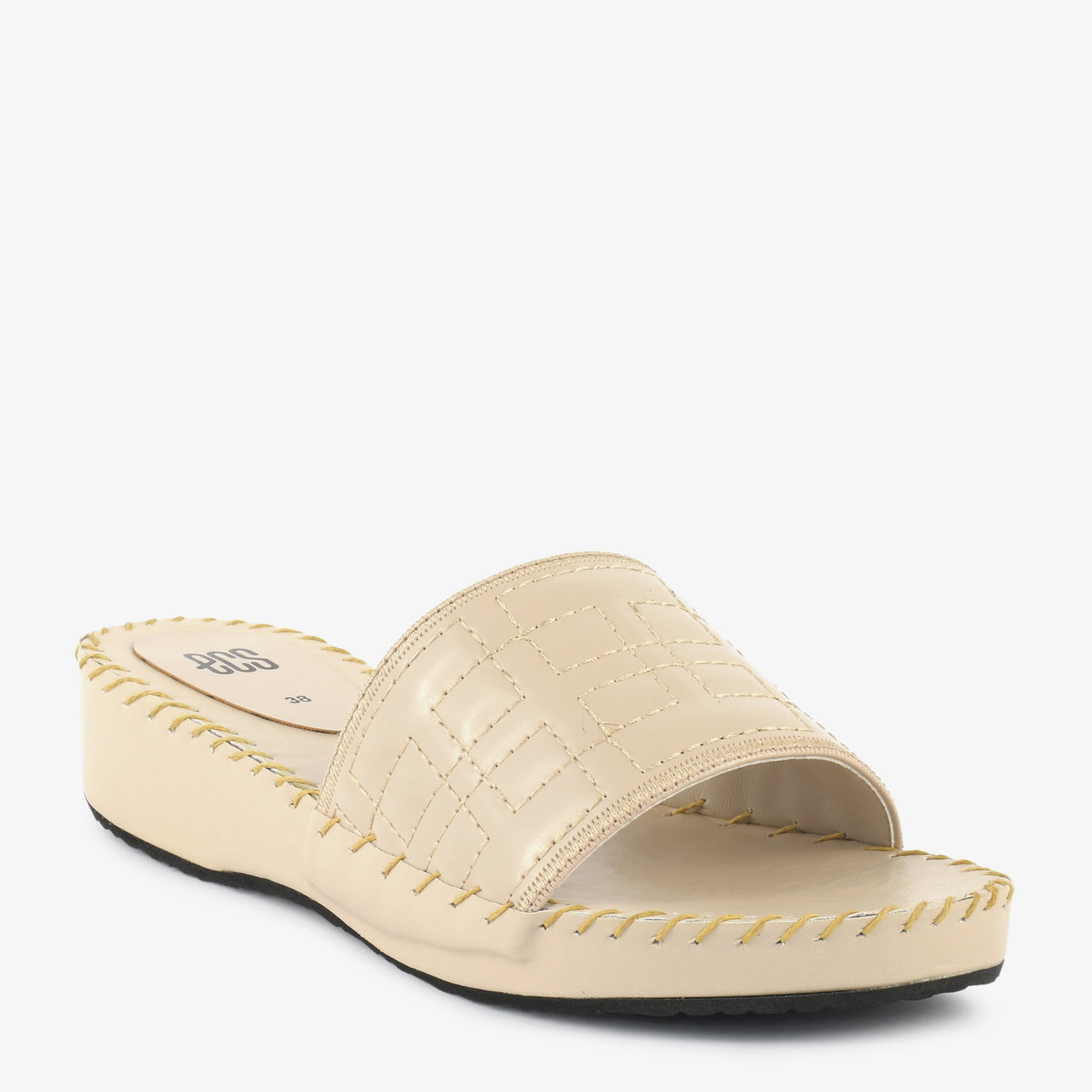 Slide into everyday ease with these stylish cream slippers. The quilted strap offers a touch of subtle texture, while the comfortable footbed and low wedge provide all-day support.