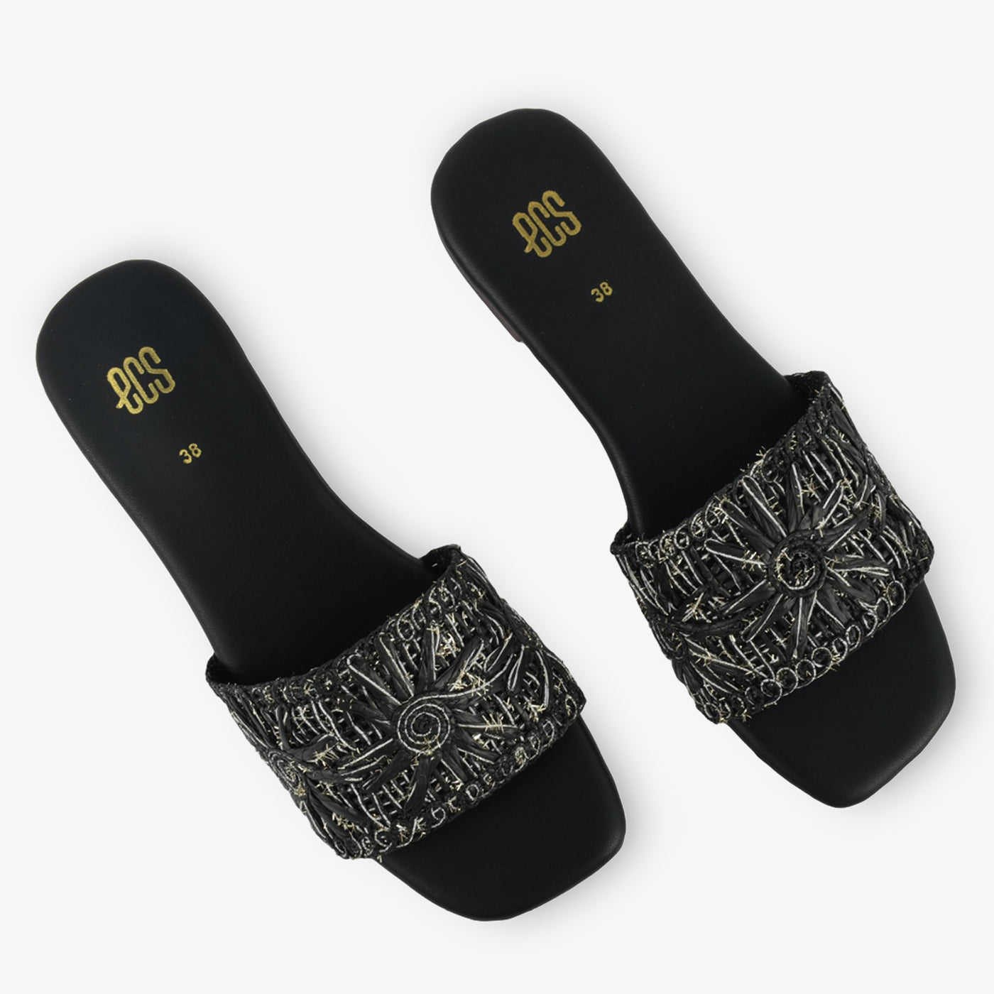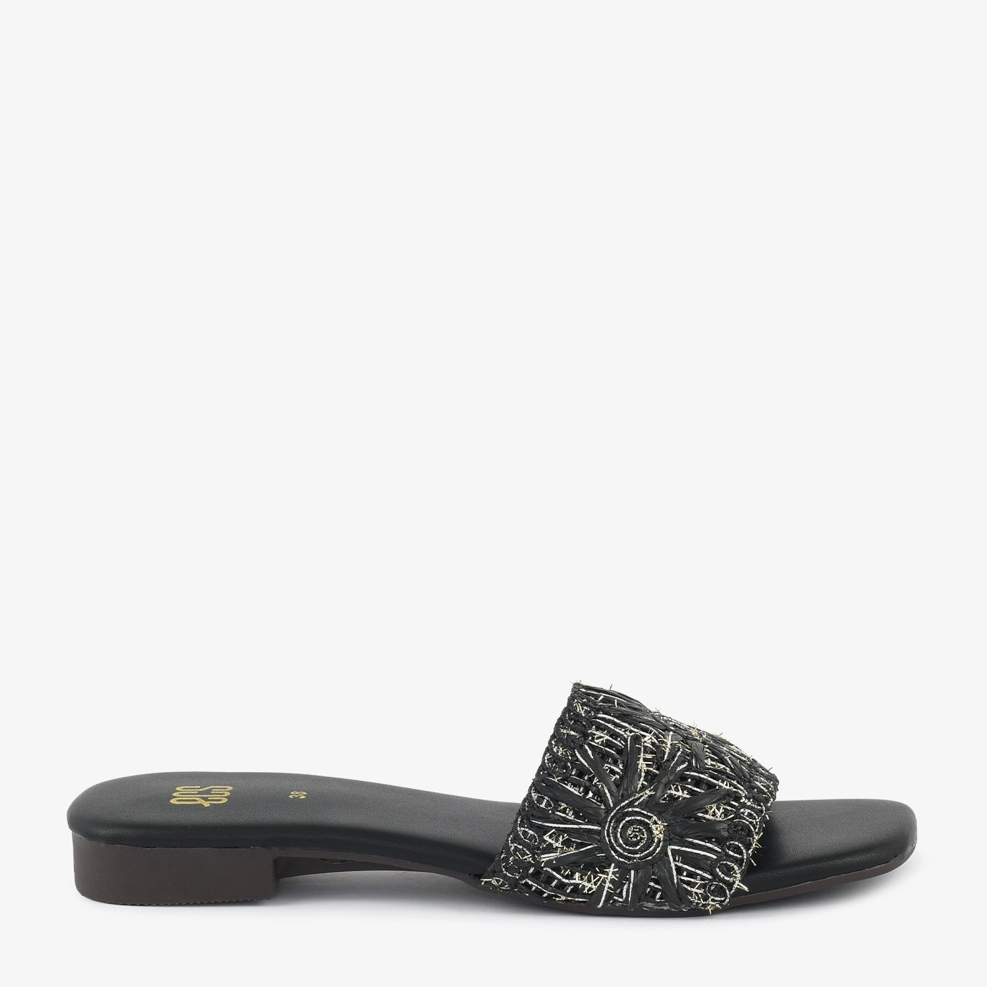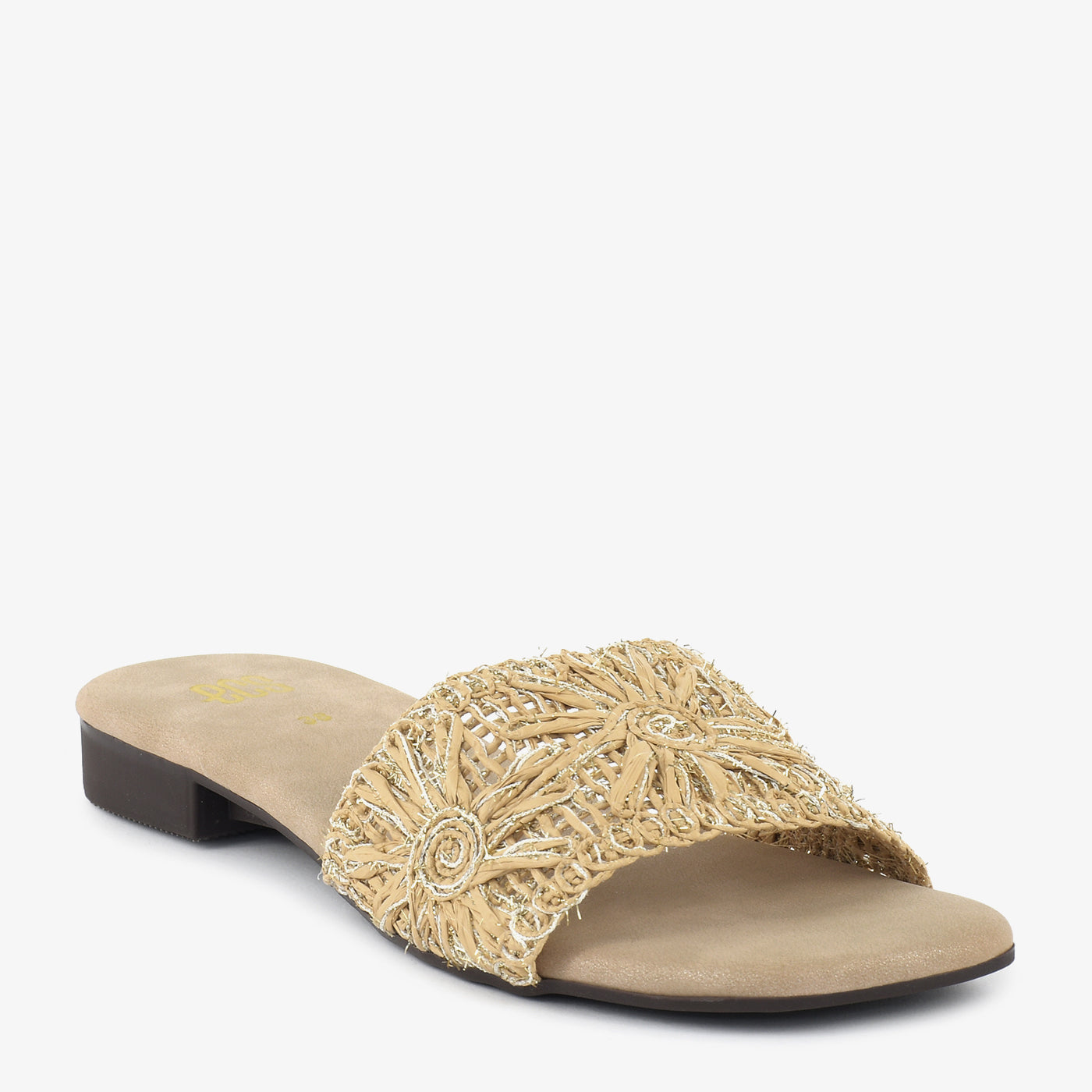 Step into textured beauty with the Floral Weave. These charming flats feature a wide strap with an intricate, floral-inspired woven design. The flat sole offers a comfortable and relaxed feel for everyday wear.
